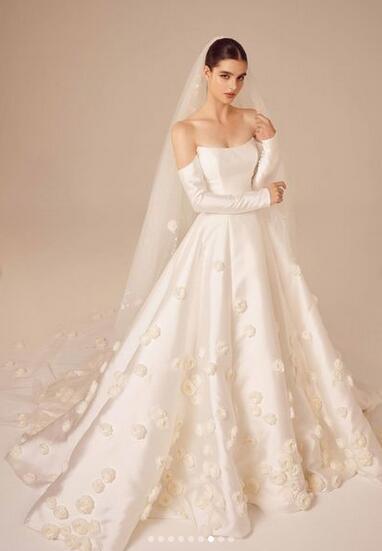 高品質!ウエディングドレス ベアトップ 取り外し袖 立体的な花レース オーダードレス ロングトレーン ハンドメイド 高級サテン Aライン 花嫁 前撮り 結婚式/前撮り/二次会
