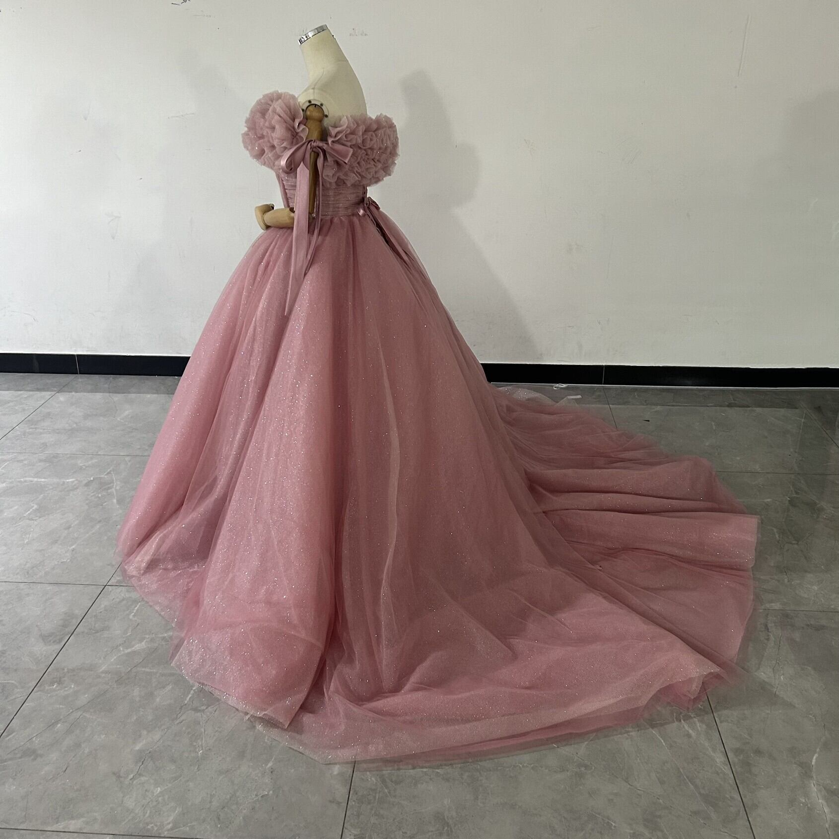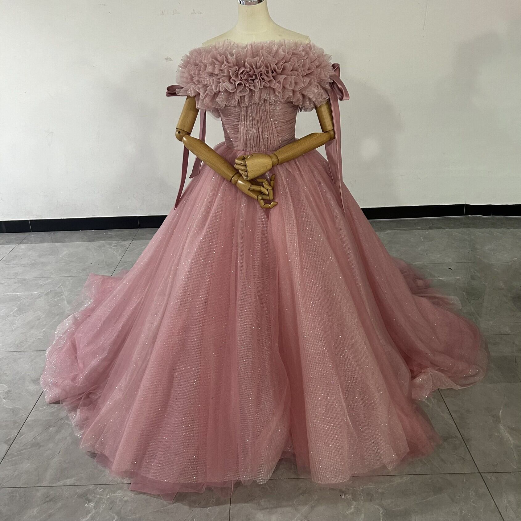 輝きな光彩を放つ ピンク紫 取り外しオフショルダー カラードレスキラキラチュール 華やかなトレーン 花嫁