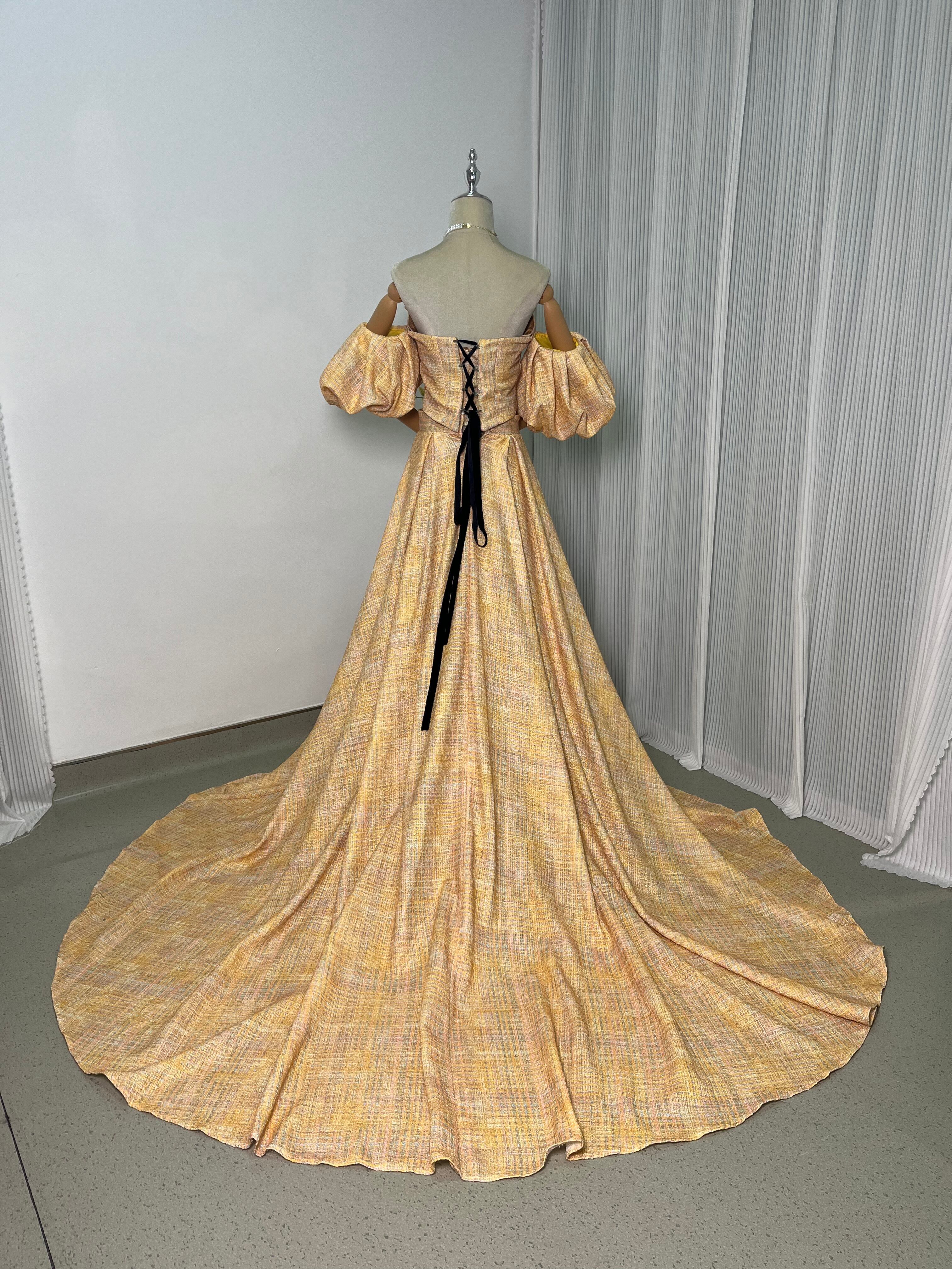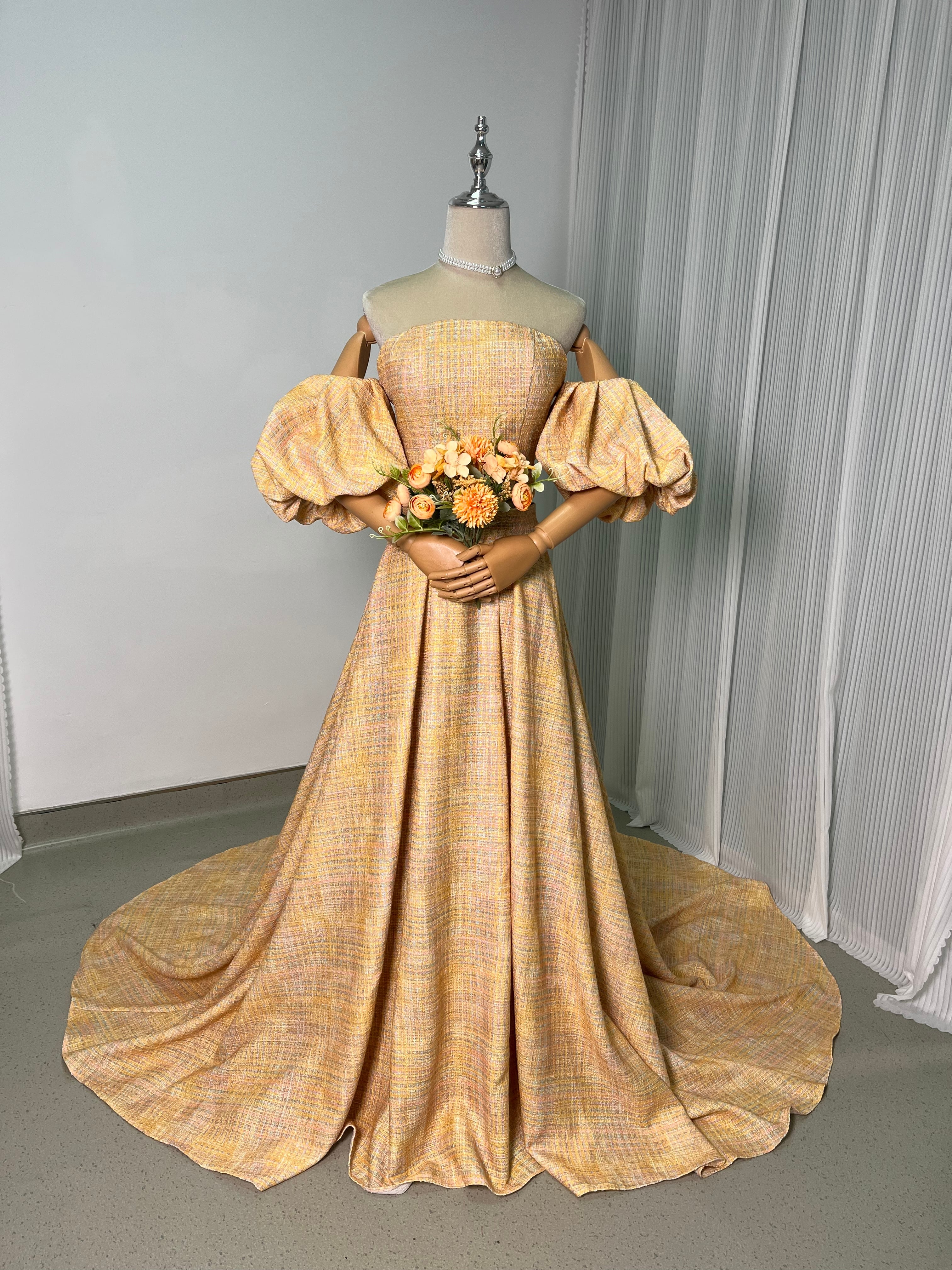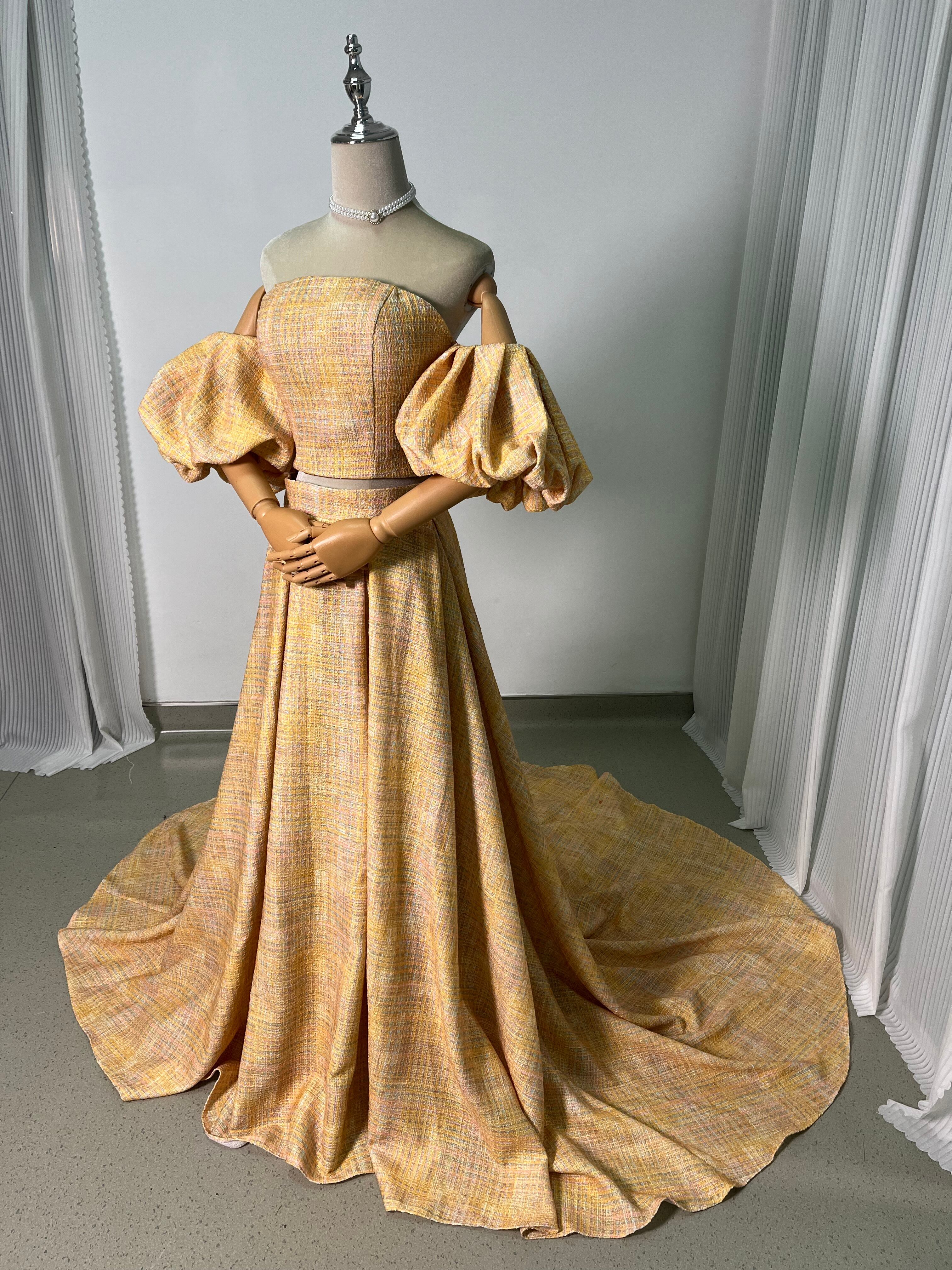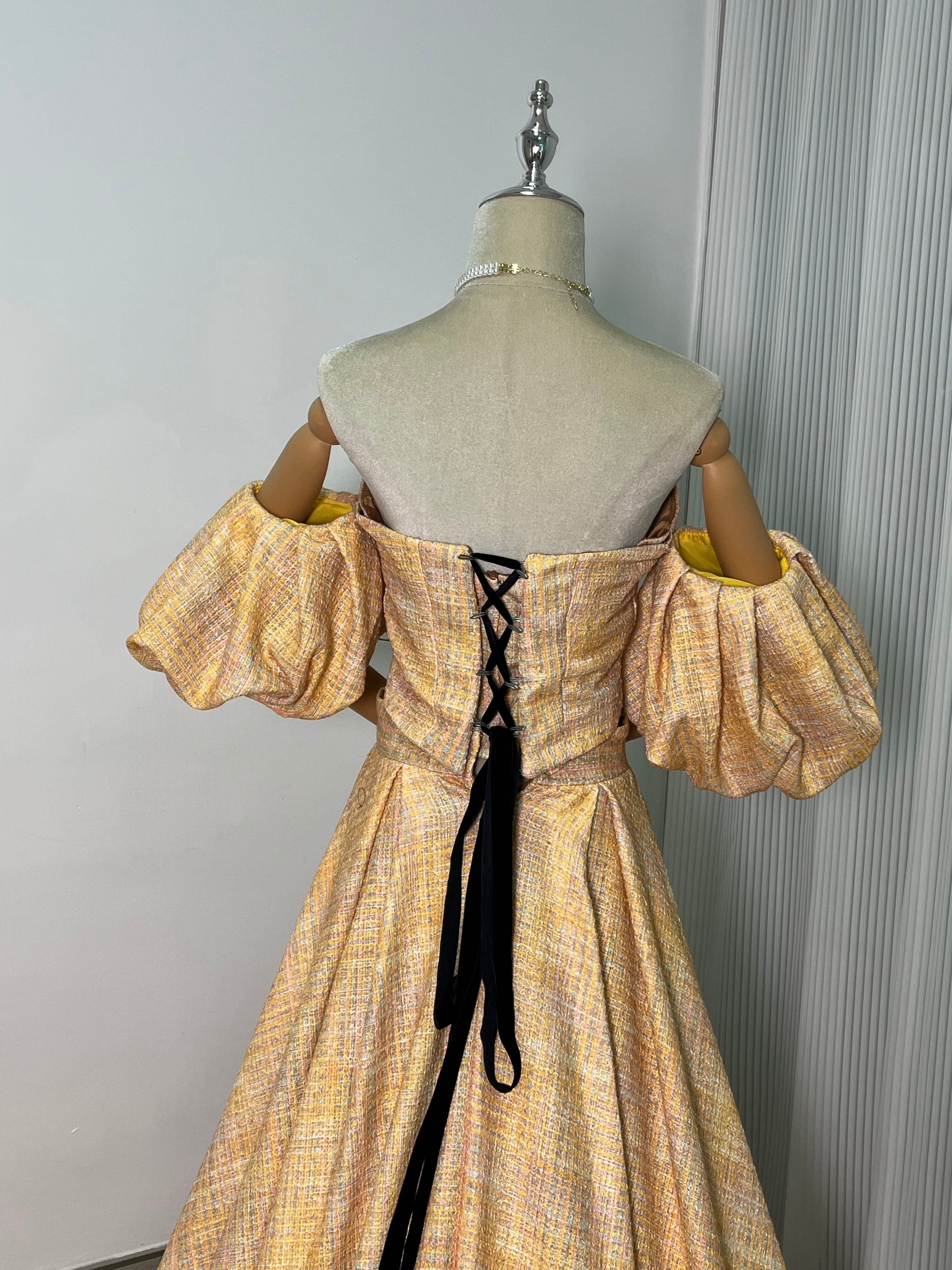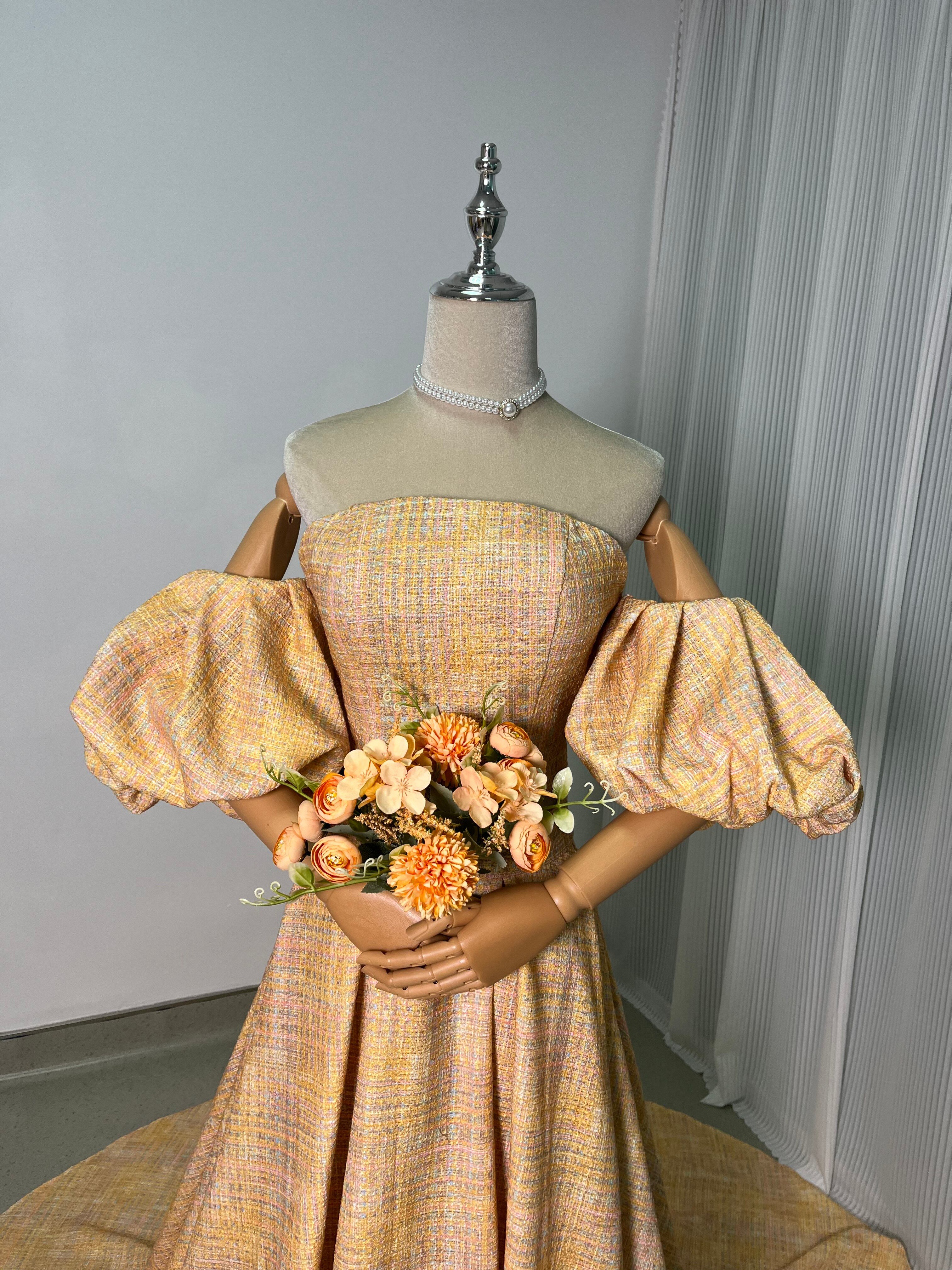 イエロー ベアトップ 取り外し袖 カラードレス ツイードドレス 二次会/前撮り結婚式/披露宴/