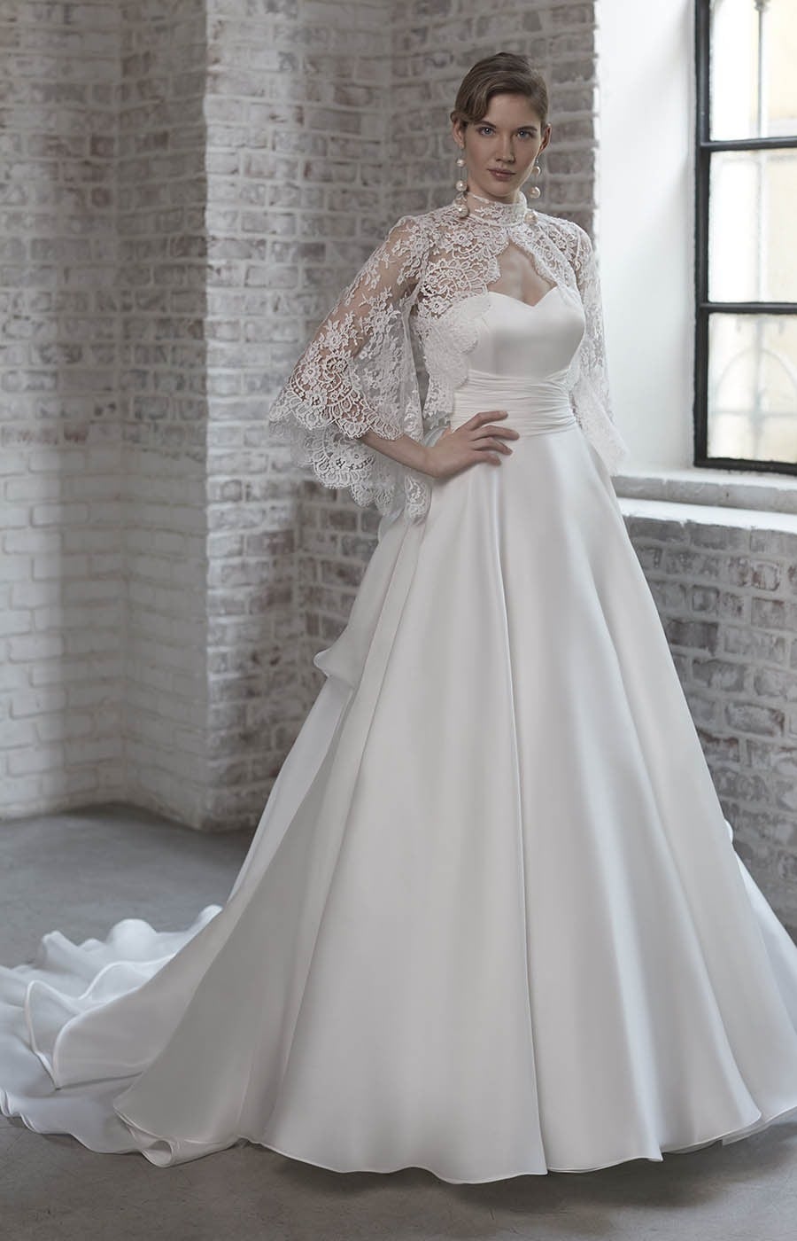 高品質!ウエディングドレス フレア袖/ラッパ袖 高級サテン ベアトップ 上品レーストップス ハイネック 派手なバックリボン 華やかなトレーン フリル オーダードレス ハンドメイド 花嫁 結婚式/前撮り/二次会 | David1021k Dress(ダヴィドレス)