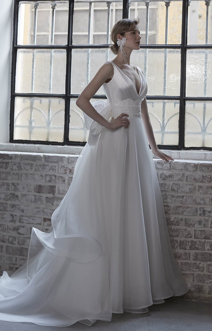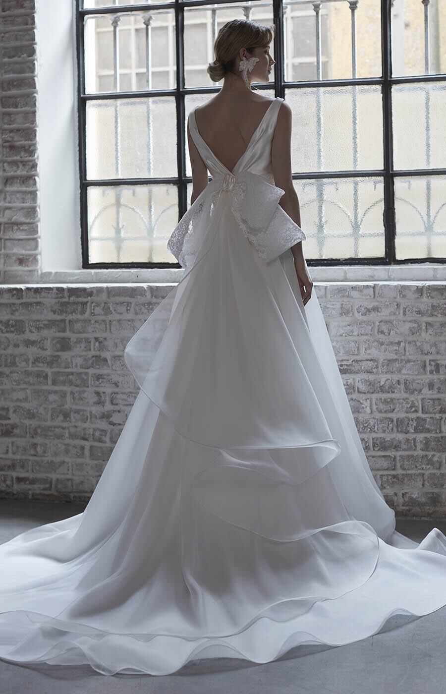 送料無料!ウエディングドレス 背中見せ/バックレス キャミソール オーダードレス Vネック ふっくら柔らかなバックリボン パーティードレス 取り外しトレーン トレーン ハンドメイド 花嫁 結婚式/前撮り/二次会 イブニングドレス 合コン | David1021k Dress(ダヴィドレス)