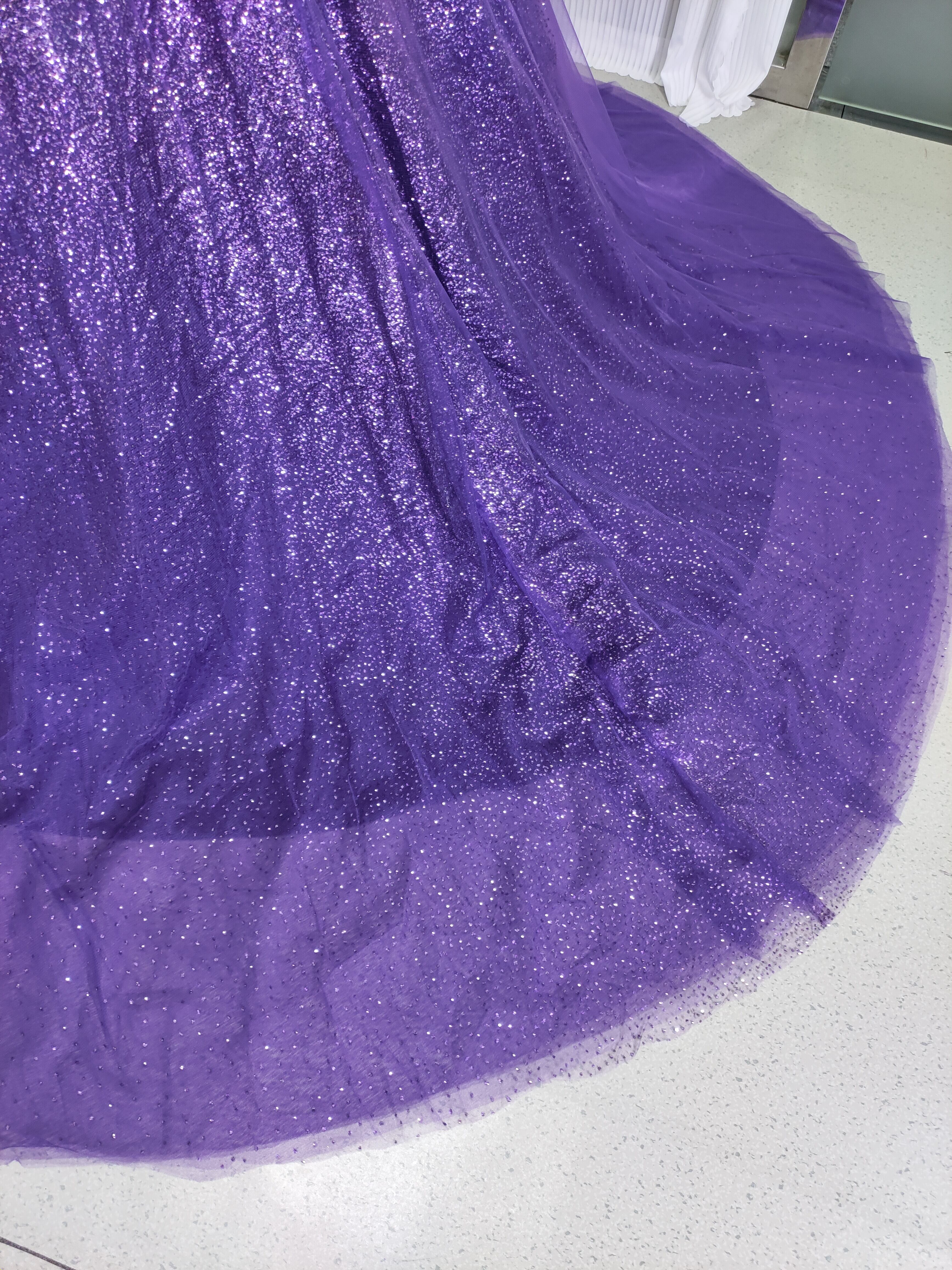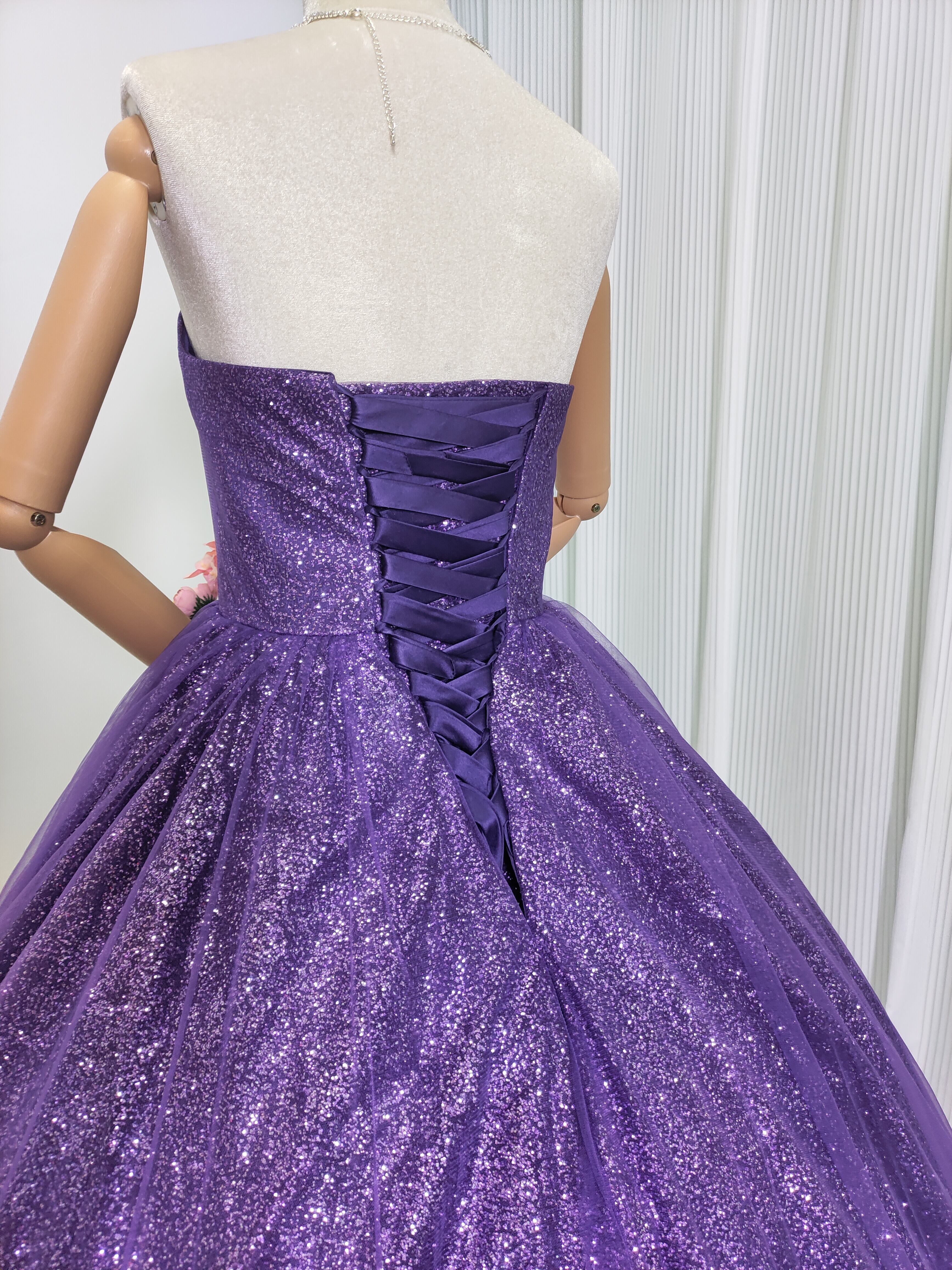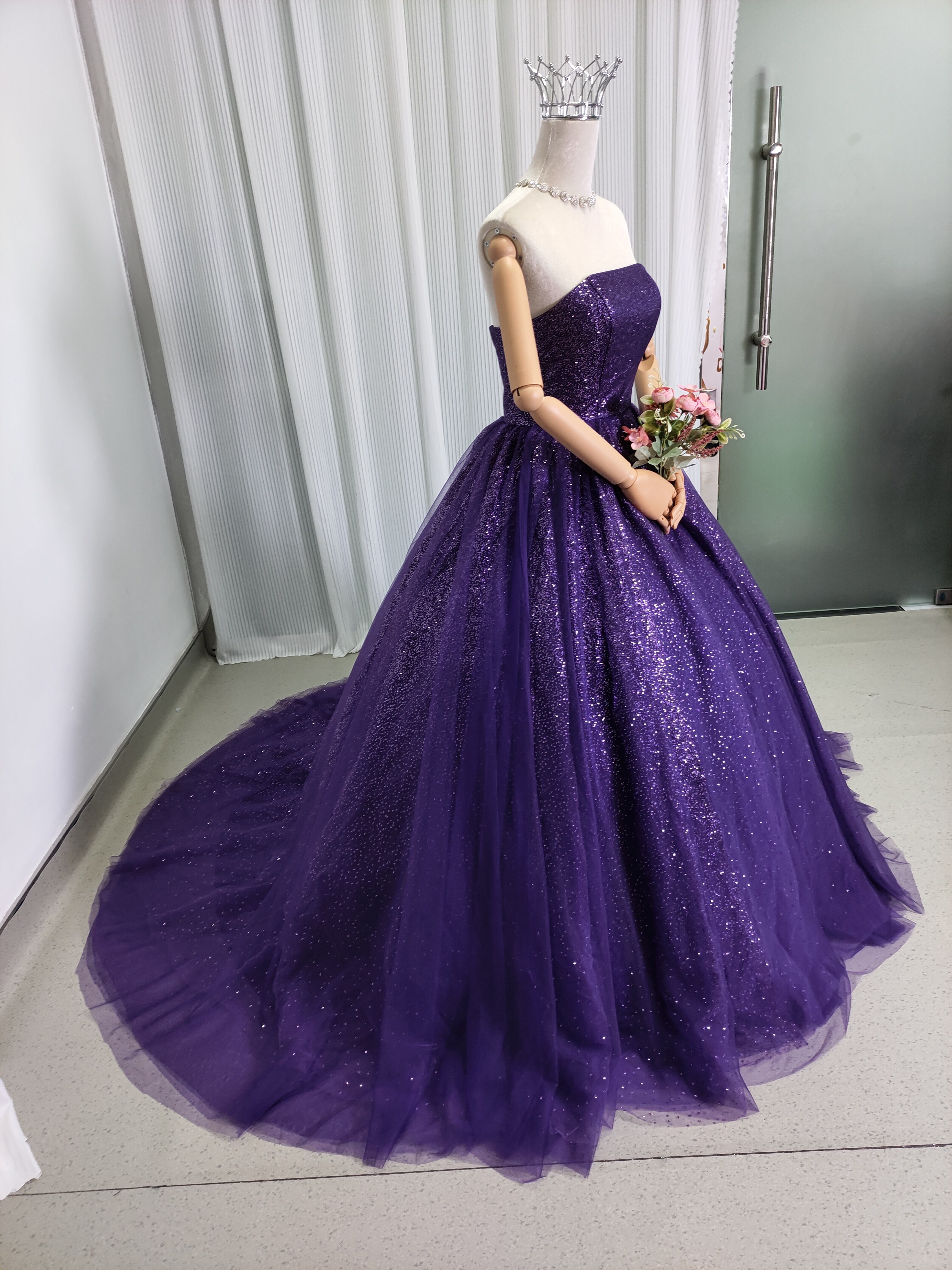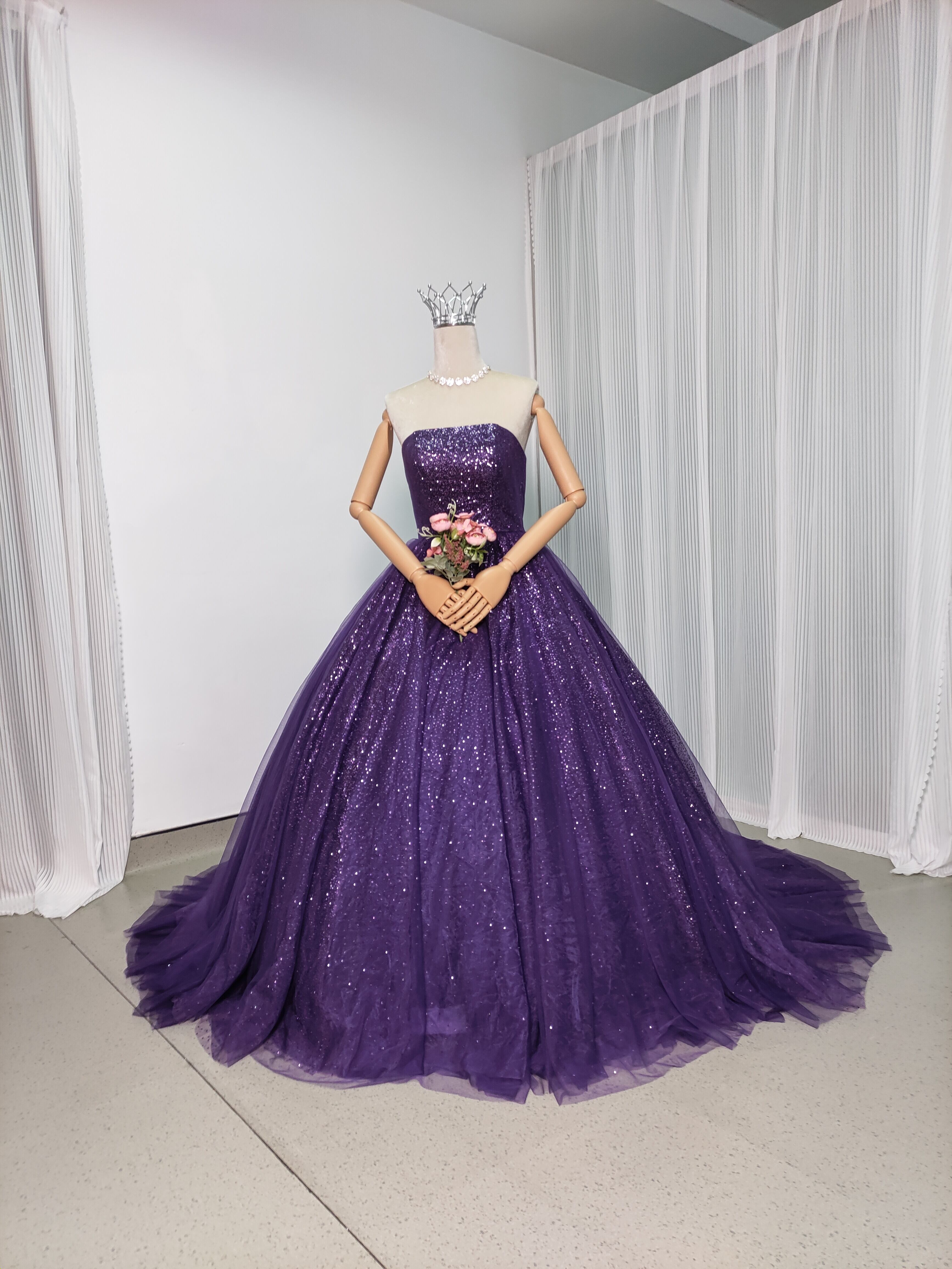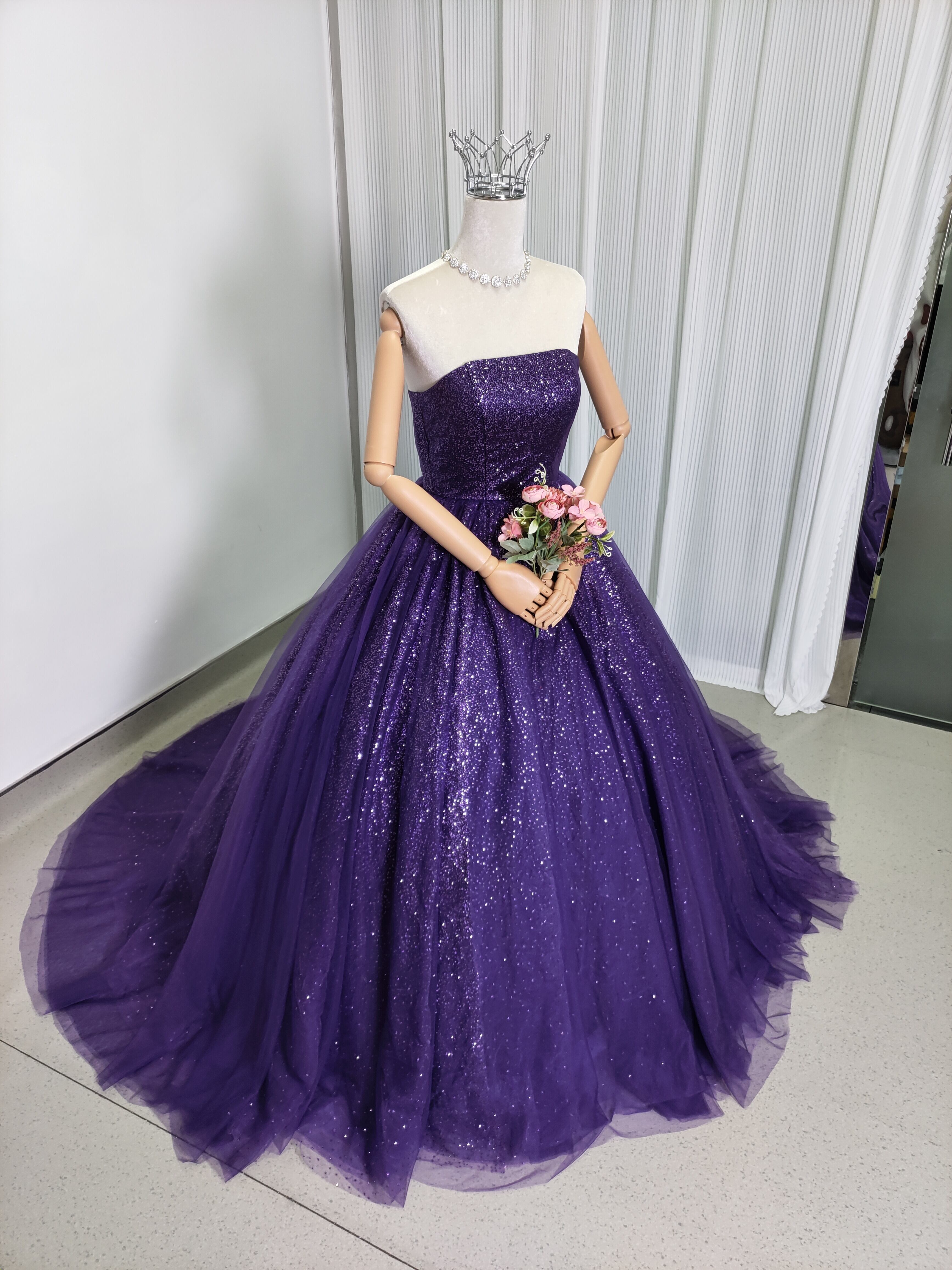 豪華!紫 ベアトップカラードレス ソフトチュール ビジュー 美品! キラキラチュール 華やかなトレーン 結婚式/披露宴/前撮り