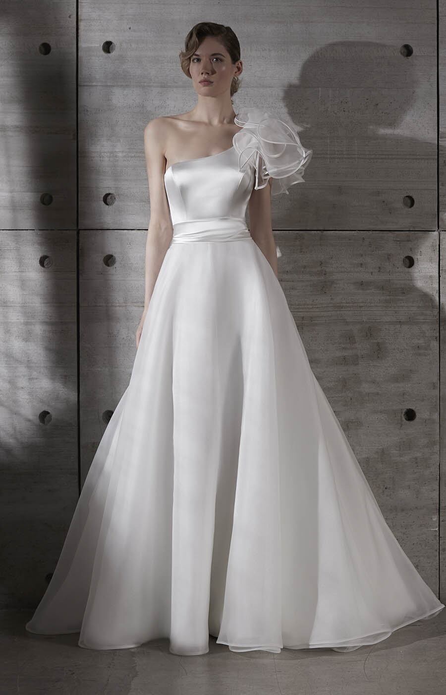 高品質!ウエディングドレス オーダードレス ワンショルダー 高級サテン ロングトレーン フリル ハンドメイド Aライン 花嫁 結婚式/前撮り/二次会 | David1021k Dress(ダヴィドレス)