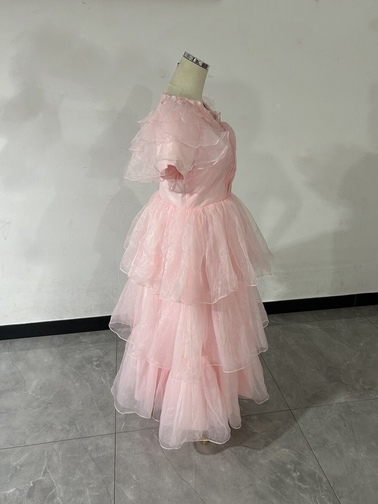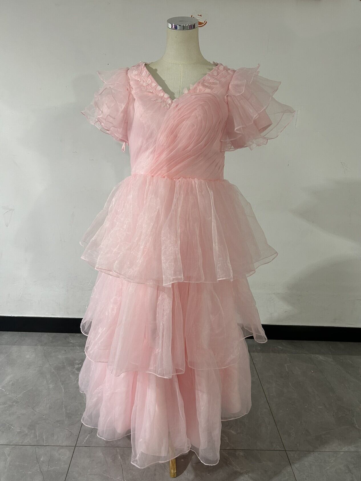 抜群のおしゃれ見え上質オーガンジー ピンク カラードレス Vネック 柔らかく重ねたチュールスカート