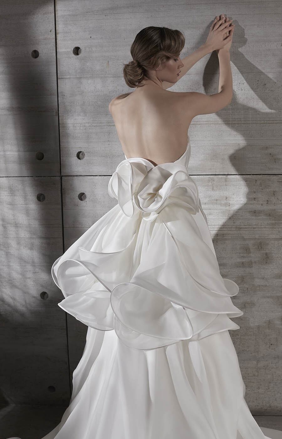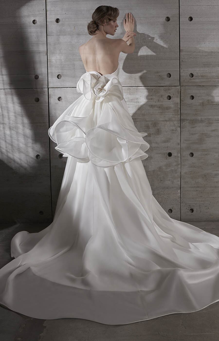 高品質!ウエディングドレス 高級サテン 華やかなトレーン オーダードレス 背中見せ/バックレス ベアトップ ロングトレーン ふっくら柔らかなバックリボン ハンドメイド Aライン フリル 花嫁 結婚式/前撮り/二次会 | David1021k Dress(ダヴィドレス)