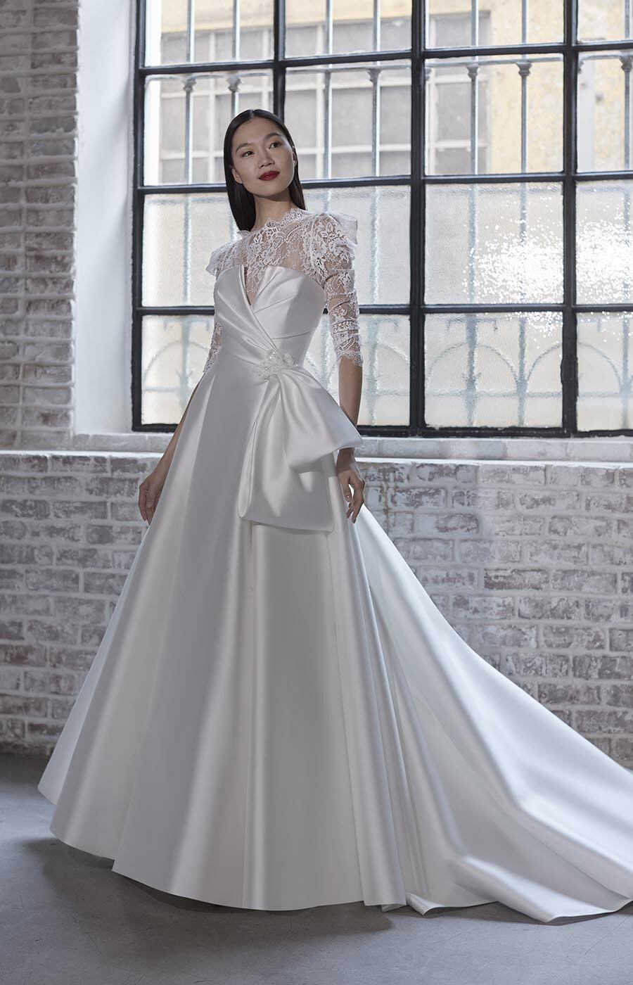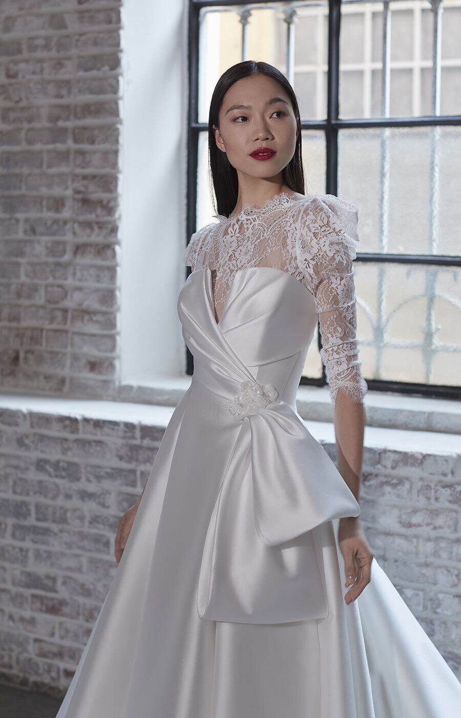 高品質!ウエディングドレス 取り外しリボン 華やかなトレーン オーダードレス ベアトップ Vネック 上品レースボレロ 七分袖丈 ロングトレーン ハンドメイド Aライン 高級サテン セクシー 花嫁 結婚式/前撮り/二次会 | David1021k Dress(ダヴィドレス)