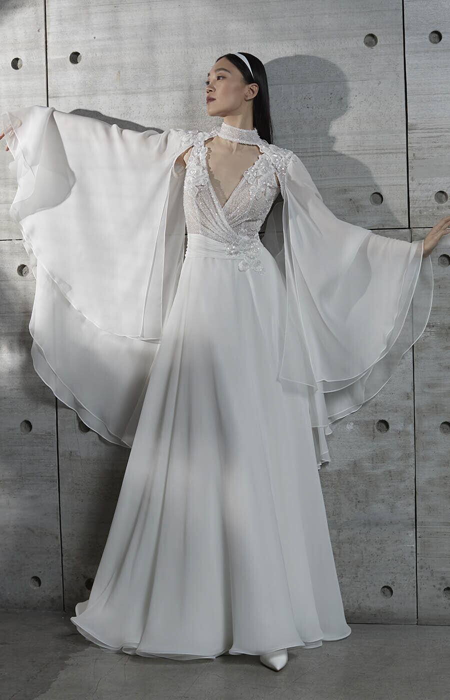 送料無料!ウエディングドレス Vネック Aライン キャミソール ロング ソフトチュール ノースリーブ トレーン キラキラレース マント オーダードレス ハンドメイド 花嫁 結婚式/前撮り/二次会 | David1021k Dress(ダヴィドレス)