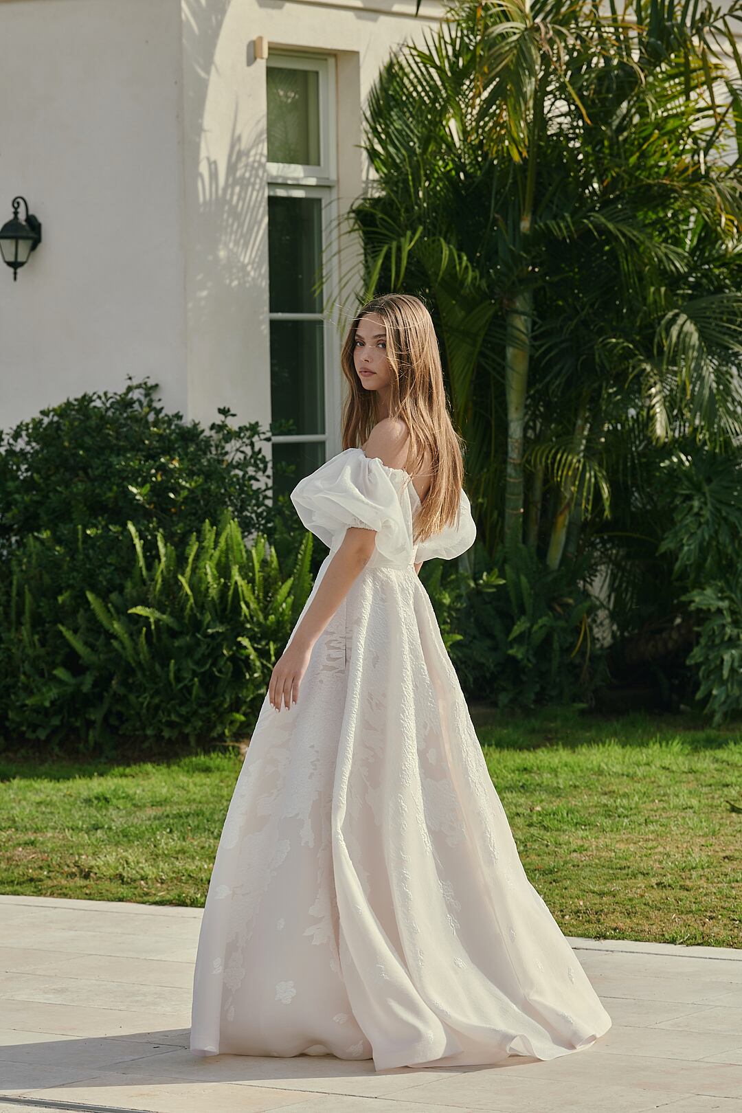 送料無料!ウエディングドレス Aライン 色変更可能 オフショルダー パフスリーブ パーティードレス 背中見せ/バックレス トレーン/ロング(ご指定自由) オーダードレス ハンドメイド 花嫁 結婚式/前撮り/二次会 | David1021k Dress(ダヴィドレス)
