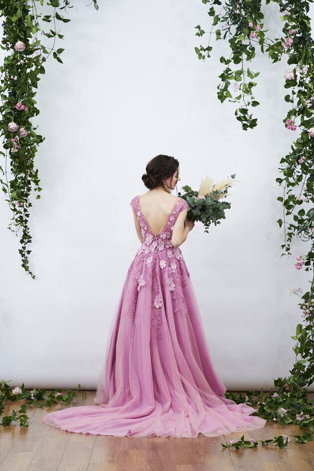 送料無料!カラードレス ピンク ノースリーブ 背中見せ/バックレス 花柄のモチーフ刺繍が美しく 上品レース トレーン オーダードレス 3D立体レース刺繍 ソフトチュール Vネック ハンドメイド 花嫁 結婚式/前撮り/二次会 セレモニー 夜会服 イブニングドレス 合コン パーティドレス ブライズメイド 旅行 ミディアムドレス 演奏ドレス 誕生日プレゼント | David1021k Dress(ダヴィドレス)