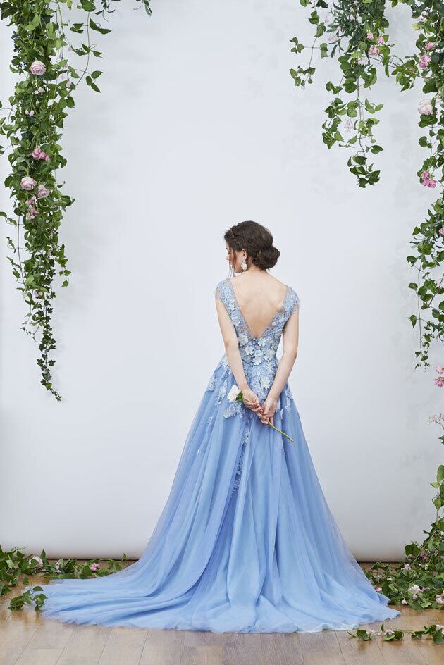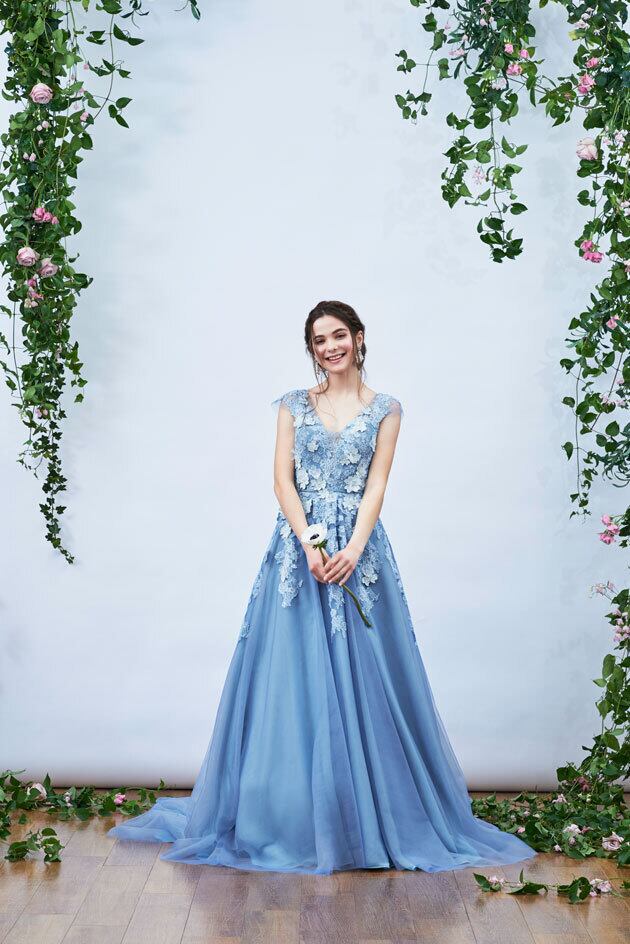 送料無料!カラードレス 爽やかで優しいブルー 青 ノースリーブ 上品レース 3D立体レース刺繍 Vネック セレモニー 合コン パーティドレス ブライズメイド | David1021k Dress(ダヴィドレス)