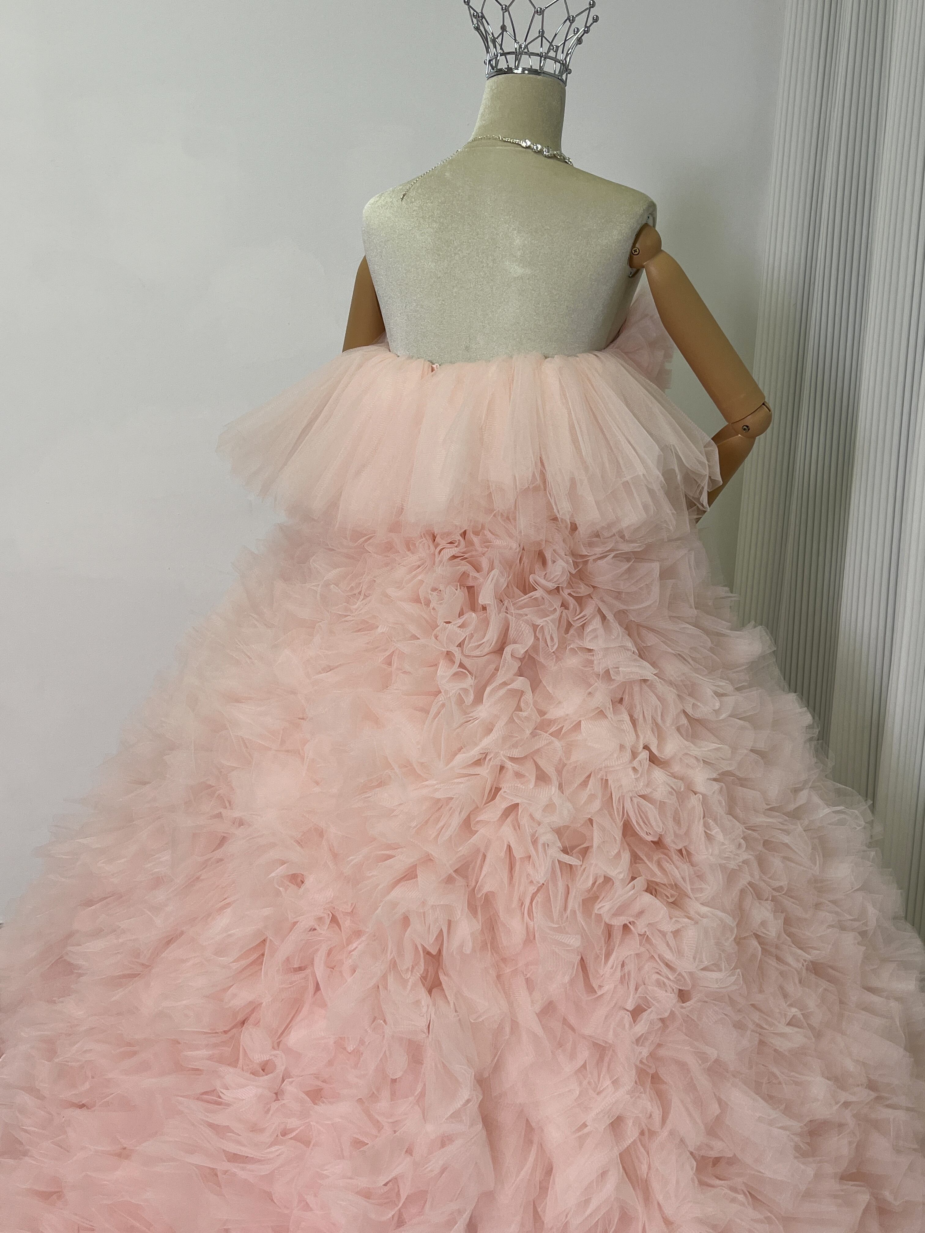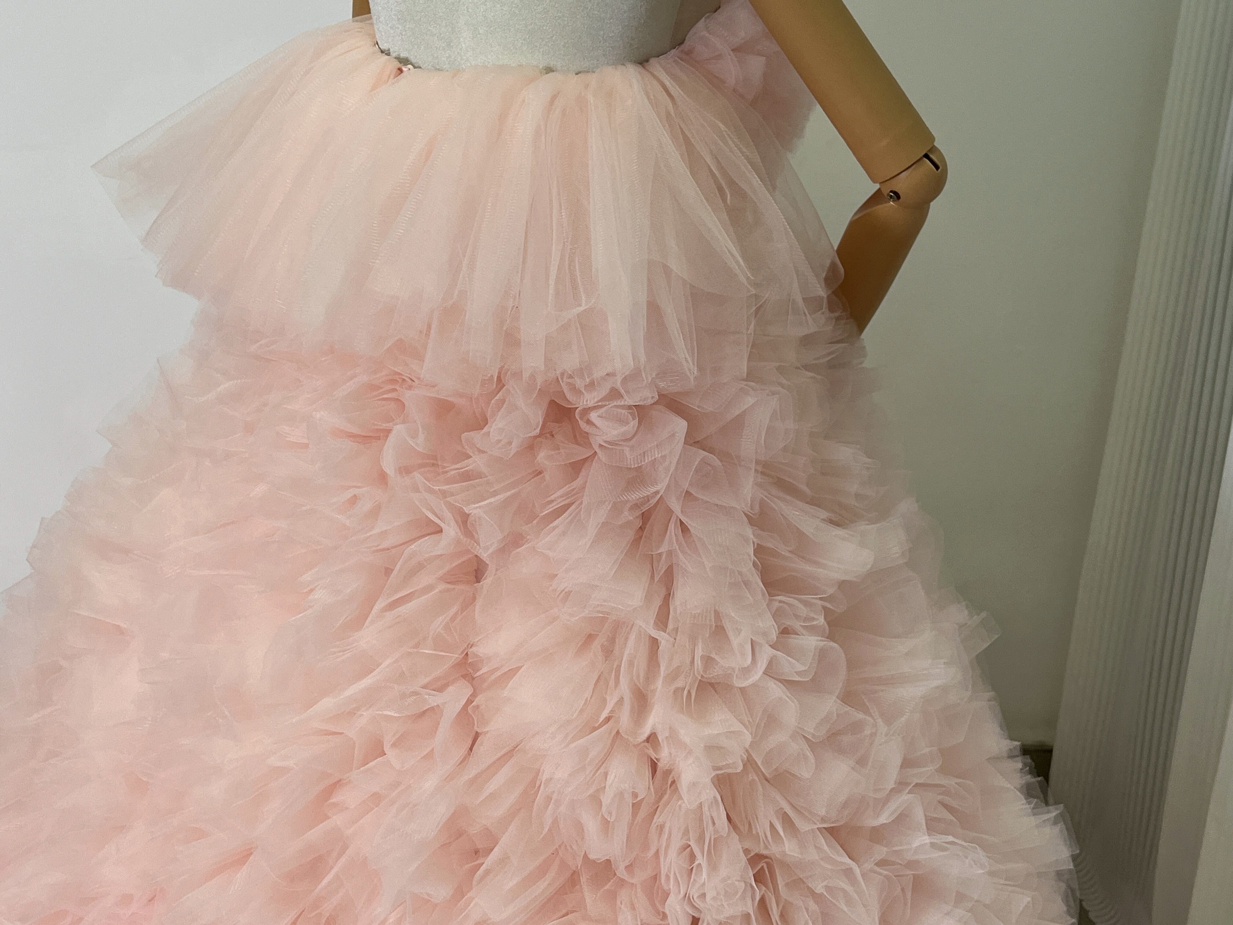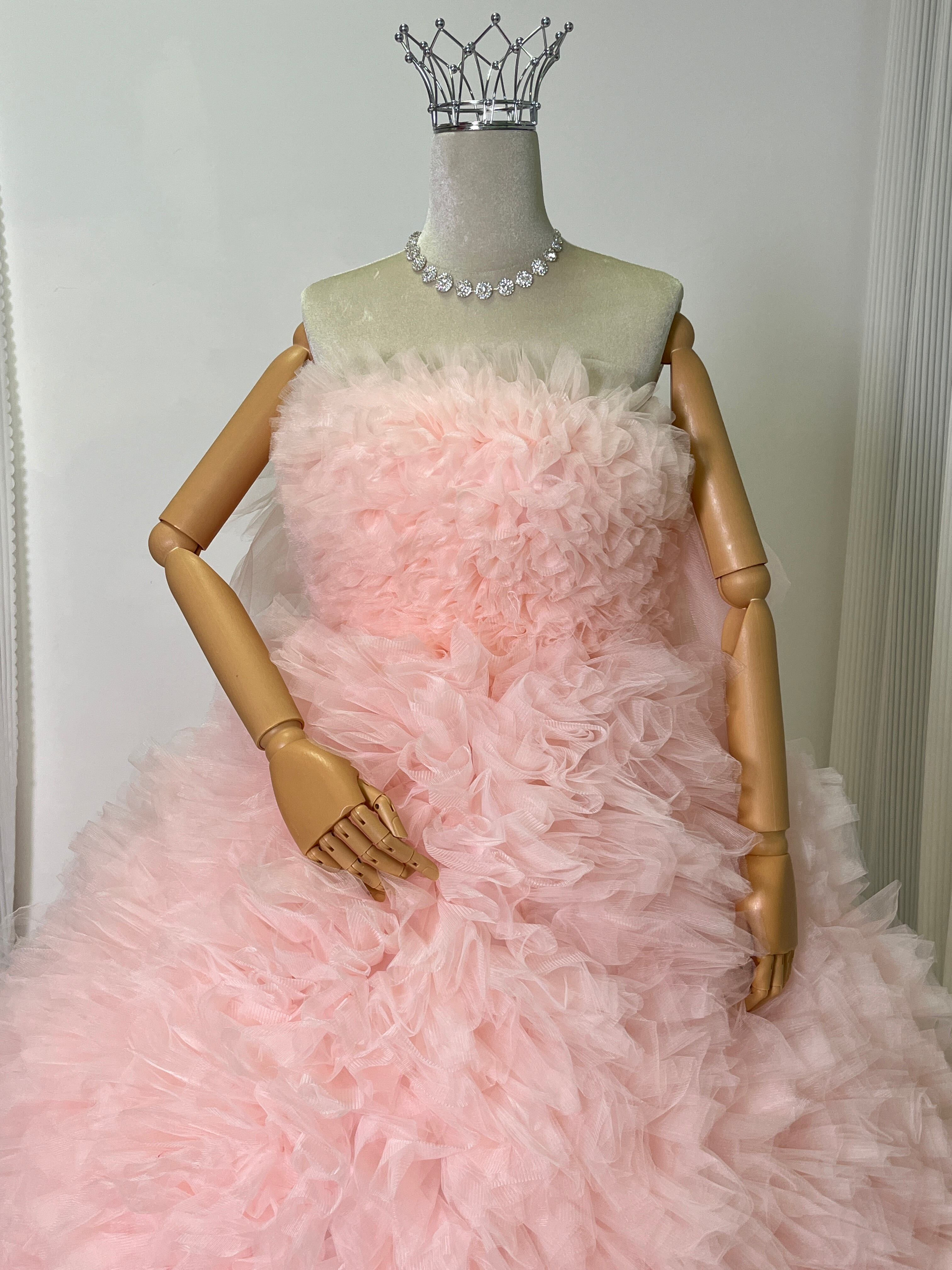 抜群のおしゃれ見え ピンク ベアトップ カラードレス 柔らかく重ねたチュールスカート前撮り/花嫁/結婚式
