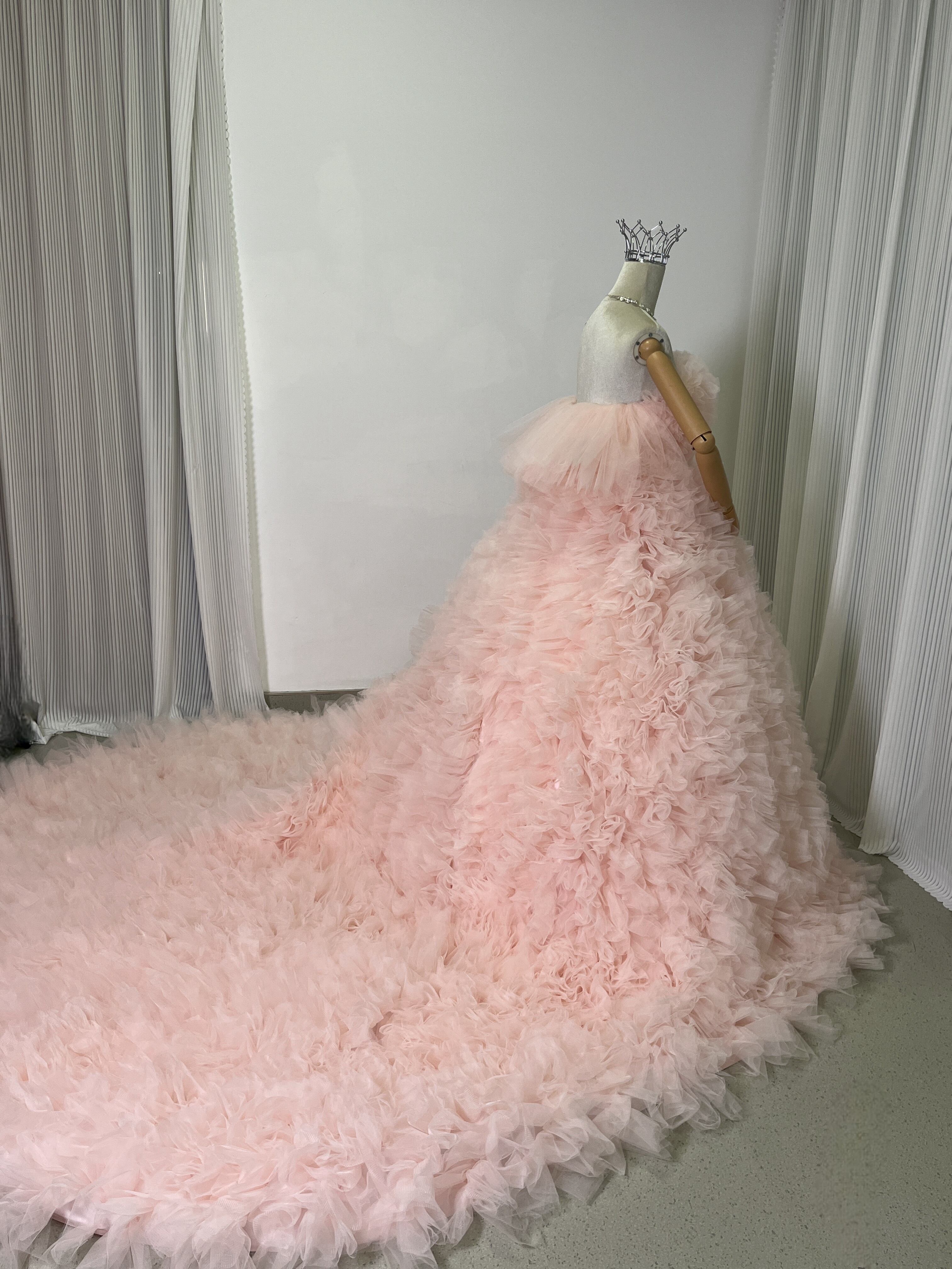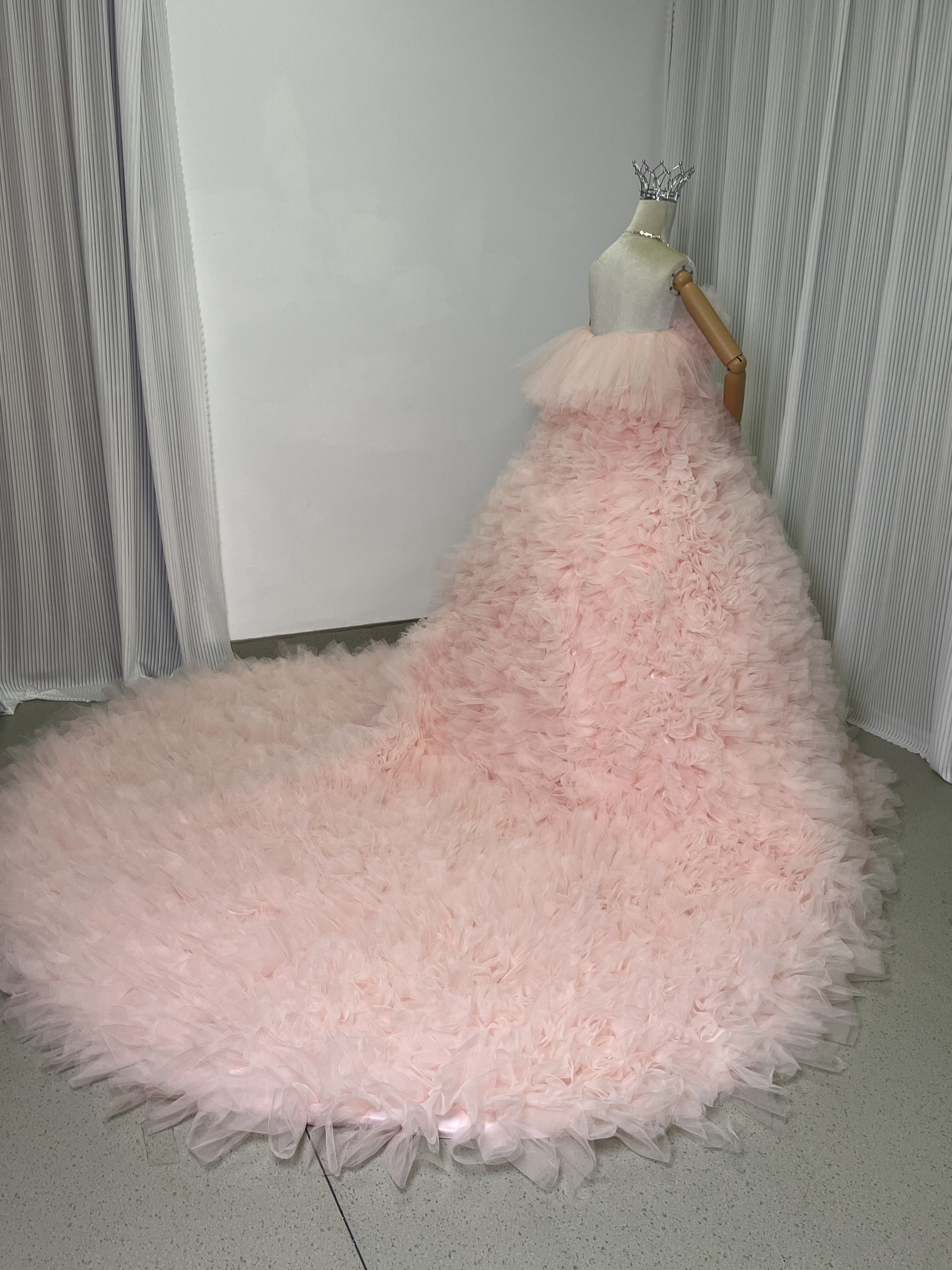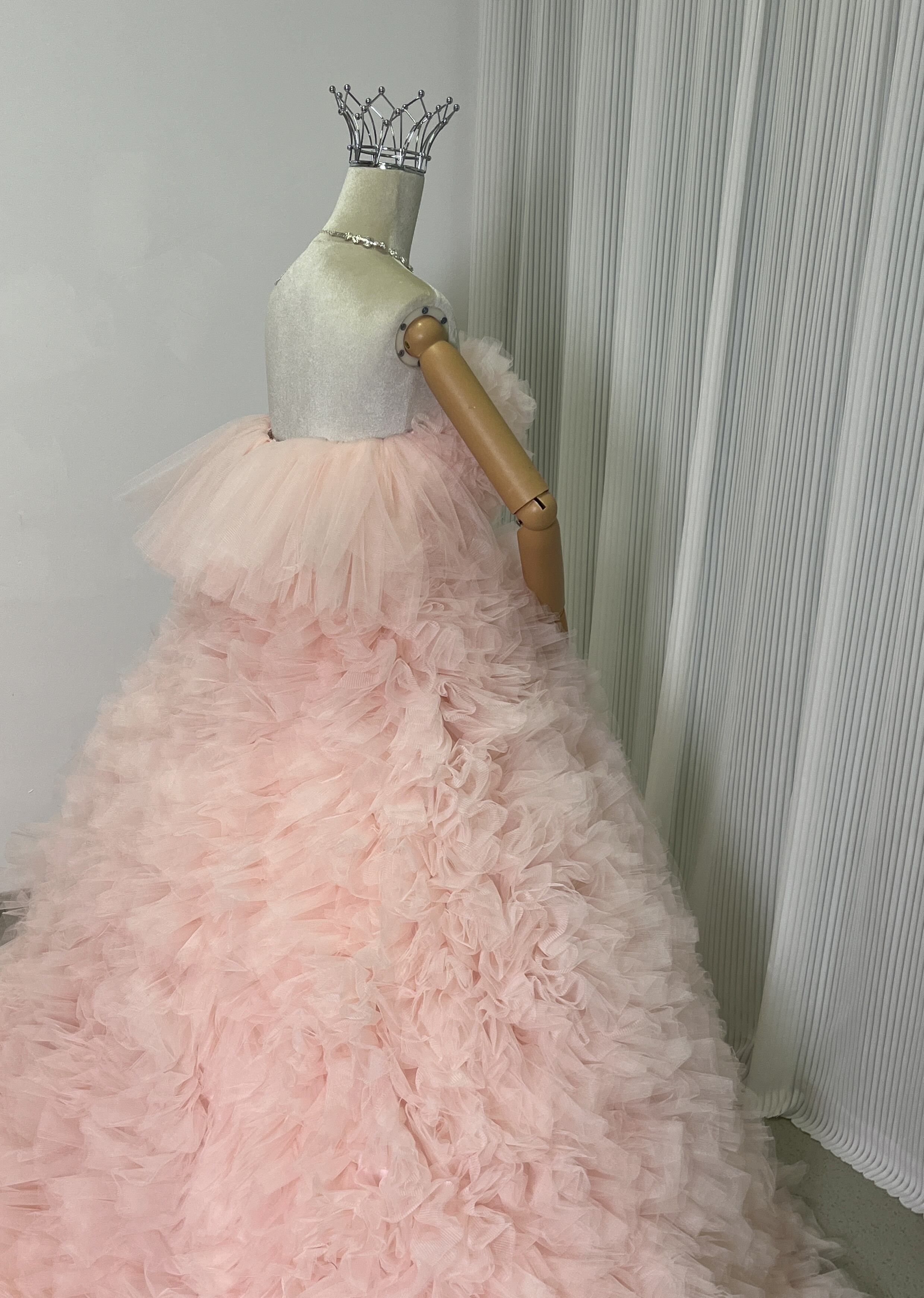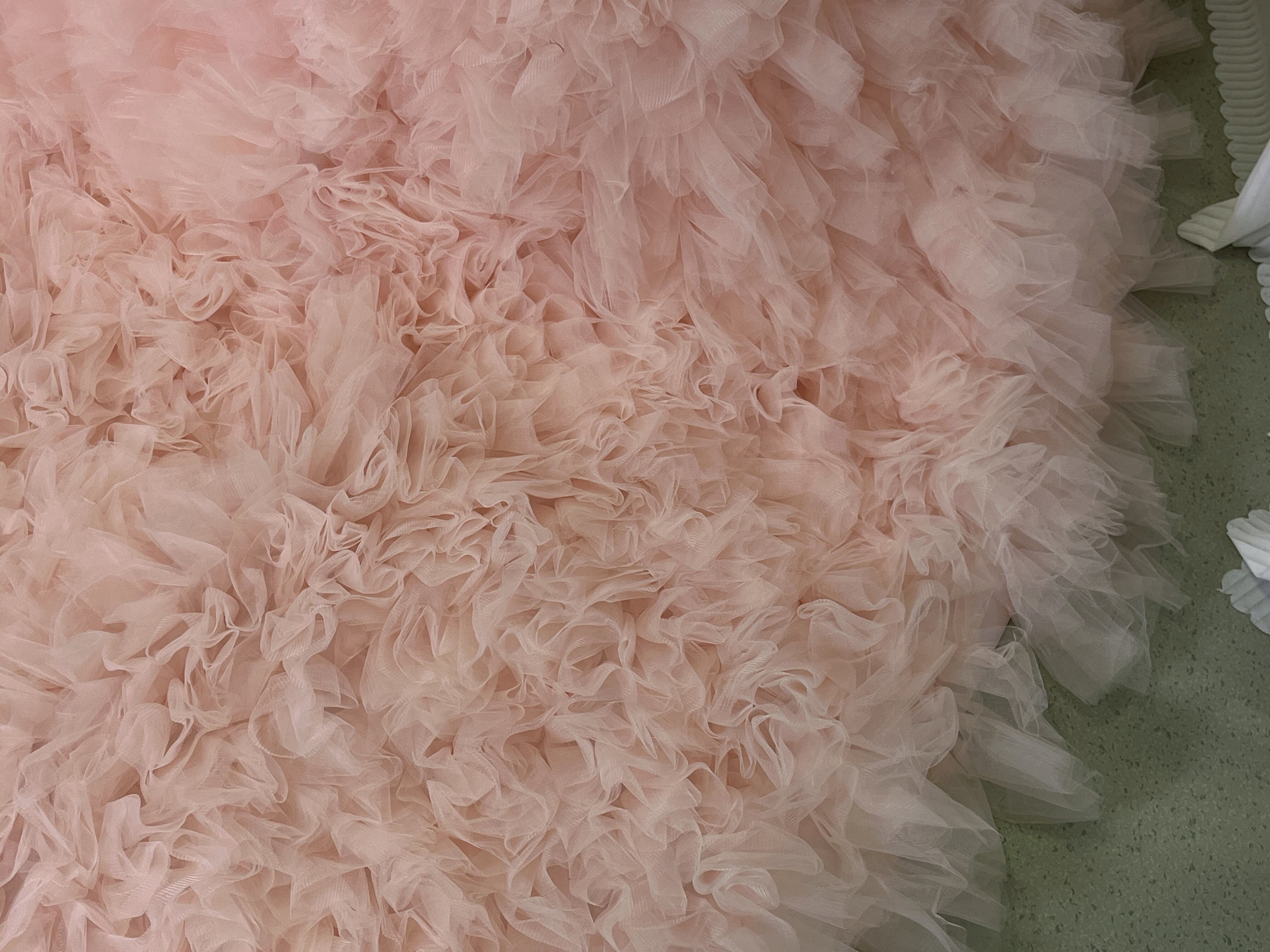 抜群のおしゃれ見え ピンク ベアトップ カラードレス 柔らかく重ねたチュールスカート前撮り/花嫁/結婚式