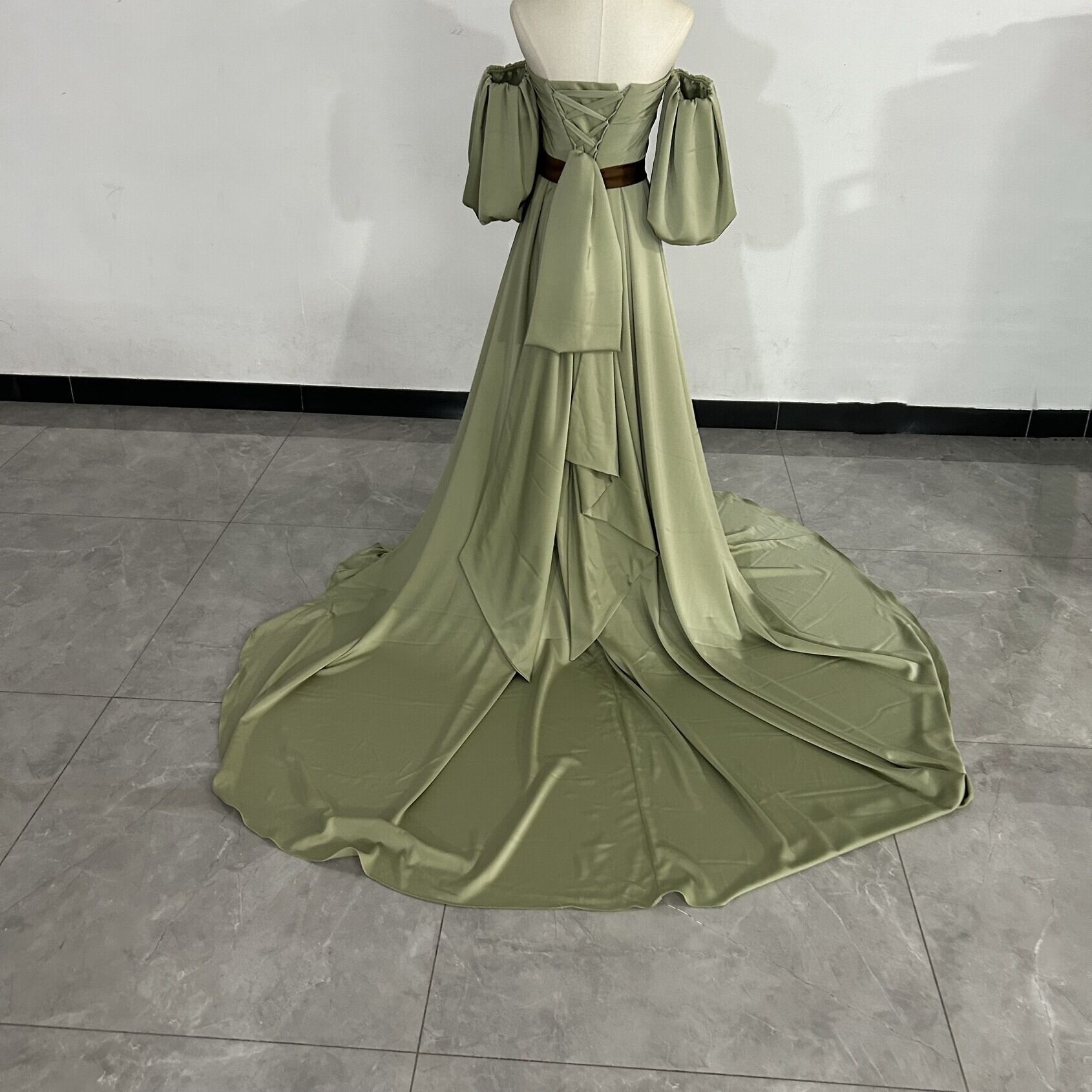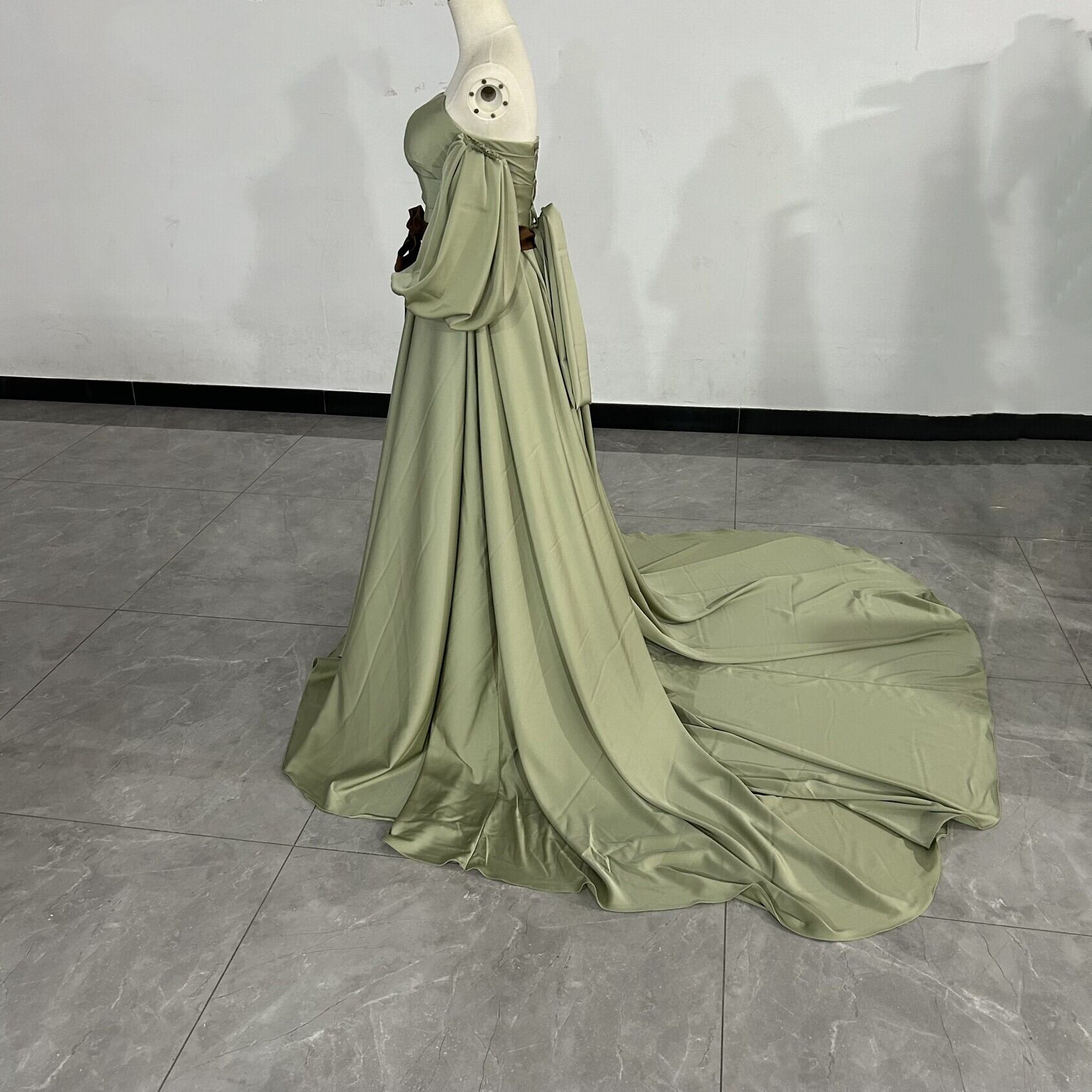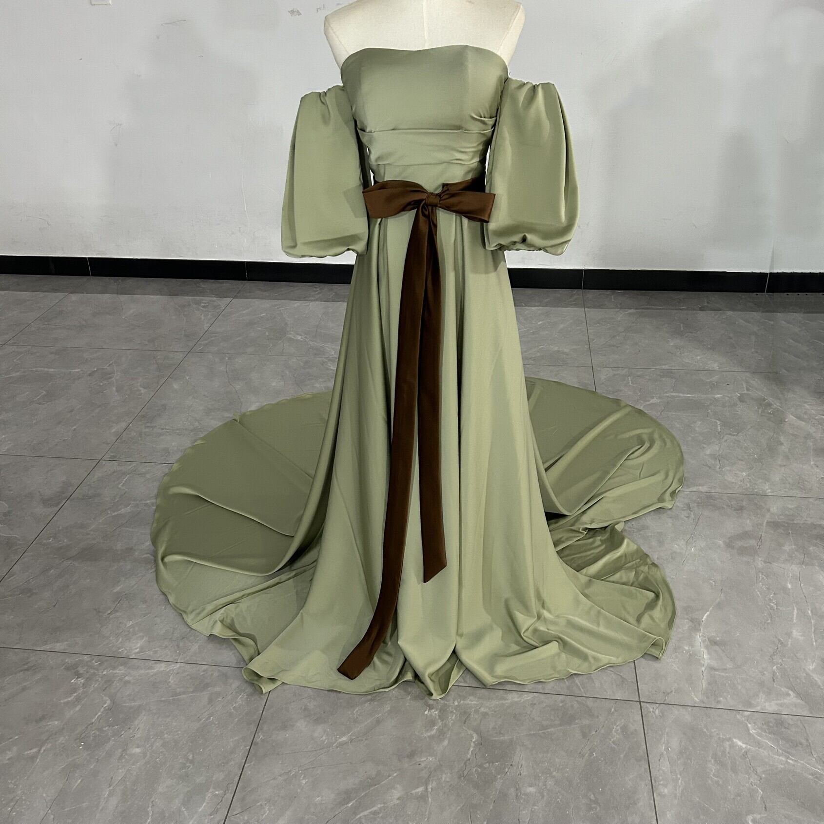 グリーン ベアトップ カラードレス 取り外し袖 華やかなトレーン ふっくら柔らかなバックリボン エンパイアライン結婚式/披露