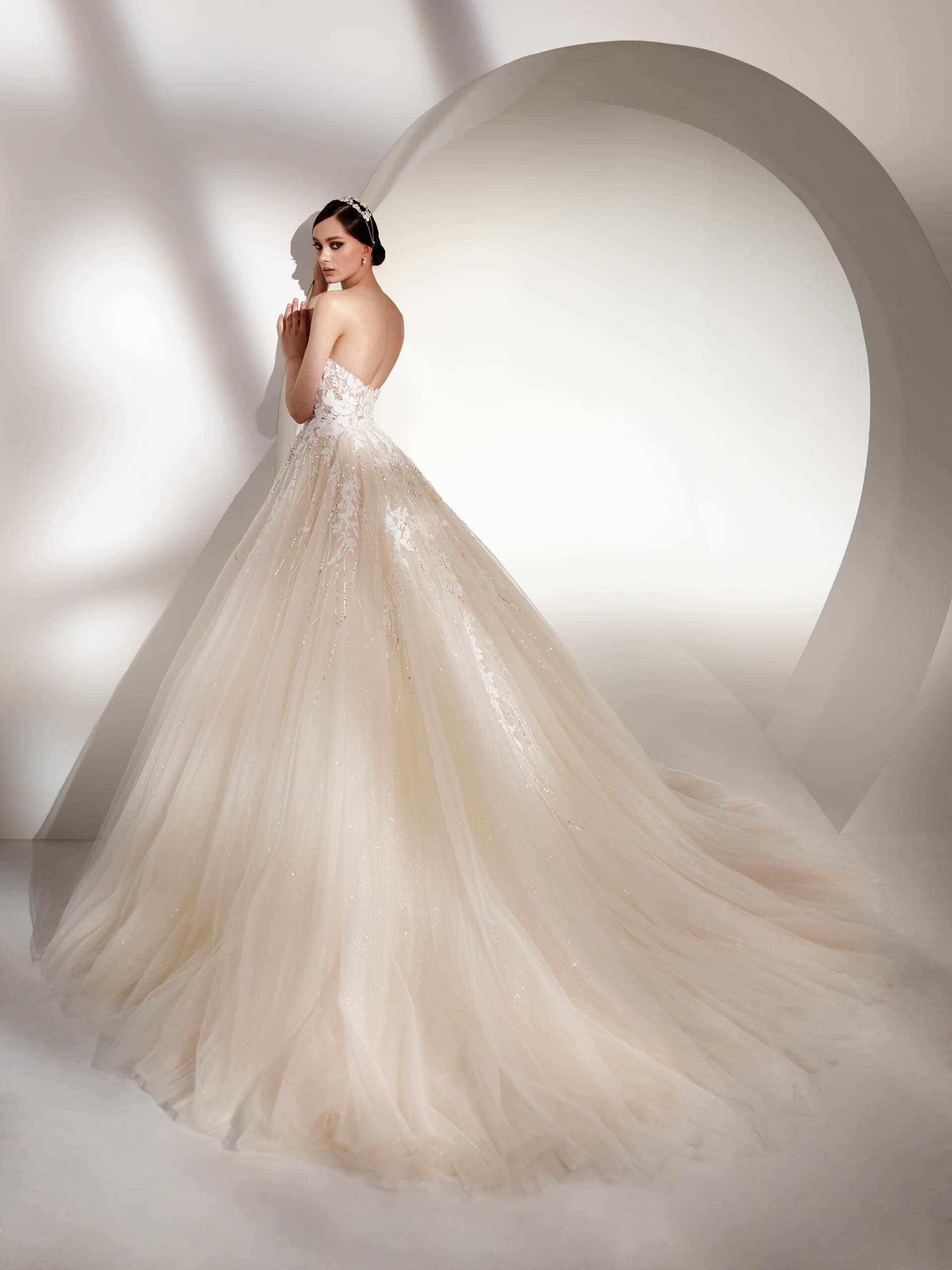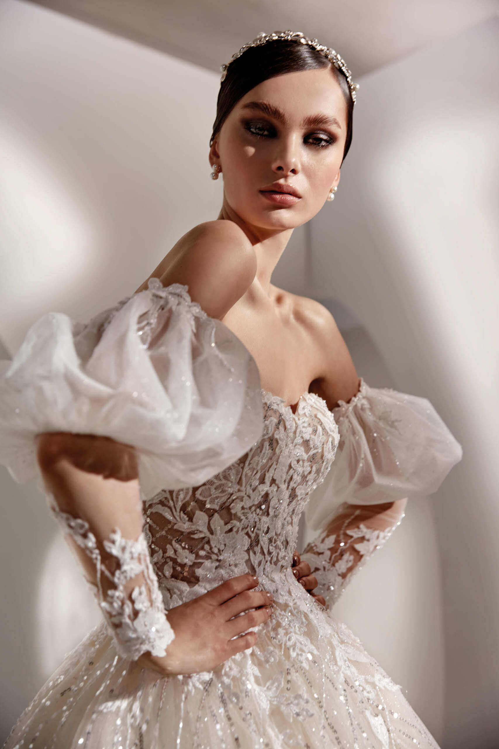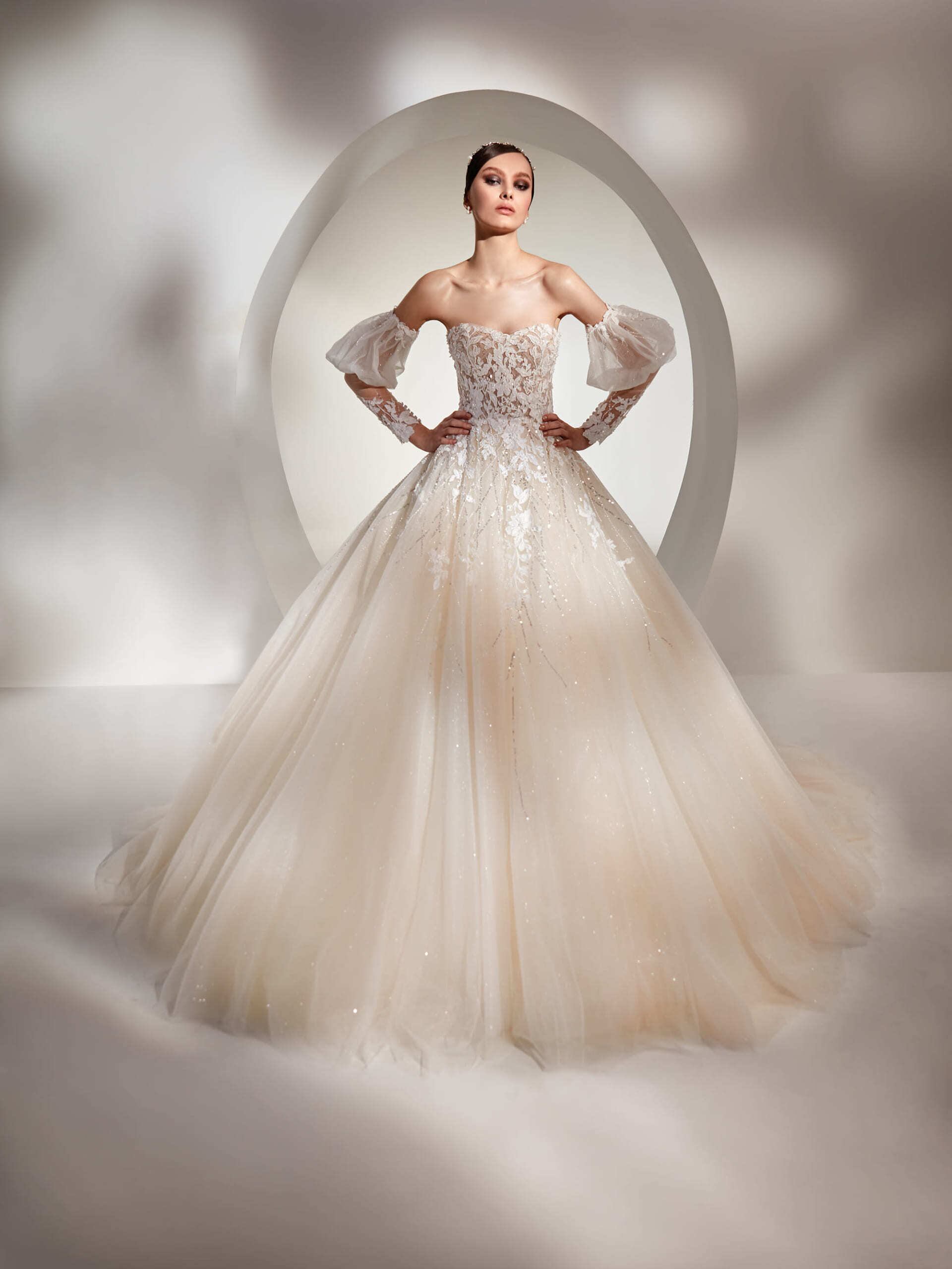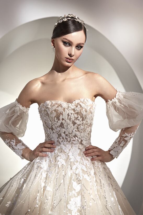 送料無料!ウエディングドレス 取り外しパフスリーブ キラキラレース ラメ 上品レース ソフトチュール プリンセスライン ハートカット 花柄のモチーフ刺繍が美しく 華やかなトレーン オーダードレス ハンドメイド 花嫁 結婚式/前撮り/二次会 イブニングドレス パーティドレス | David1021k Dress(ダヴィドレス)