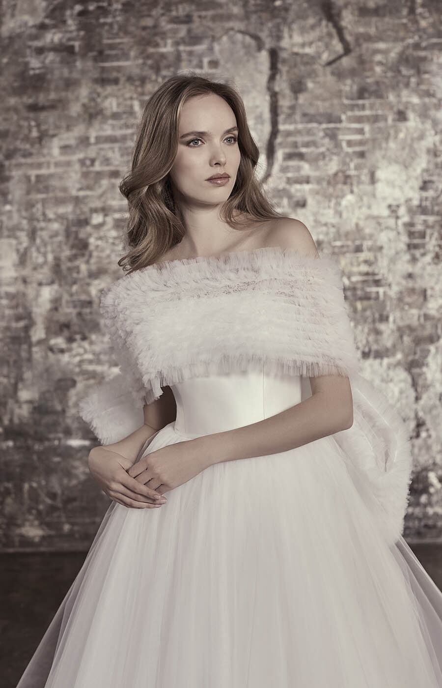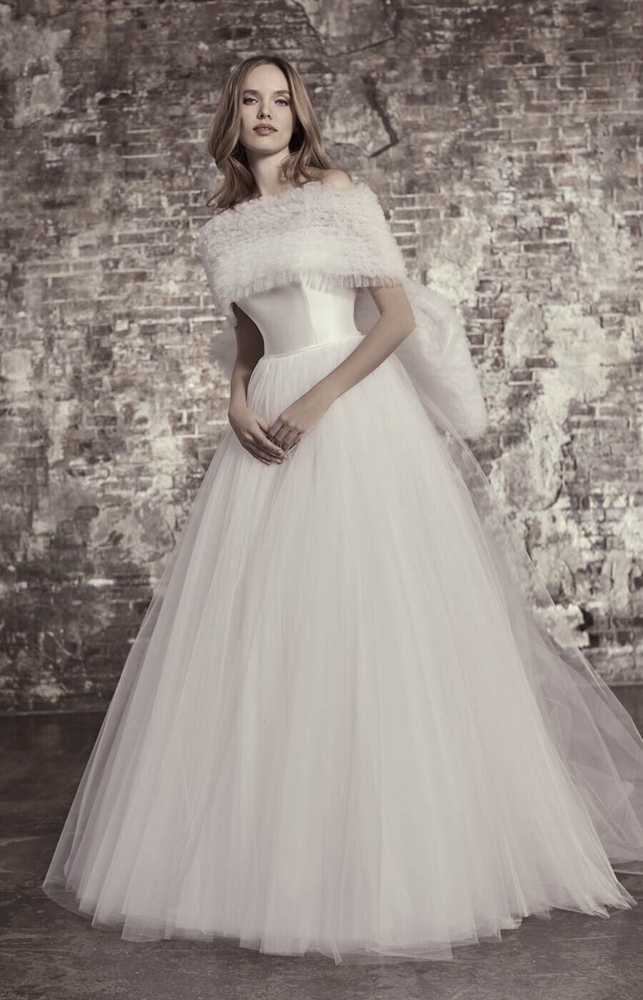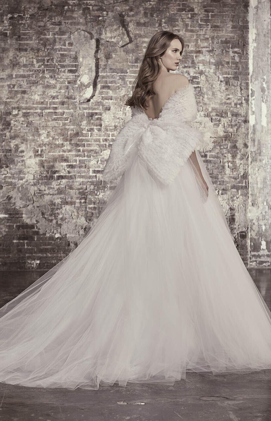 送料無料!ウエディングドレス オフショルダー ベアトップ ビスチェドレス 柔らかく重ねたチュールスカート ふっくら柔らかなバックリボン トレーン オーダードレス ハンドメイド 花嫁 結婚式/前撮り/二次会 | David1021k Dress(ダヴィドレス)