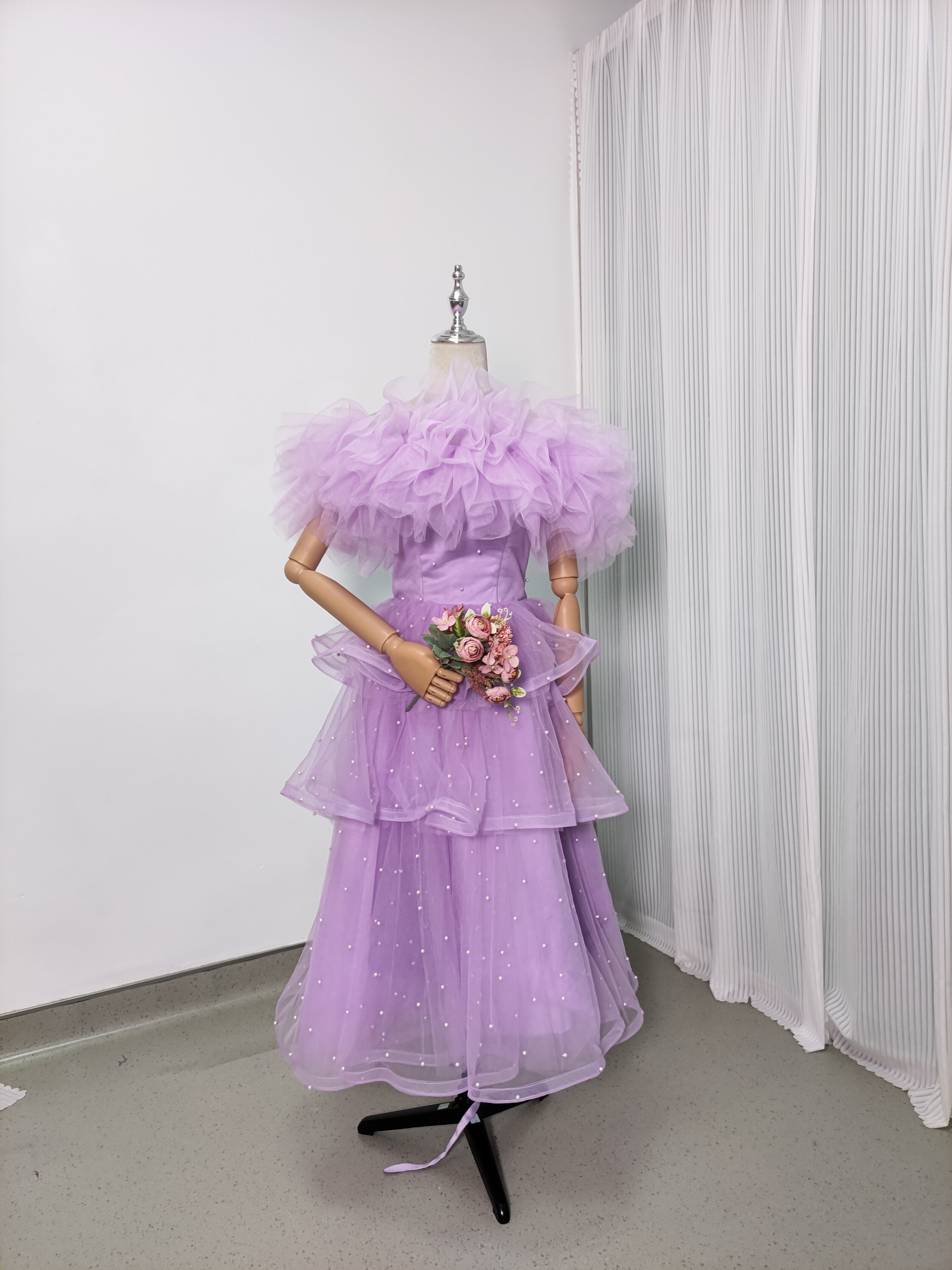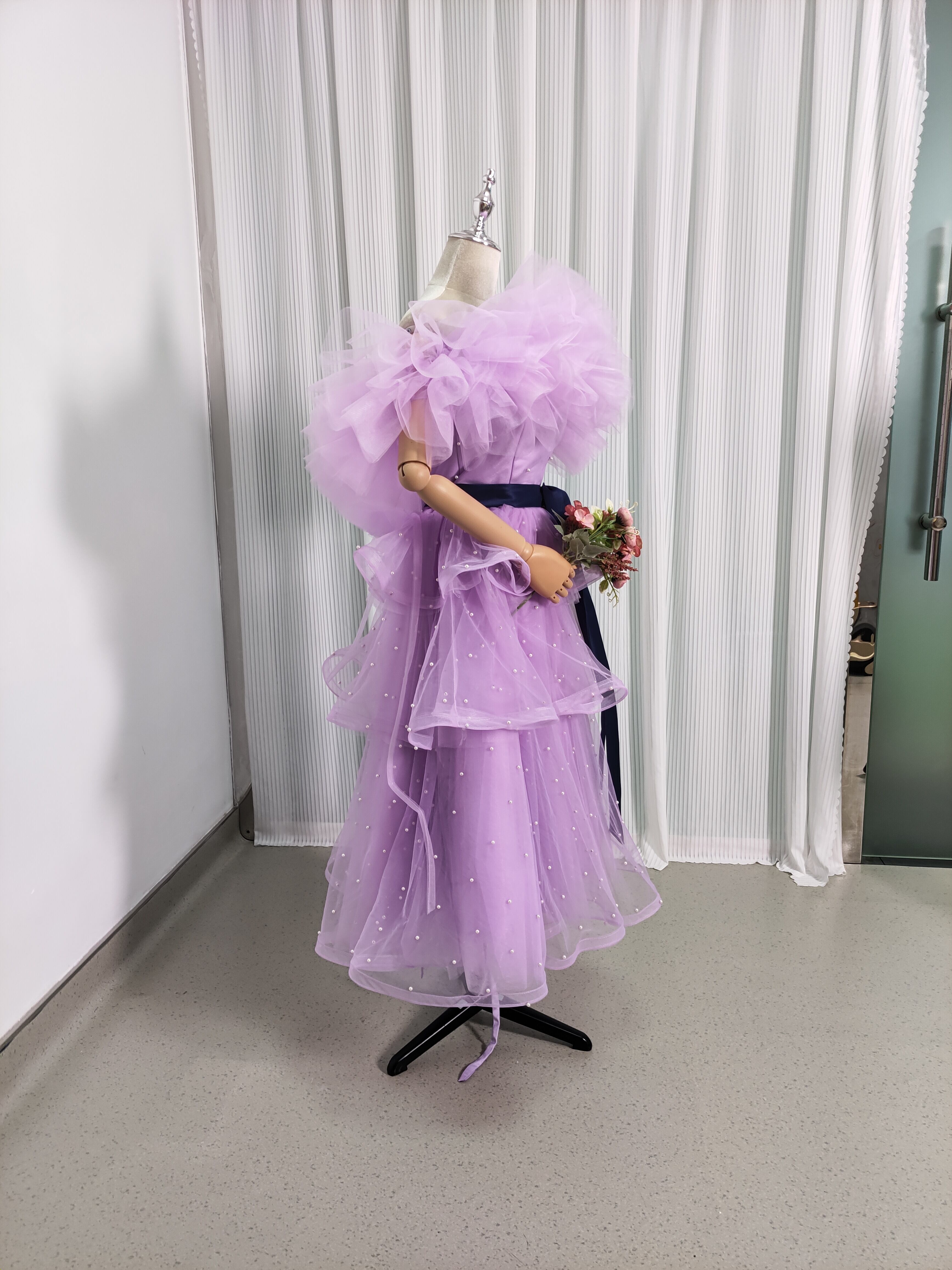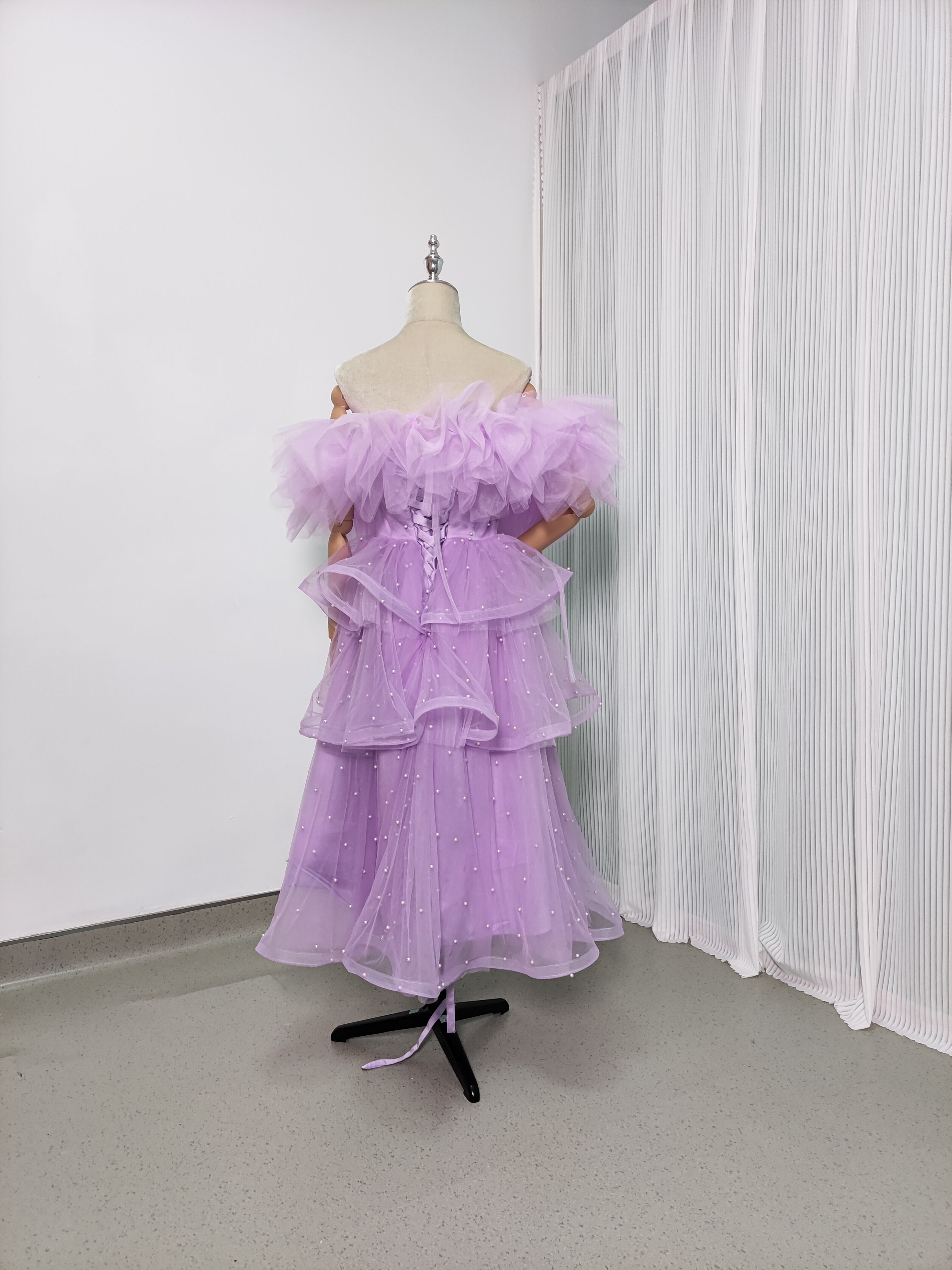 抜群のおしゃれ見え 取り外しオフショルダー カラードレス 柔らかく重ねたチュールスカート/挙式/前撮り/