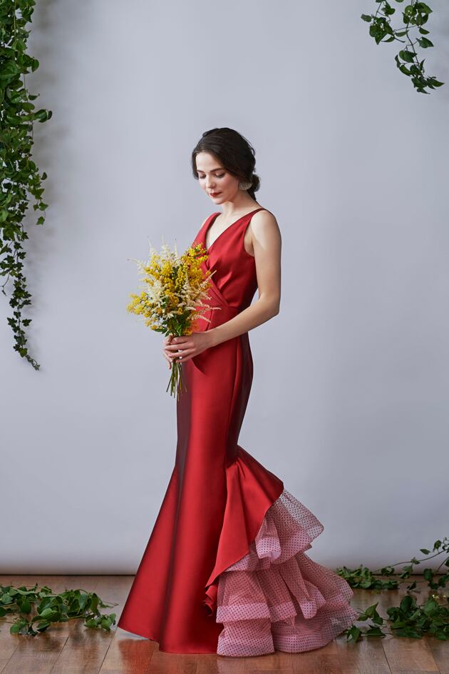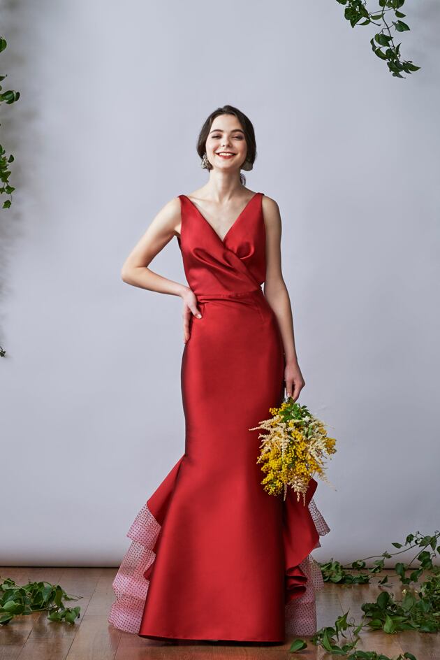 送料無料!カラードレス マーメイドライン 赤/レッド Vネック 高級サテン ノースリーブ フリル かわいい エレガント 優雅 オーダードレス ハンドメイド 花嫁 結婚式/前撮り/二次会 セレモニー イブニングドレス 合コン パーティドレス ミディアムドレス | David1021k Dress(ダヴィドレス)