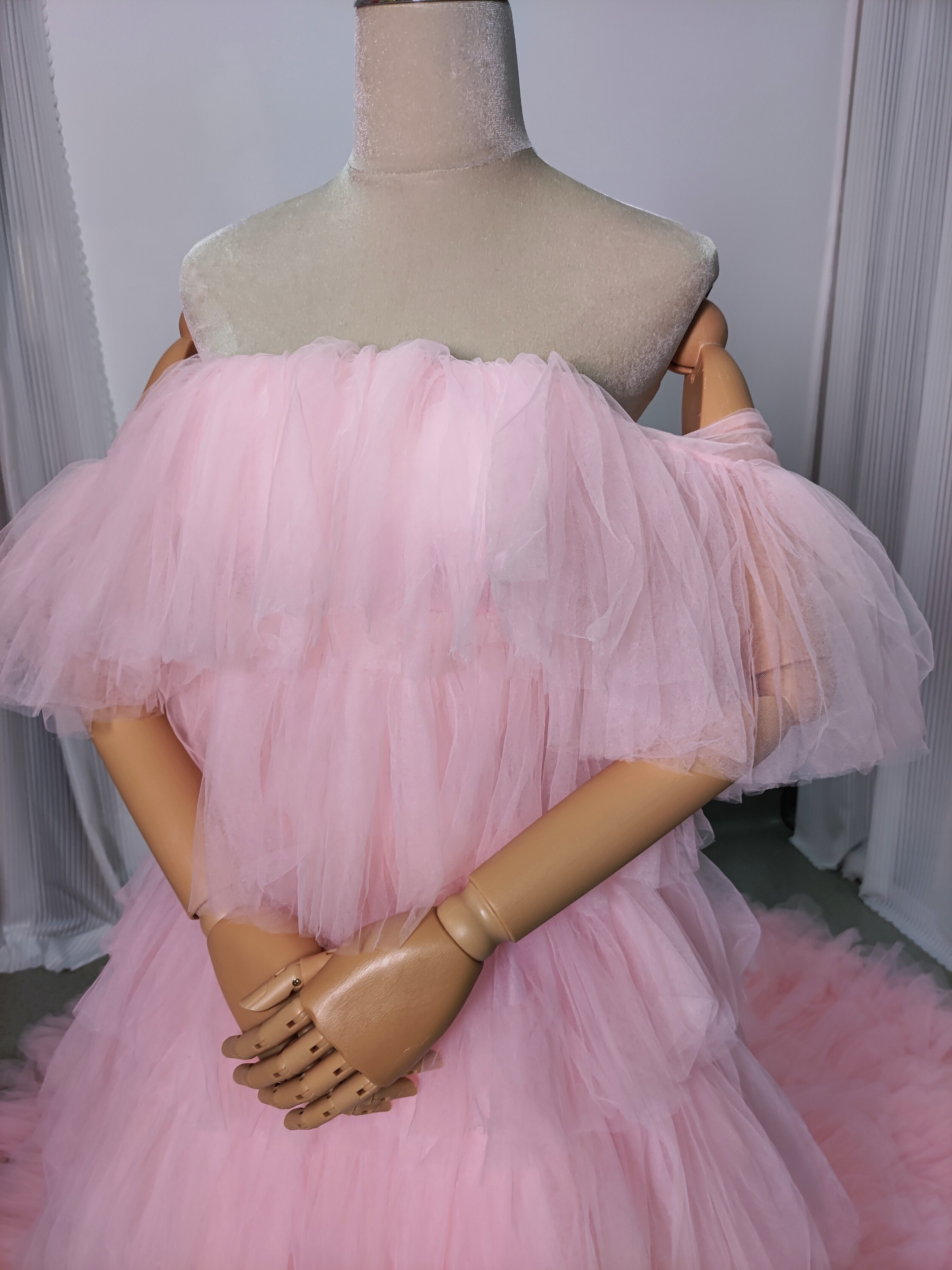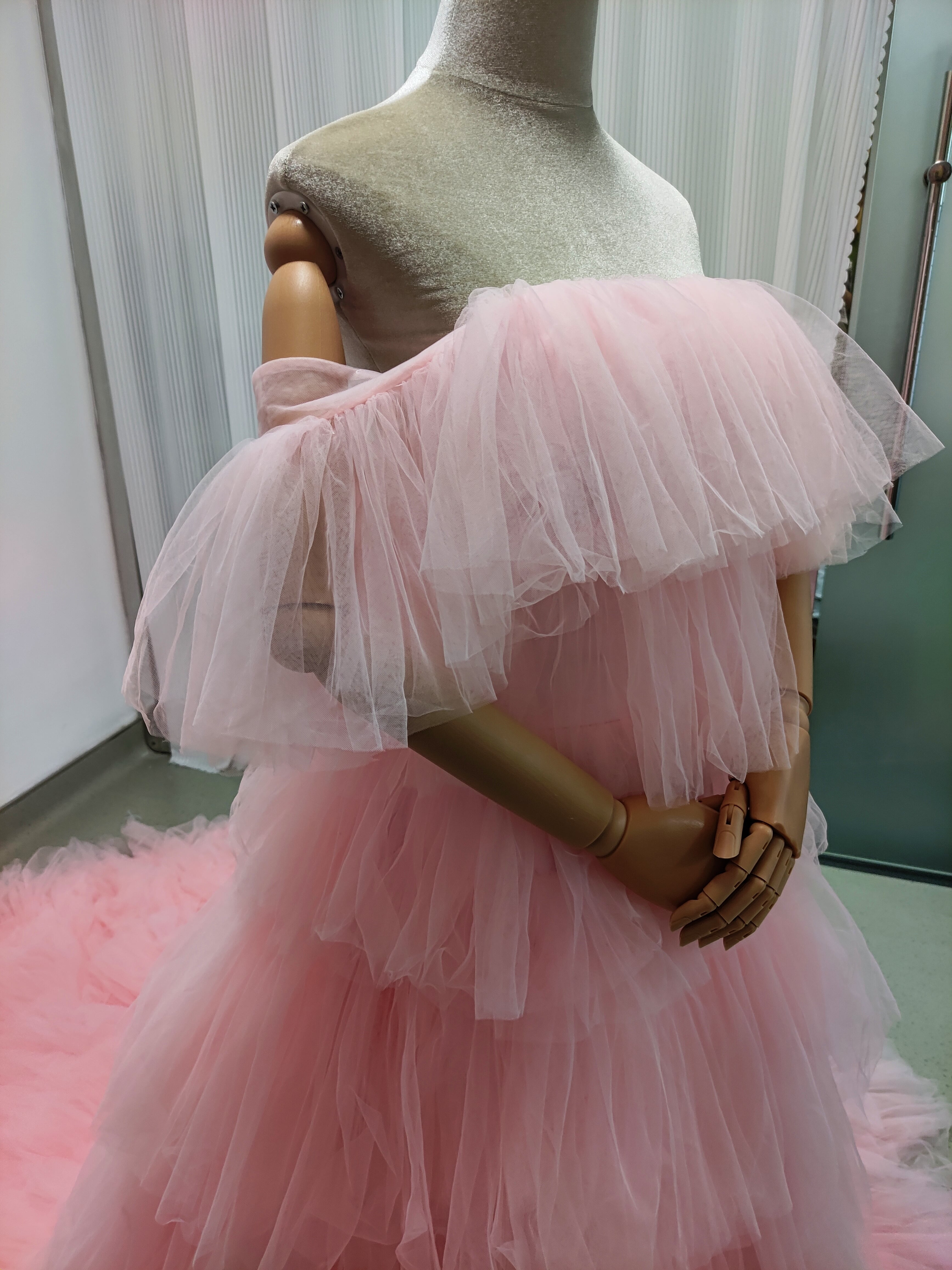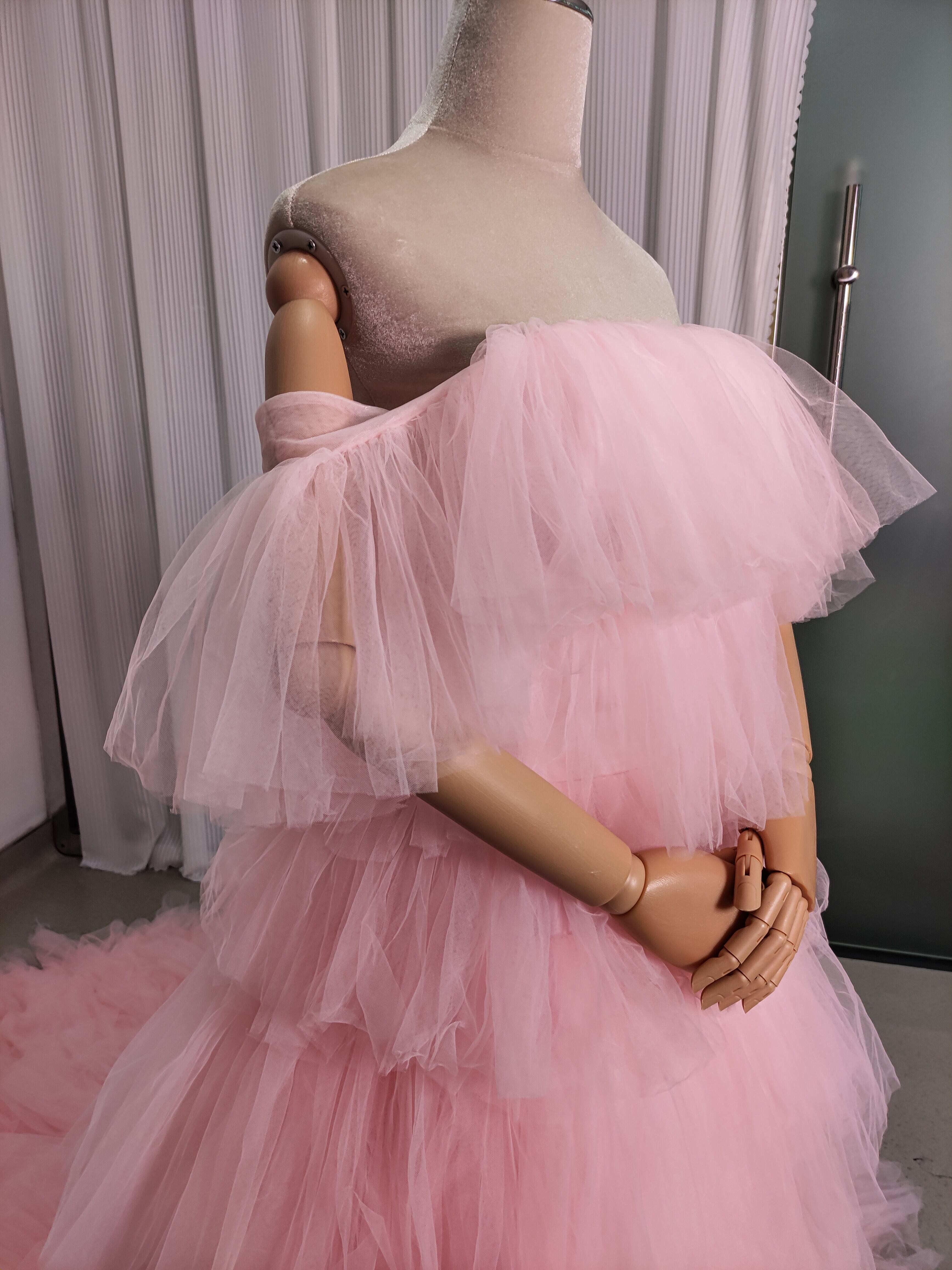 オフショルダー ピンクカラードレス ソフトチュール 重ねたチュールスカート華やかなトレボリュームドレス/前撮り/結婚式