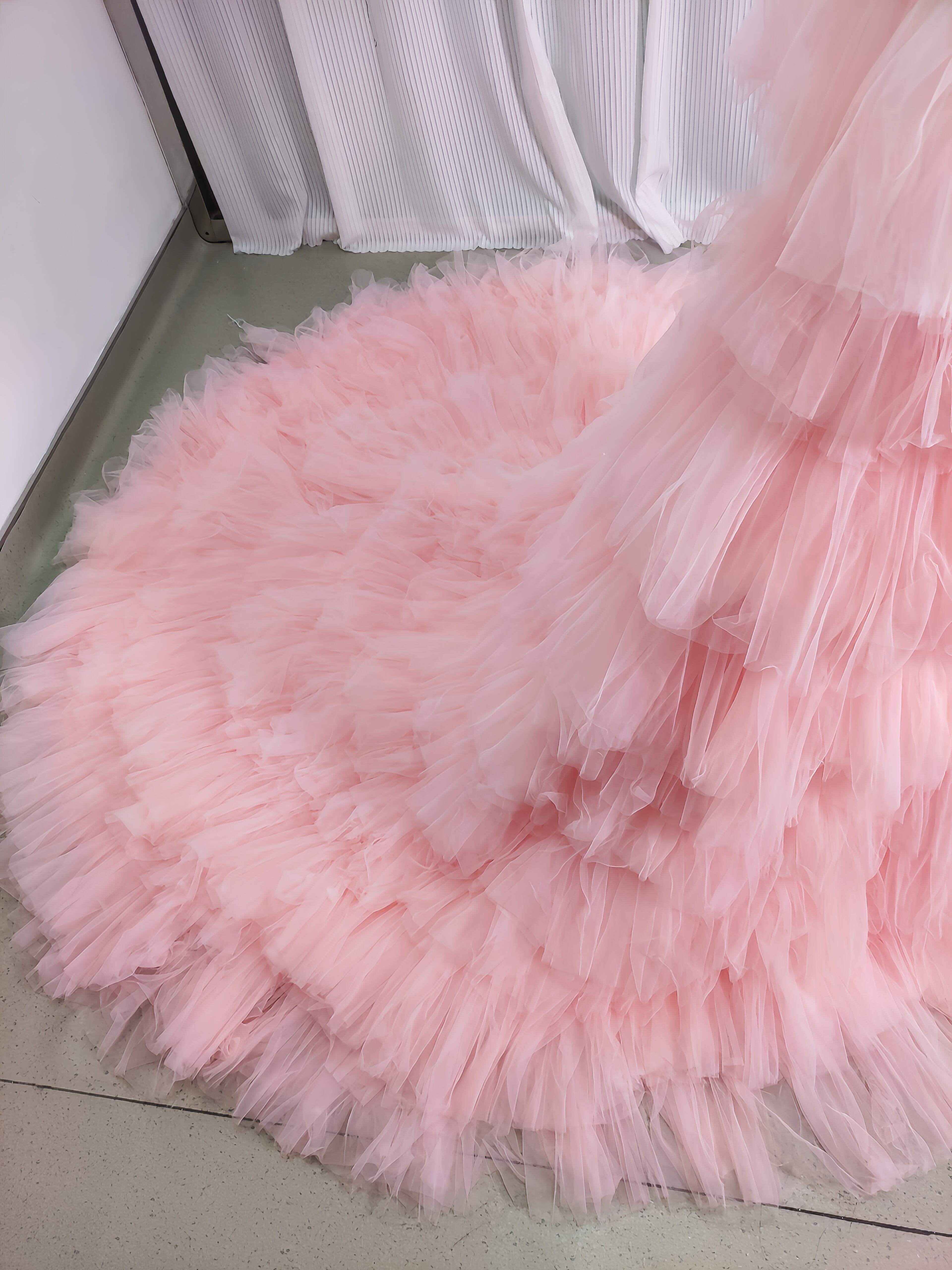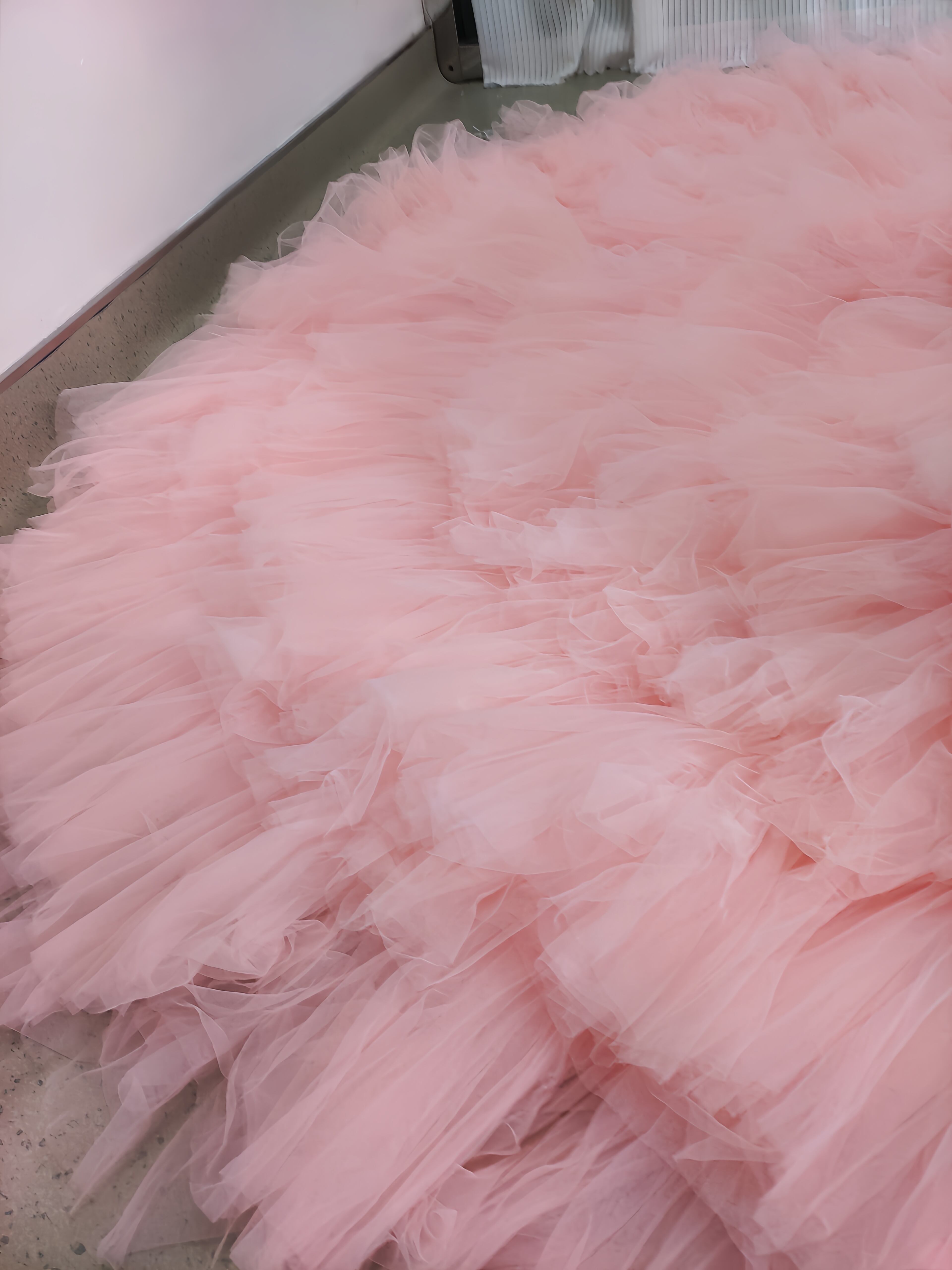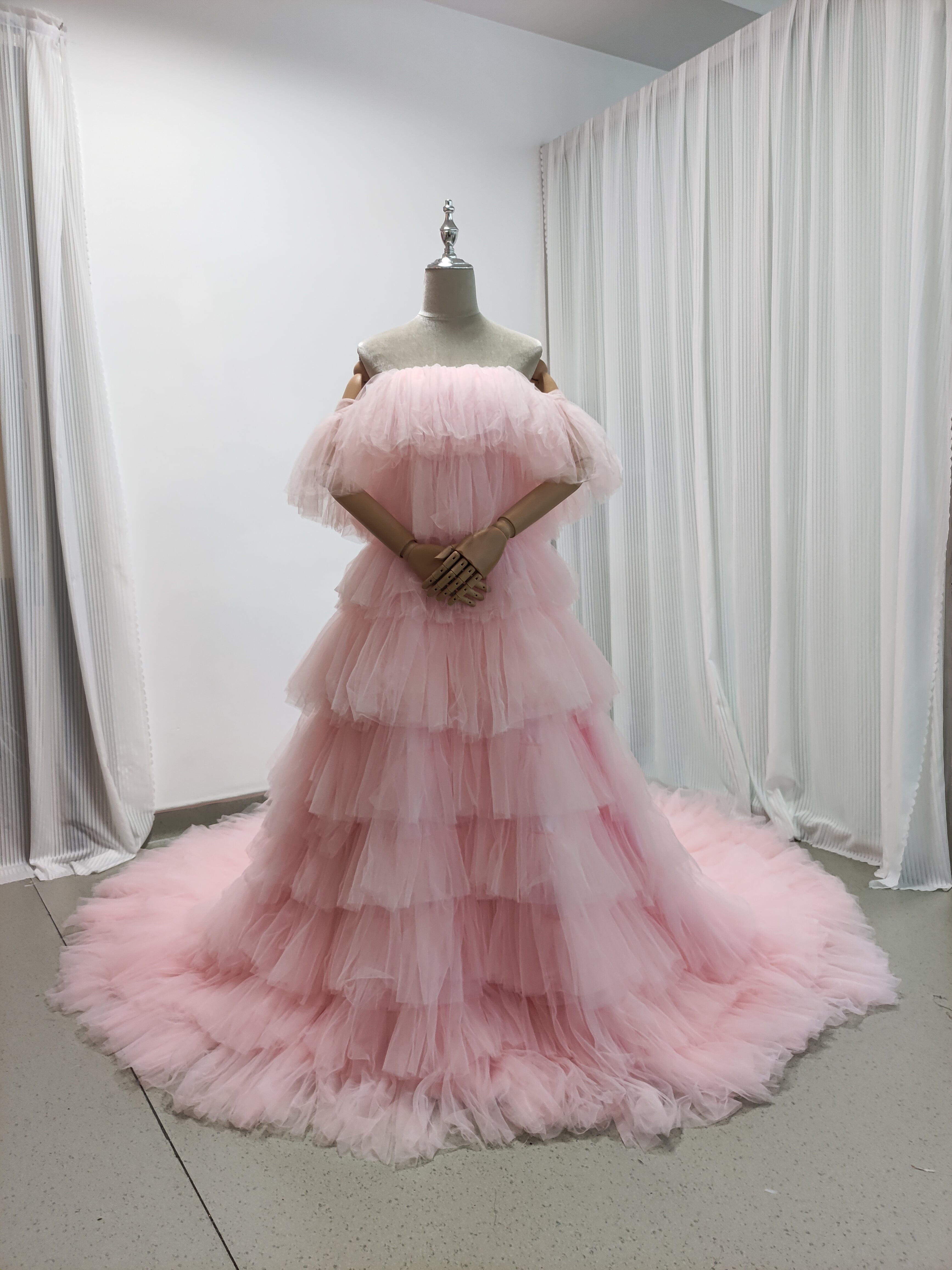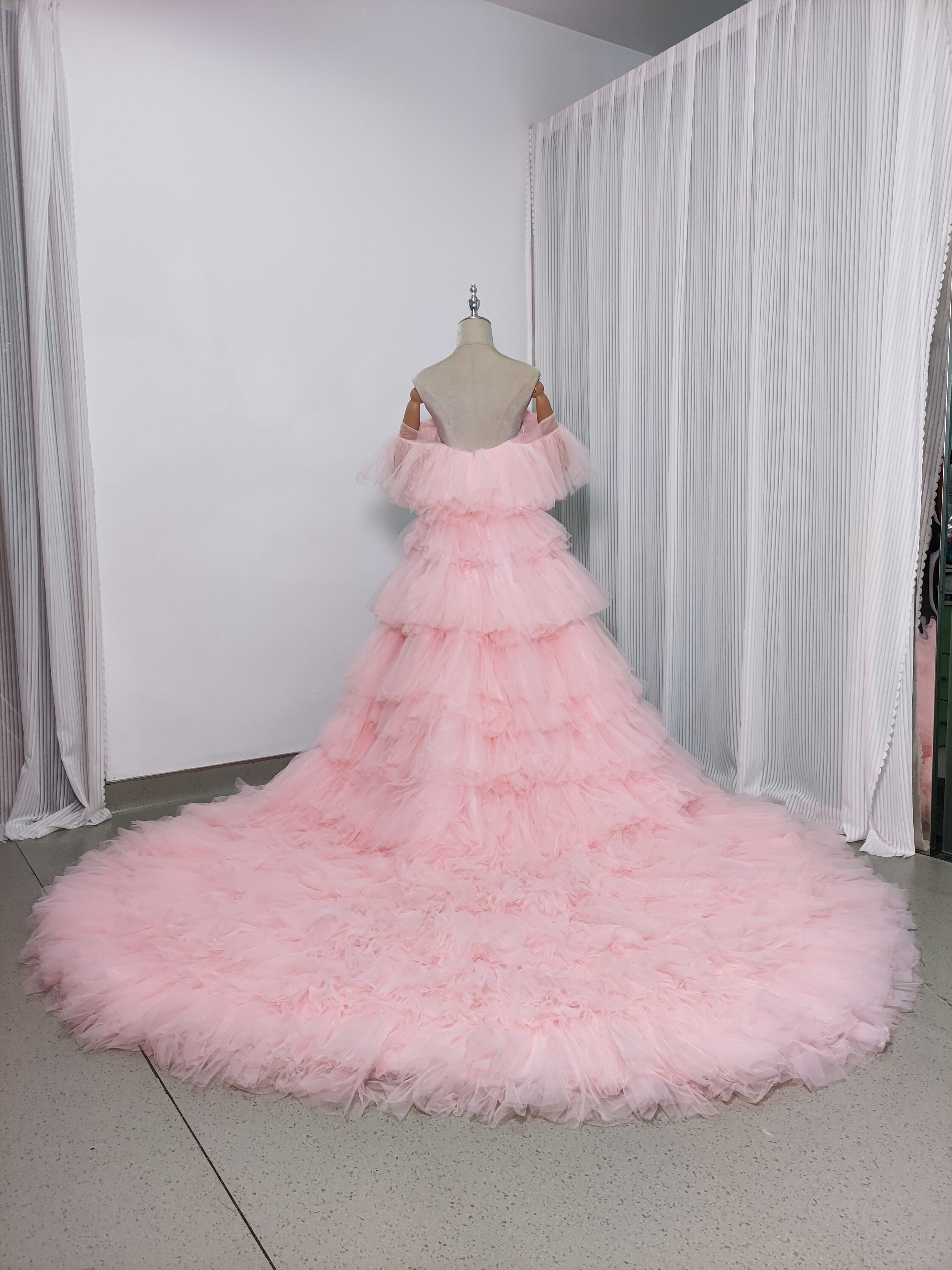 オフショルダー ピンクカラードレス ソフトチュール 重ねたチュールスカート華やかなトレボリュームドレス/前撮り/結婚式