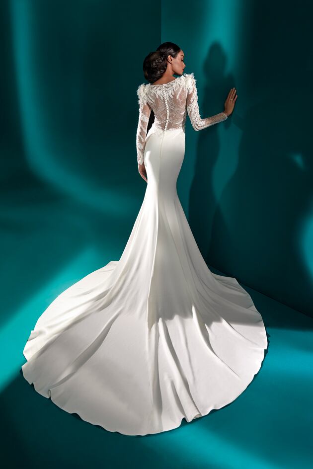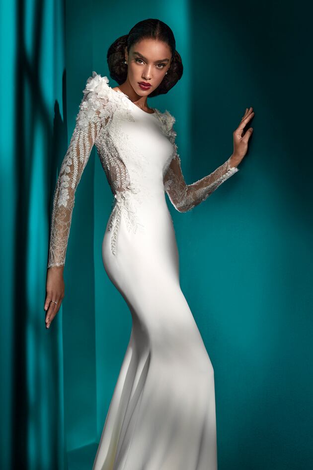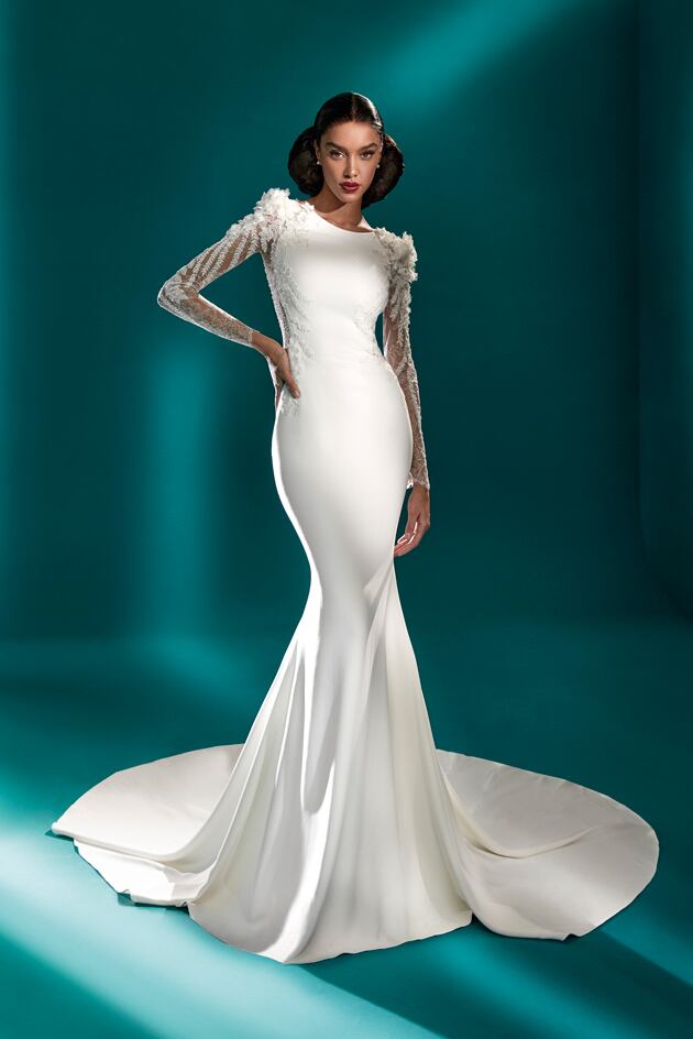 送料無料!ウエディングドレス 長袖 マーメイドライン 上品レース Vネック 花柄のモチーフ刺繍が美しく 枝花刺繍 かわいい 華やかなトレーン エレガント 優雅 オーダードレス ハンドメイド 花嫁 結婚式/前撮り/二次会 セレモニー イブニングドレス 合コン パーティドレス ミディアムドレス | David1021k Dress(ダヴィドレス)