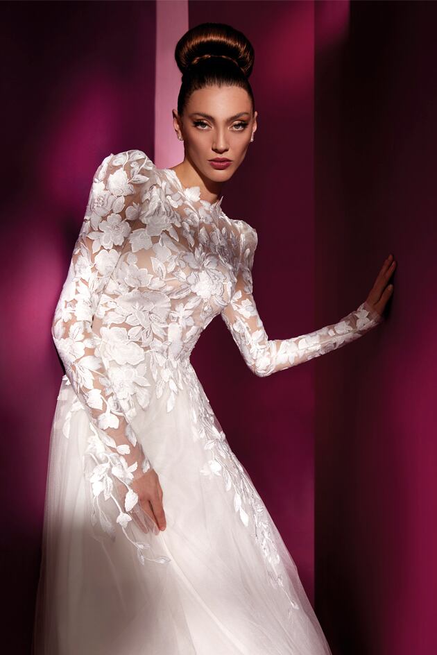 送料無料!ウエディングドレス ハイネック 上品レース かわいい Aライン シースルー 長袖 トレーン ソフトチュール エレガント 優雅 オーダードレス ハンドメイド 花嫁 結婚式/前撮り/二次会 セレモニー イブニングドレス 合コン パーティドレス ミディアムドレス | David1021k Dress(ダヴィドレス)