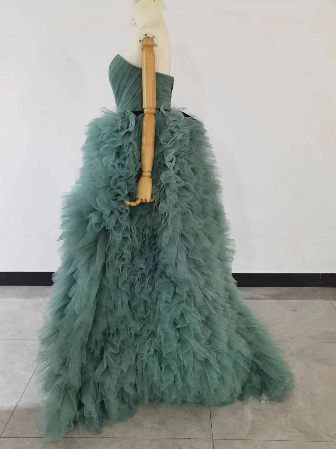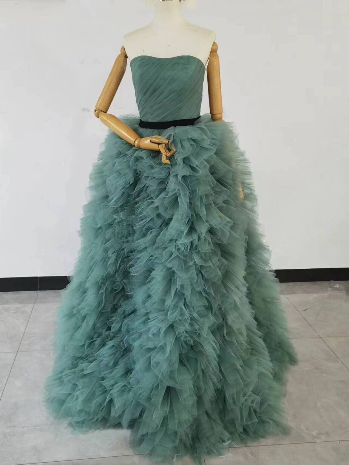 グリーン オフショルダー カラードレス ソフトチュール 重ねたチュールスカート華やかなトレボリュームドレス/前撮り/結婚式
