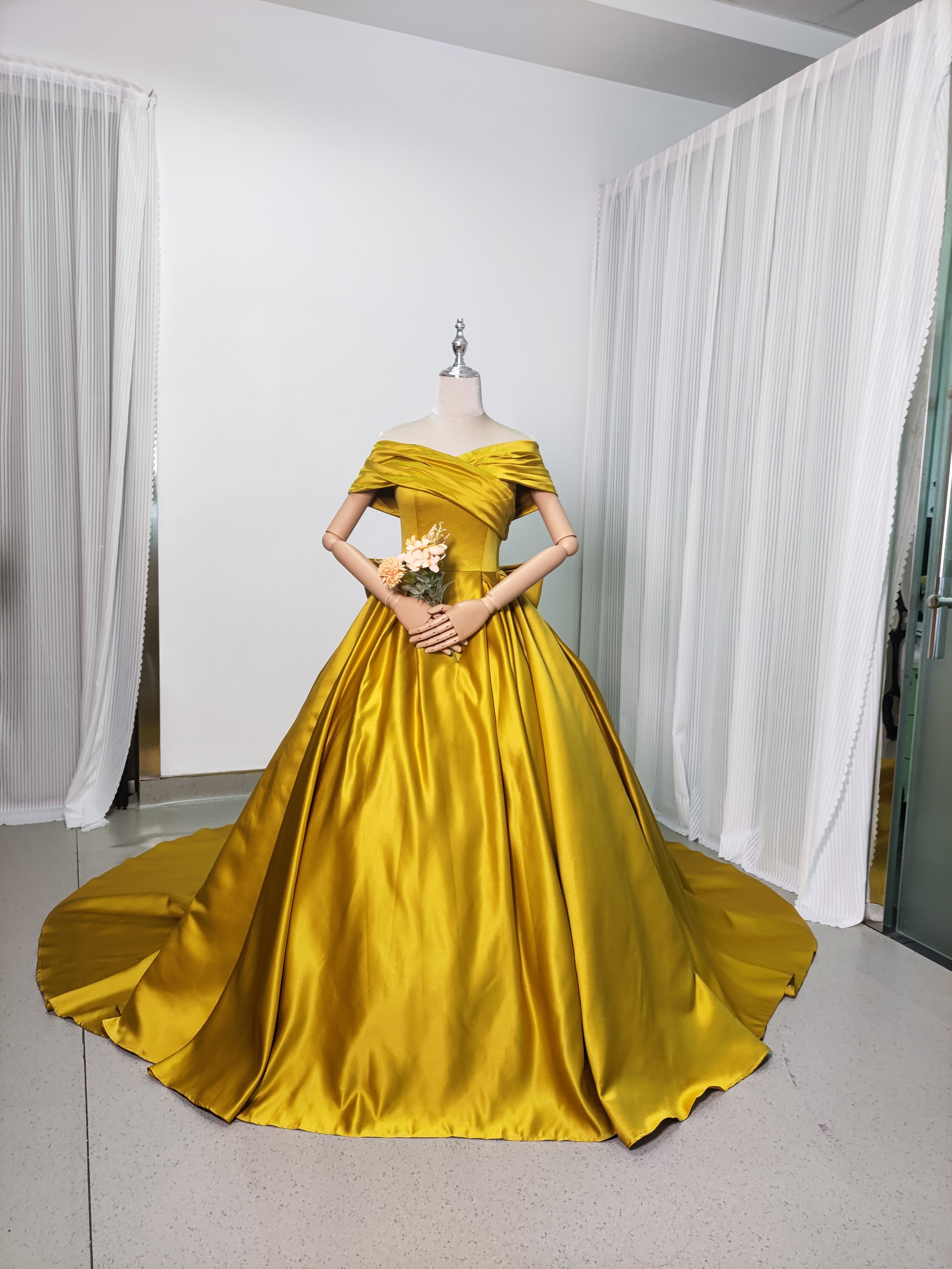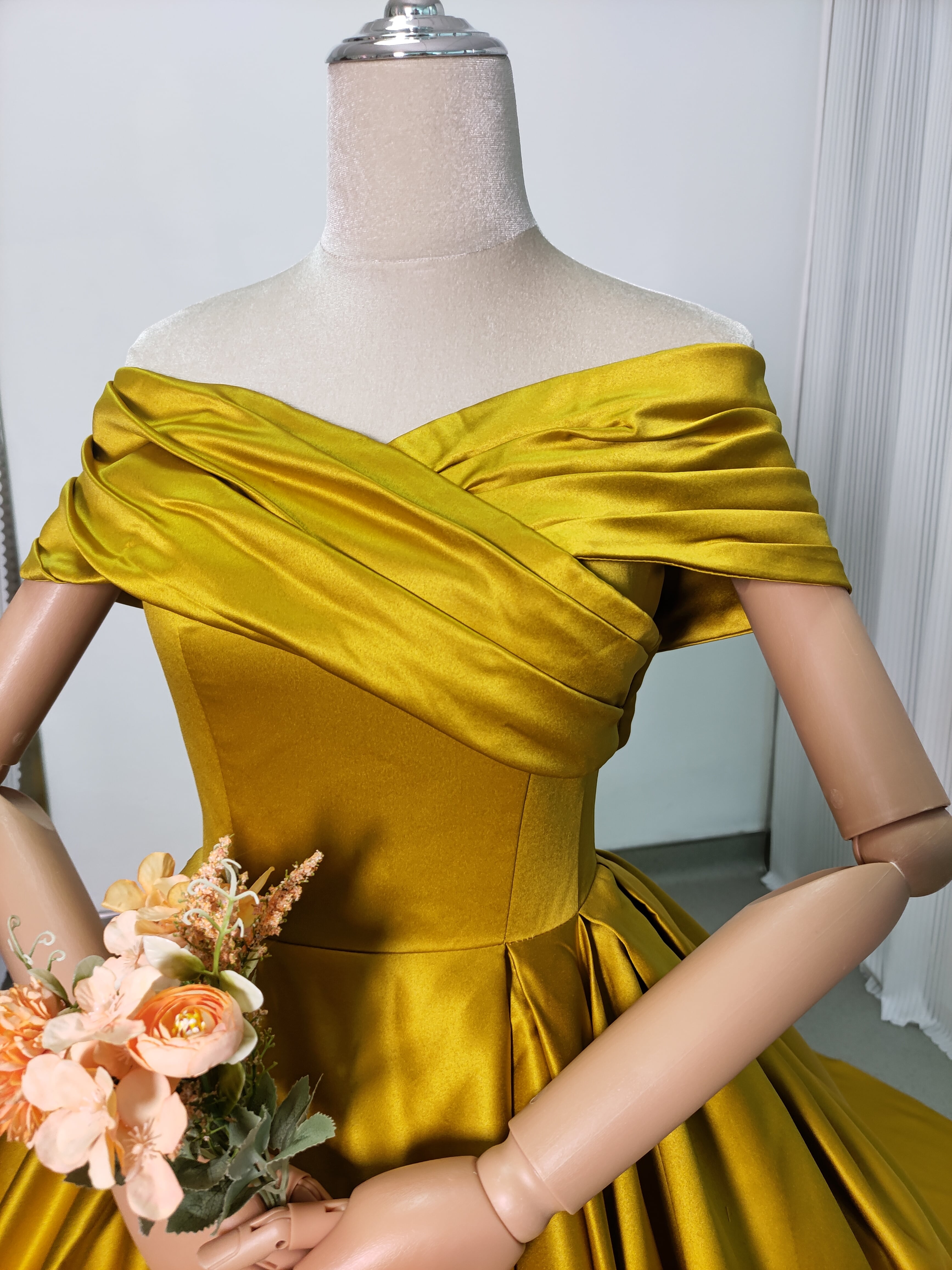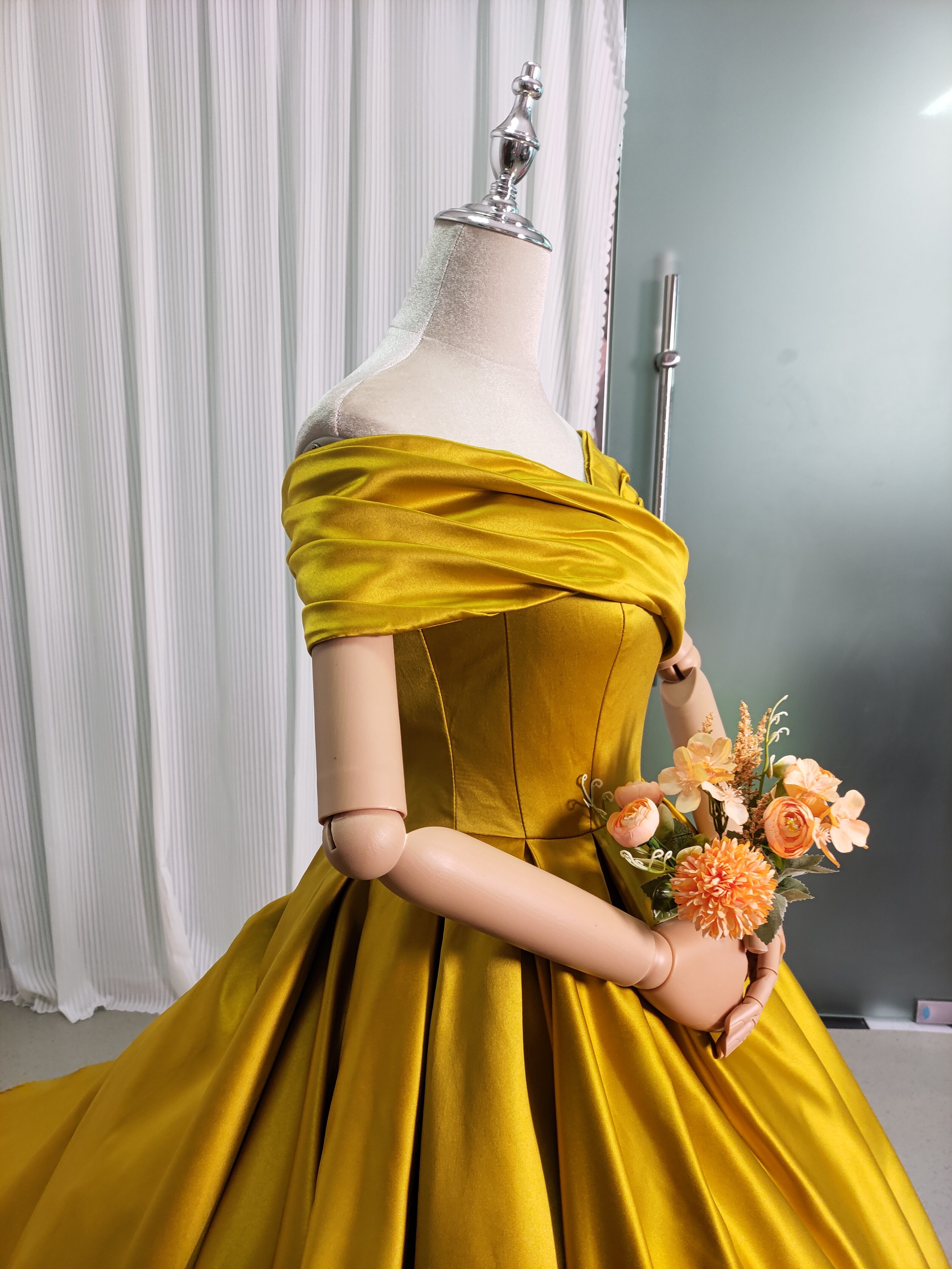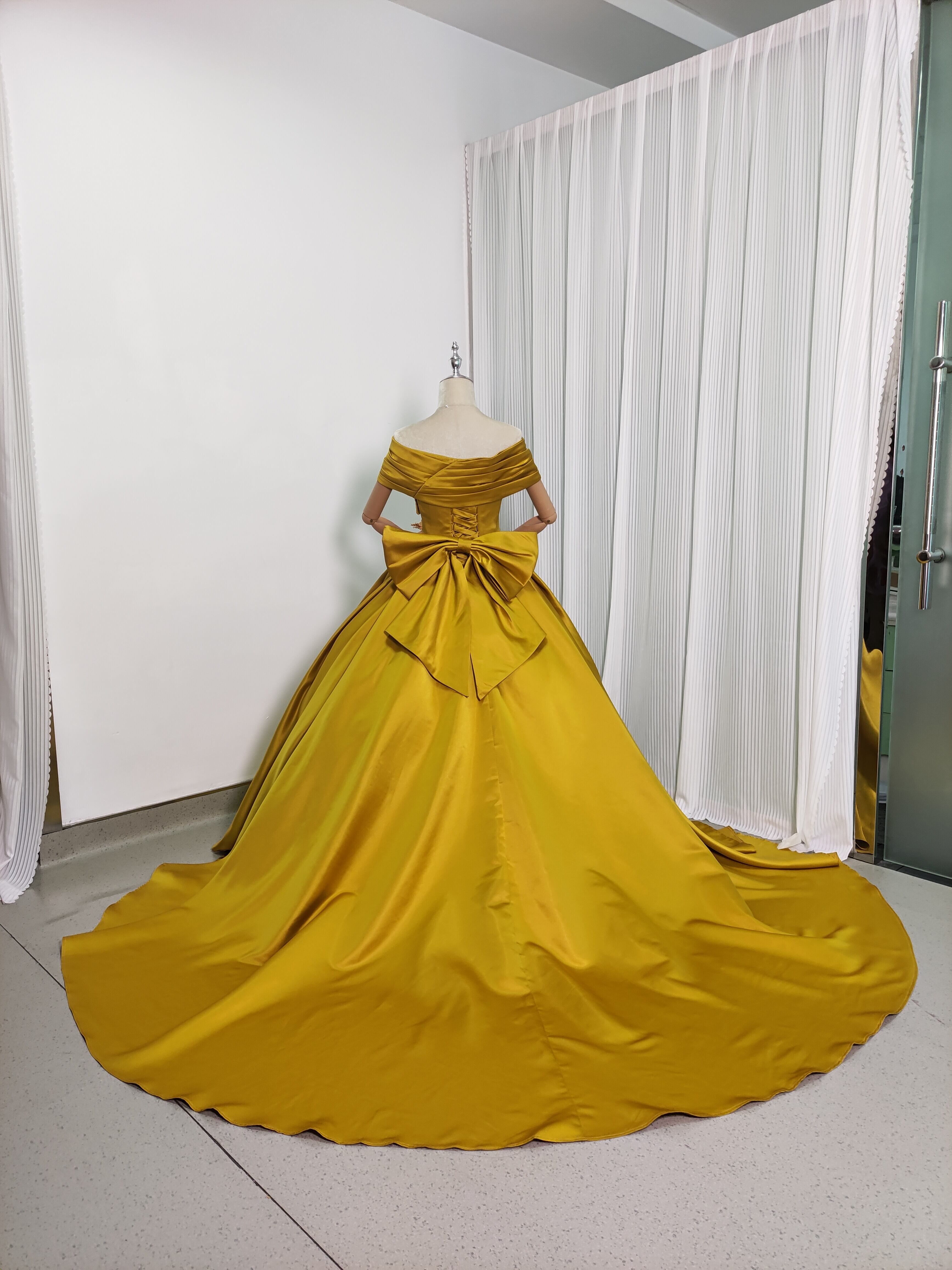 カナリーイエロー オフショルダー カラードレス 華やかなトレーン ふっくら柔らかなバックリボン