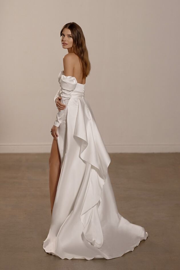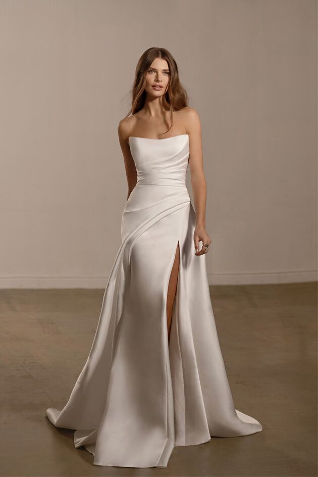 送料無料!ウエディングドレス ベアトップ Aライン Vネック かわいい トレーン フロントスリット オーダードレス ハンドメイド アシンメトリー風 エレガント 優雅 花嫁 結婚式/前撮り/二次会 セレモニー イブニングドレス パーティードレス 合コン ミディアムドレス | David1021k Dress(ダヴィドレス)