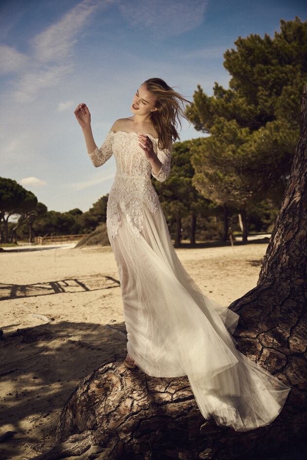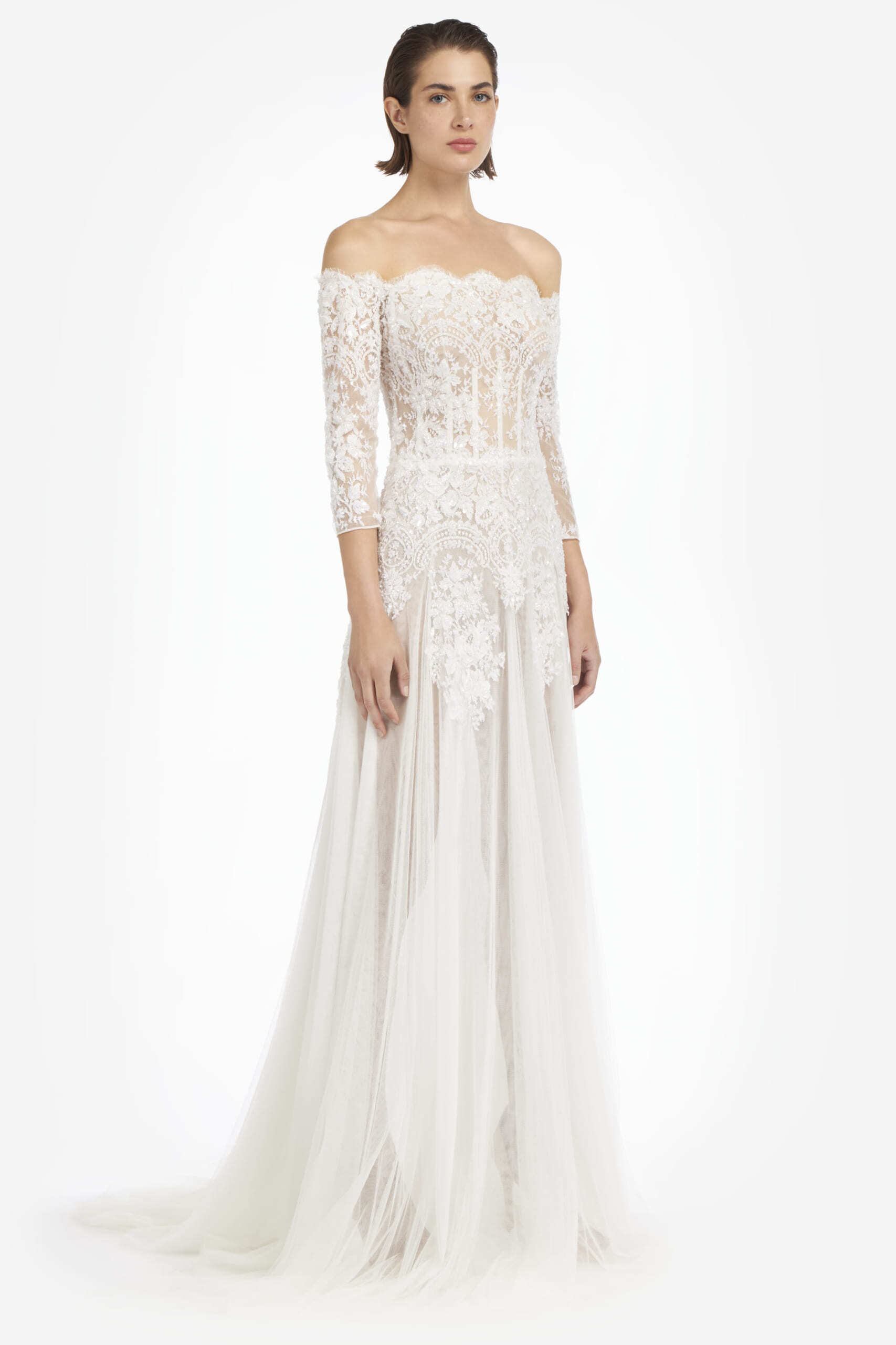 送料無料!ウエディングドレス オフショルダー 七分袖丈 かわいい 上品レース トレーン オーダードレス ソフトチュール ハンドメイド エレガント 優雅 花嫁 結婚式/前撮り/二次会 セレモニー イブニングドレス 合コン パーティドレス ミディアムドレス | David1021k Dress(ダヴィドレス)
