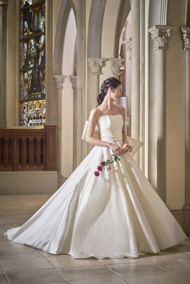 送料無料!ウエディングドレス ベアトップ プリンセスライン ビスチェドレス バックリボン かわいい 高級サテン トレーン オーダードレス ハンドメイド エレガント 優雅 花嫁 結婚式/前撮り/二次会 セレモニー イブニングドレス 合コン パーティドレス ミディアムドレス | David1021k Dress(ダヴィドレス)