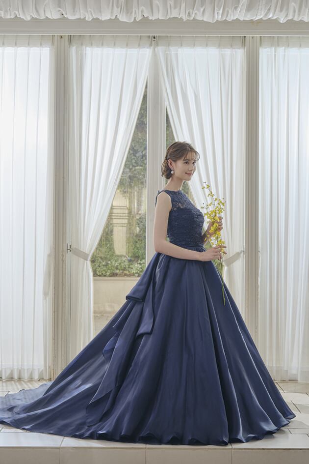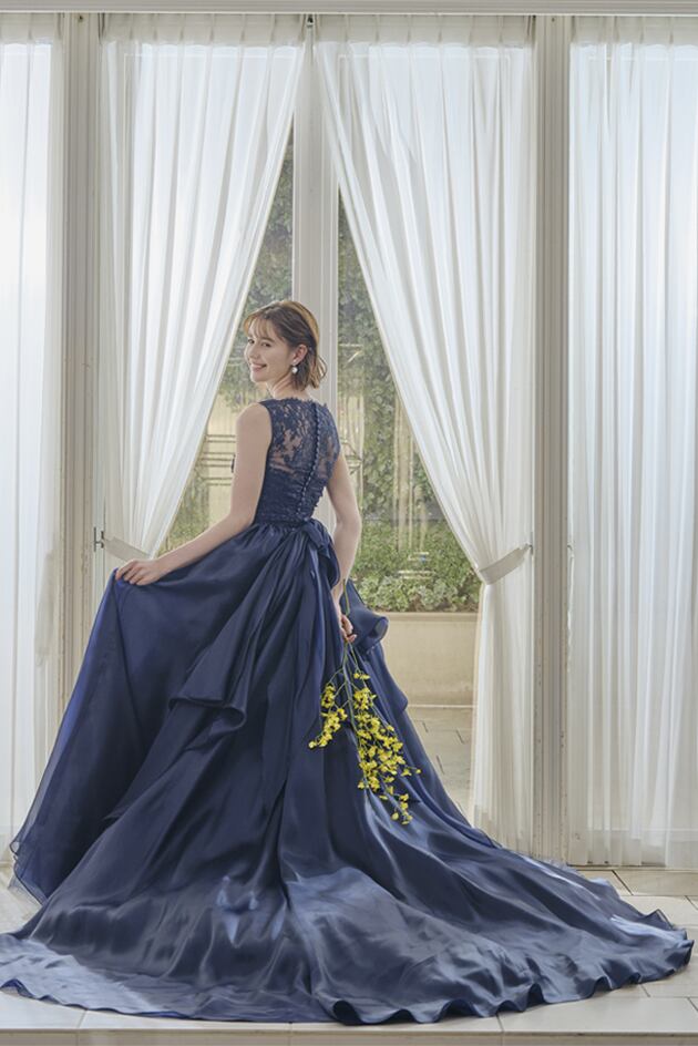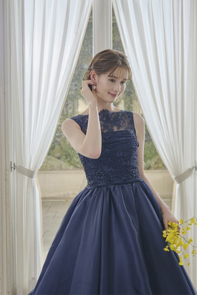 送料無料!カラードレス ネイビー色 上品レース ノースリーブ ボートネック かわいい エレガント 優雅 オーダードレス ハンドメイド 花嫁 結婚式/前撮り/二次会 セレモニー イブニングドレス 合コン パーティドレス ピアノ演奏 ミディアムドレス | David1021k Dress(ダヴィドレス)