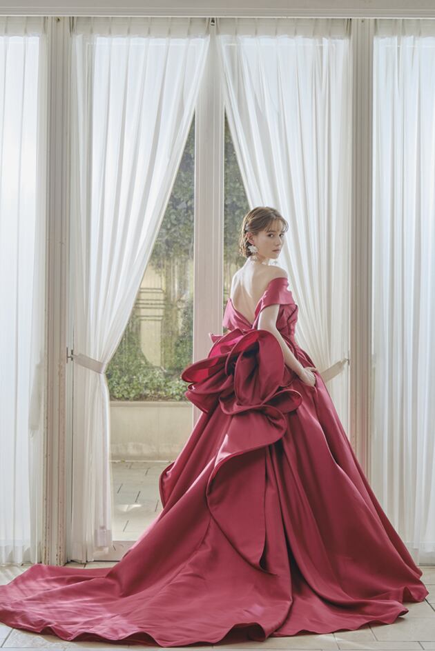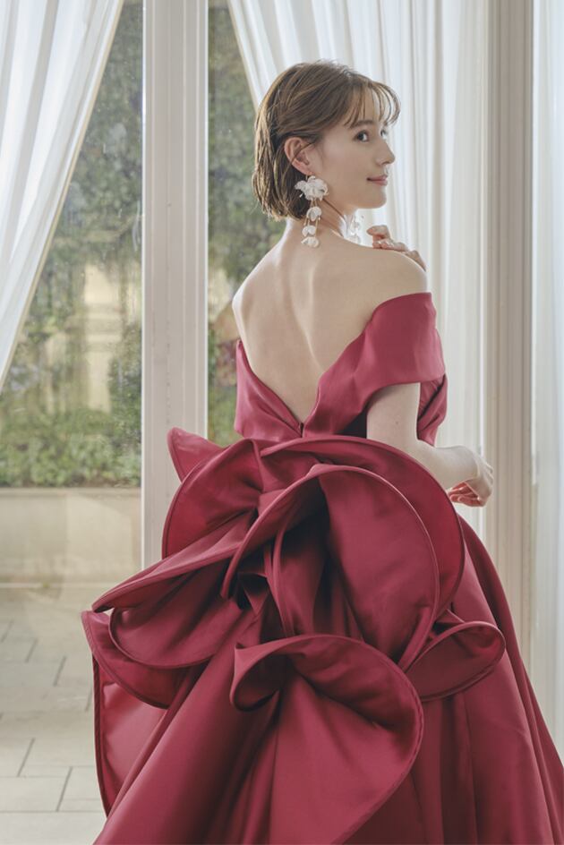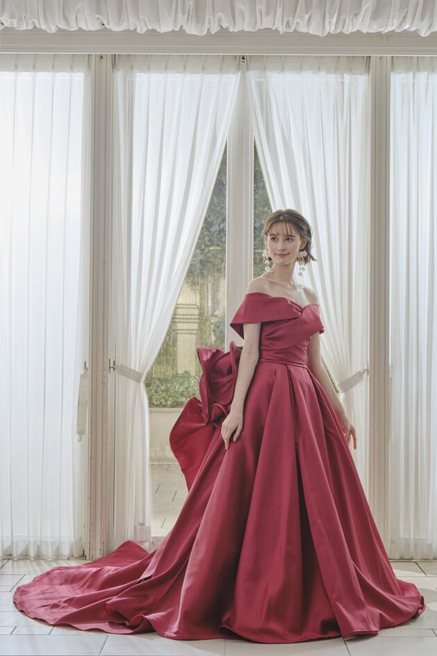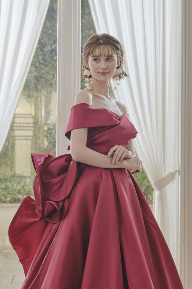 送料無料!カラードレス オフショルダー ワインレッド レッド/赤 豪華なバックリボン かわいい 高級サテン トレーン ハイネック オーダードレス ハンドメイド エレガント ウエディングドレス 優雅 花嫁 結婚式/前撮り/二次会 セレモニー イブニングドレス 合コン パーティドレス ミディアムドレス | David1021k Dress(ダヴィドレス)