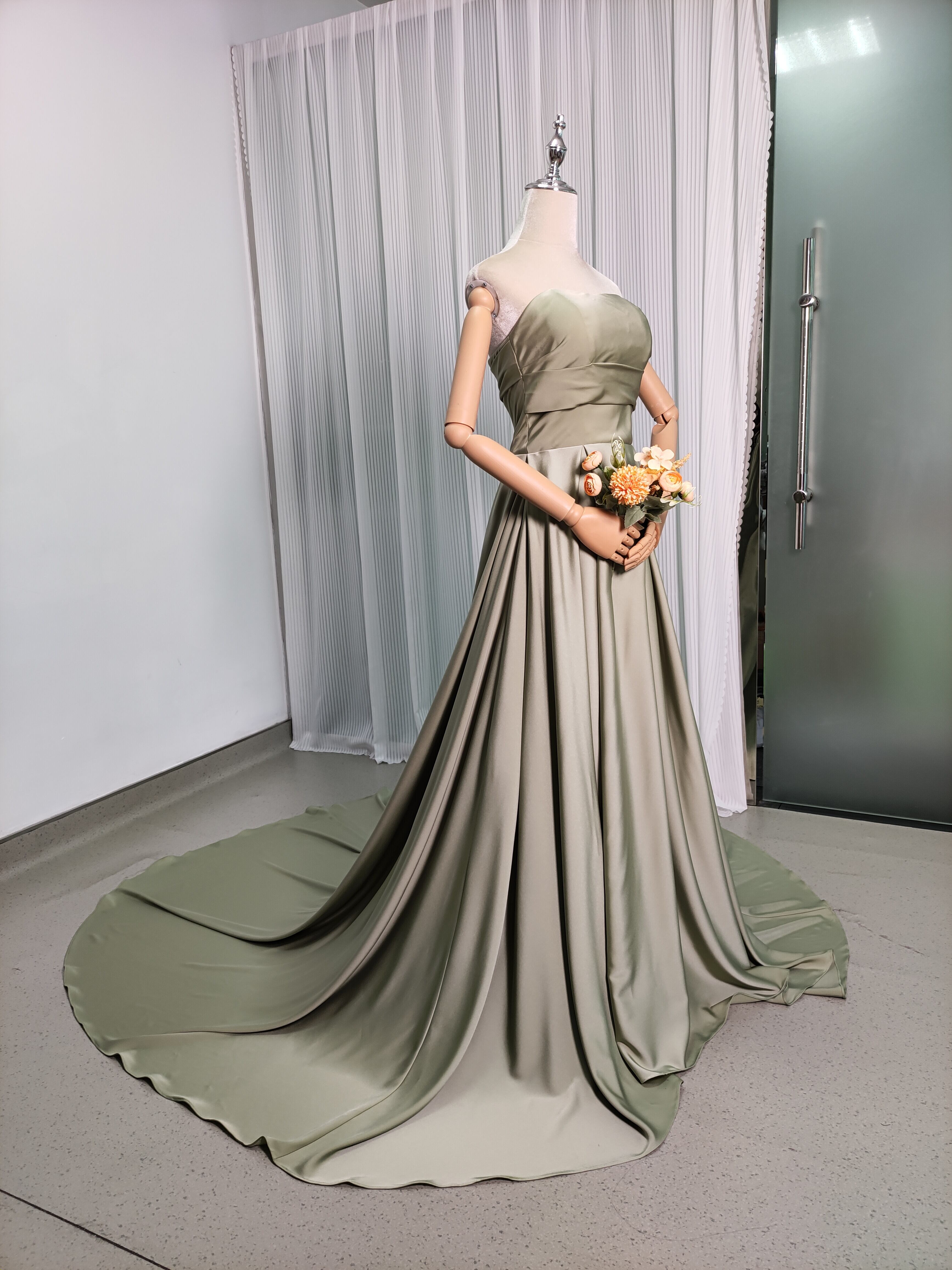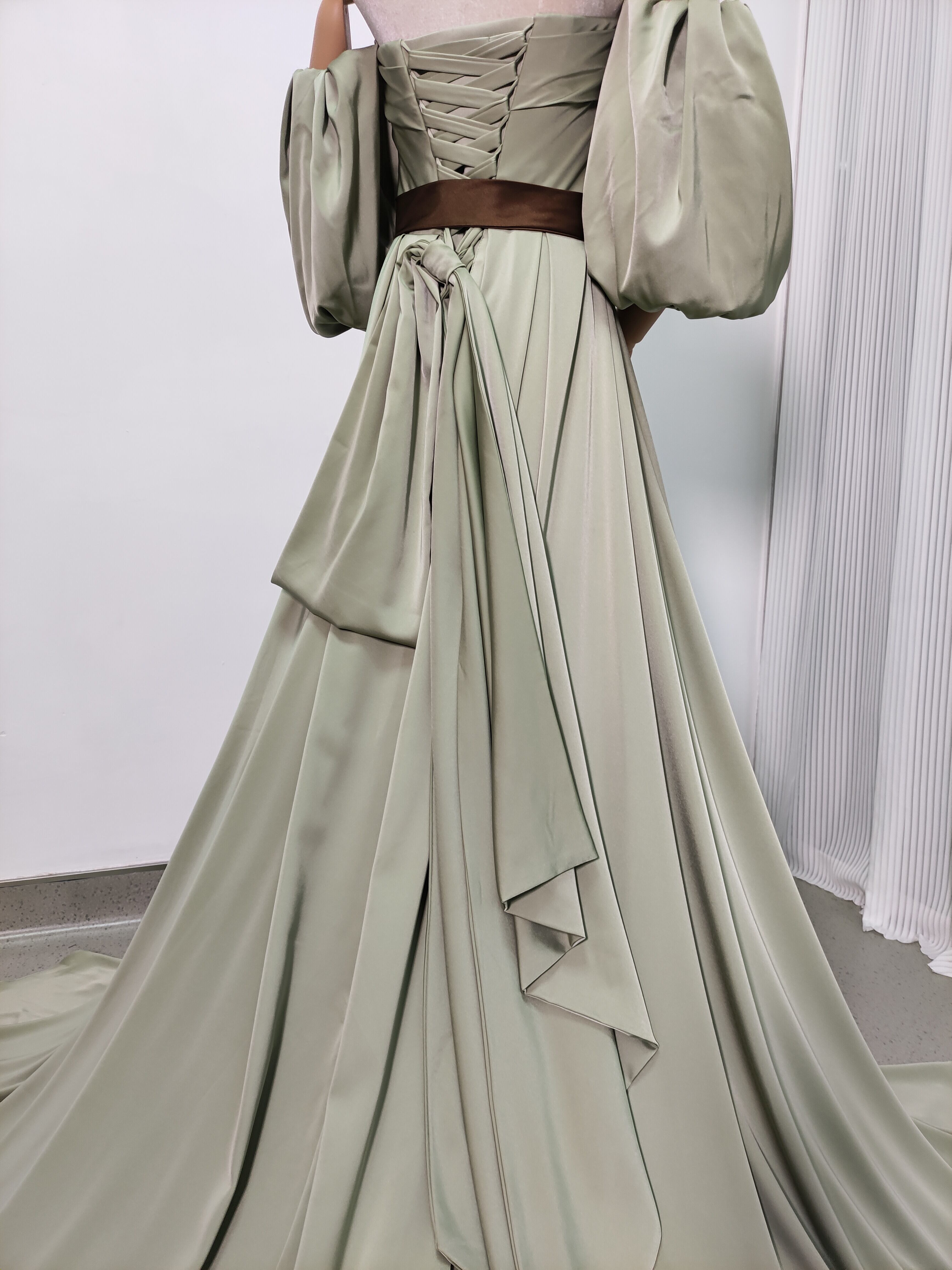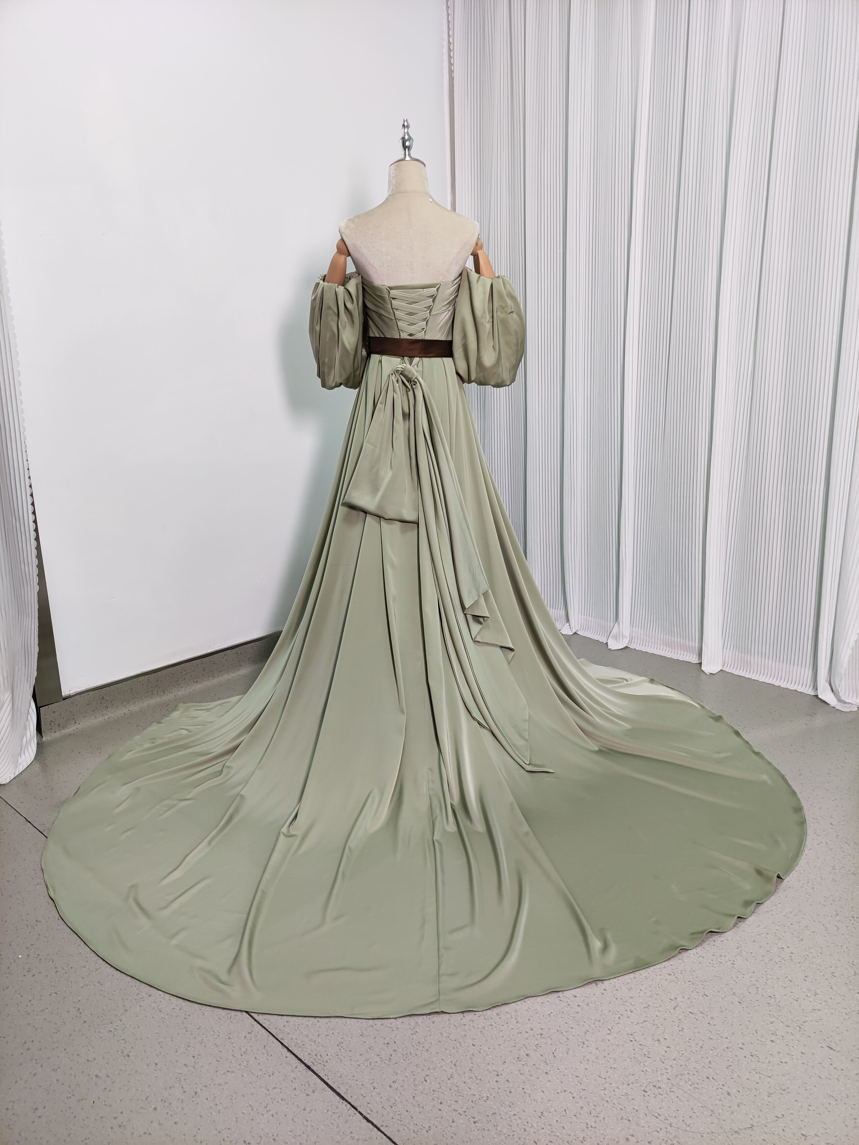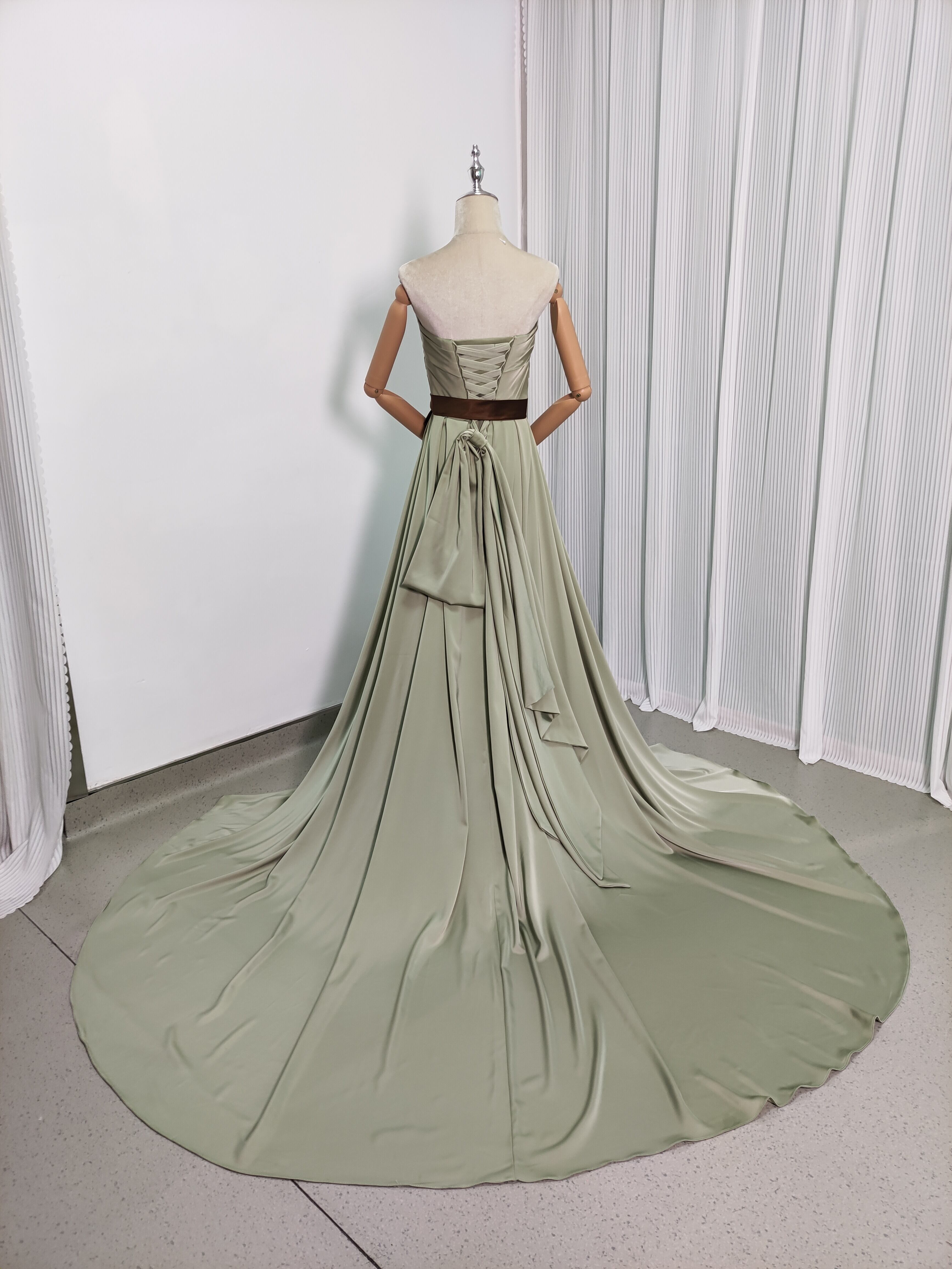 グリーン ベアトップ カラードレス 取り外し袖 華やかなトレーン ふっくら柔らかなバックリボン エンパイアライン結婚式
