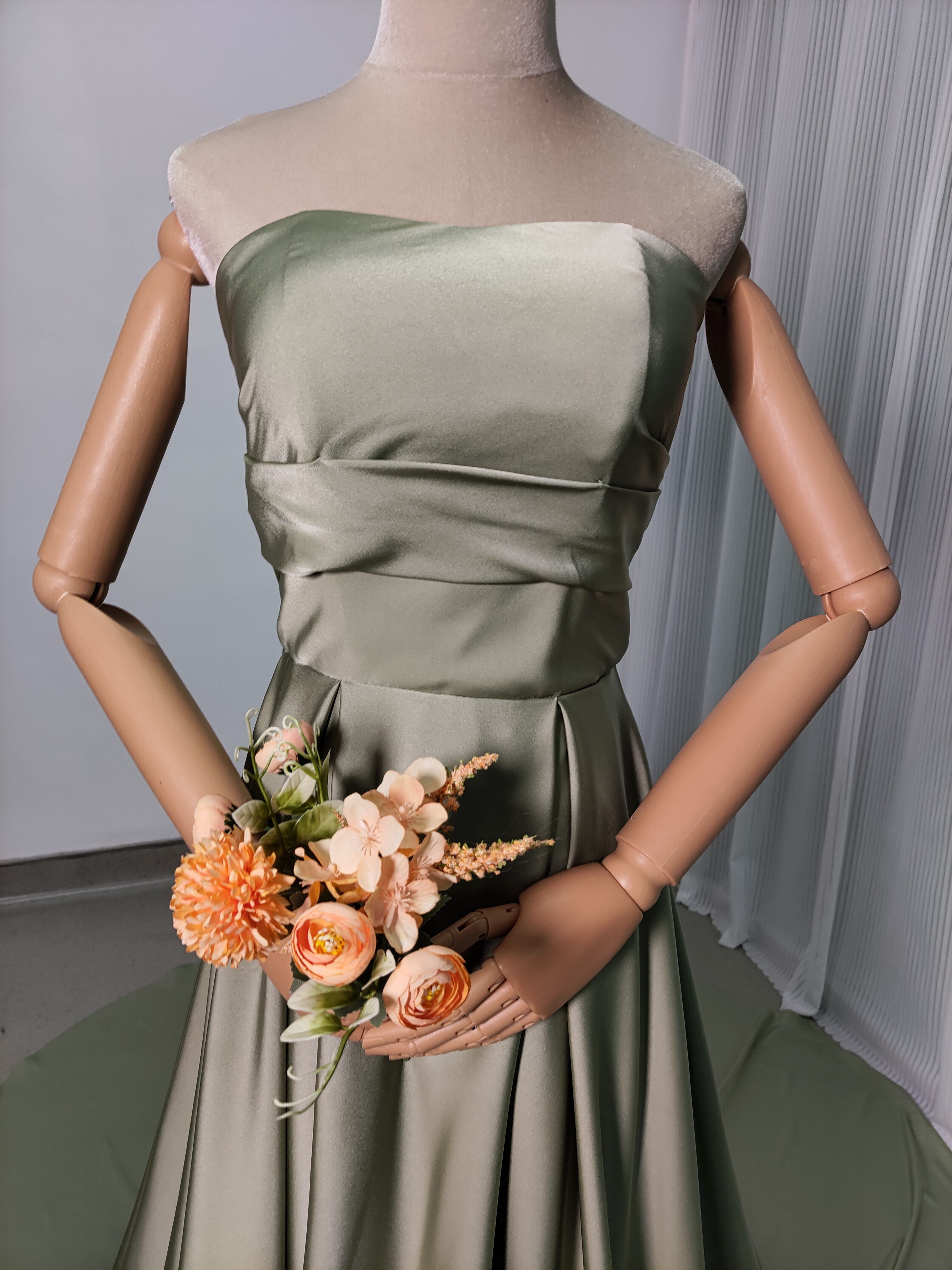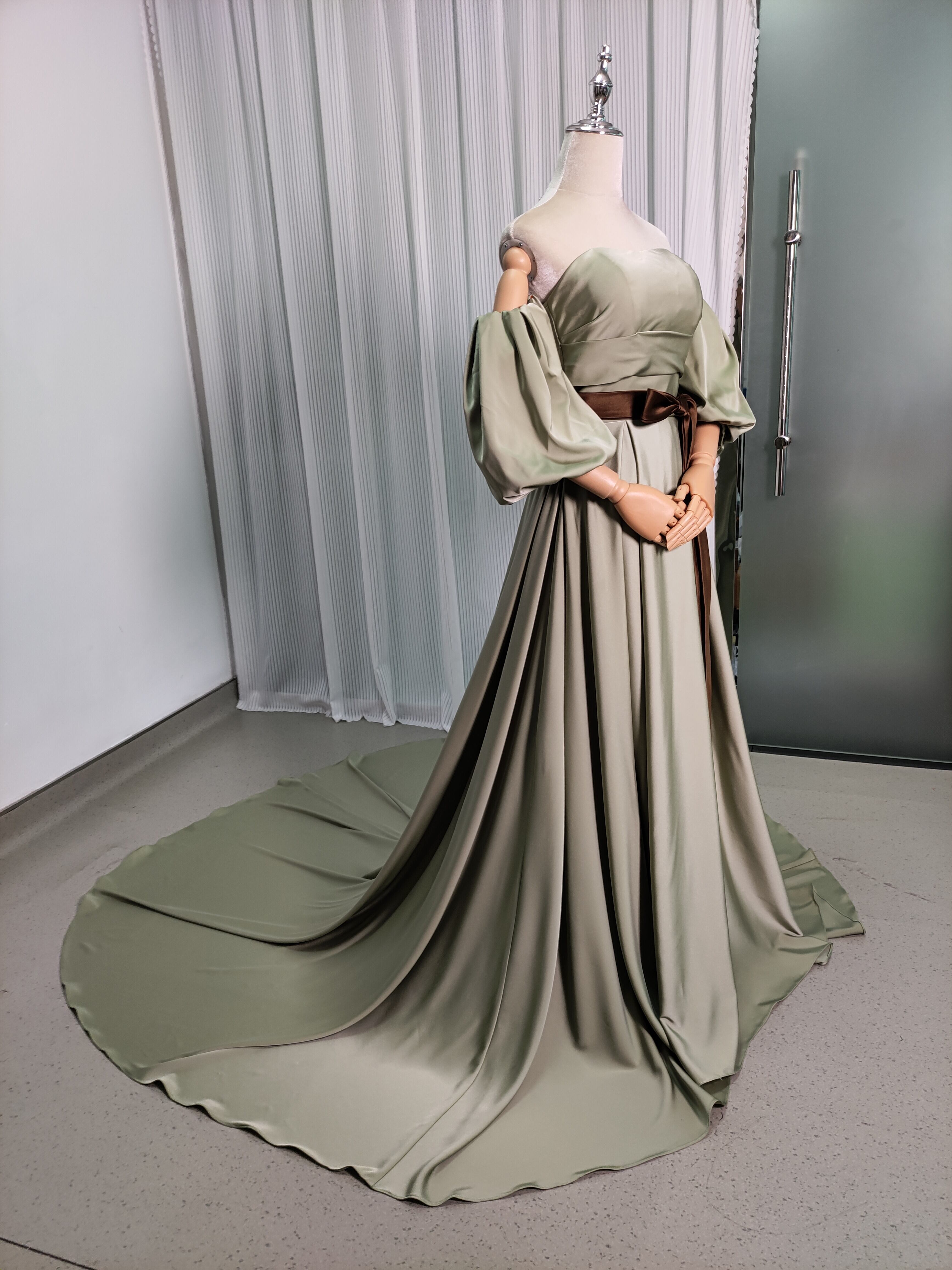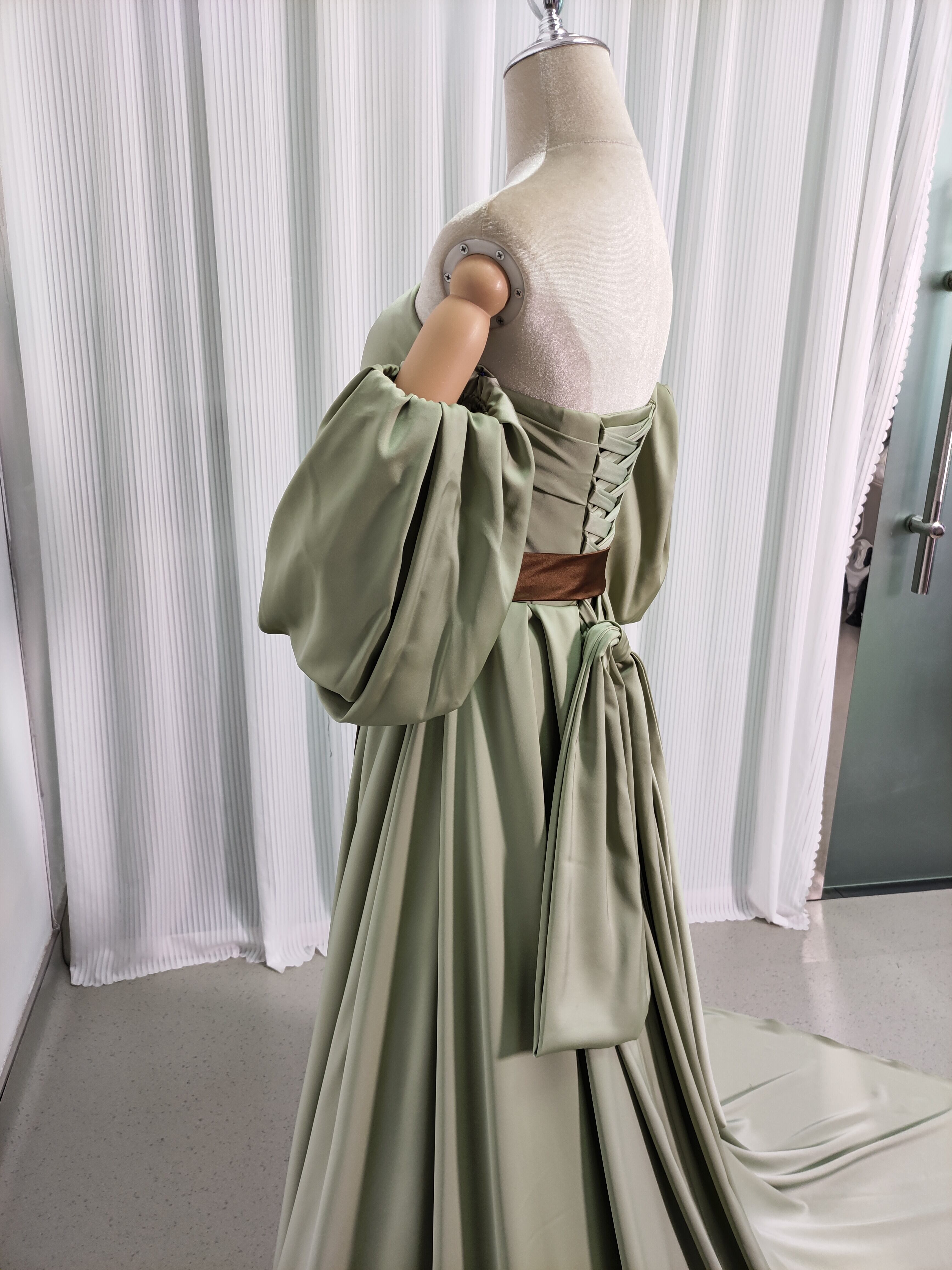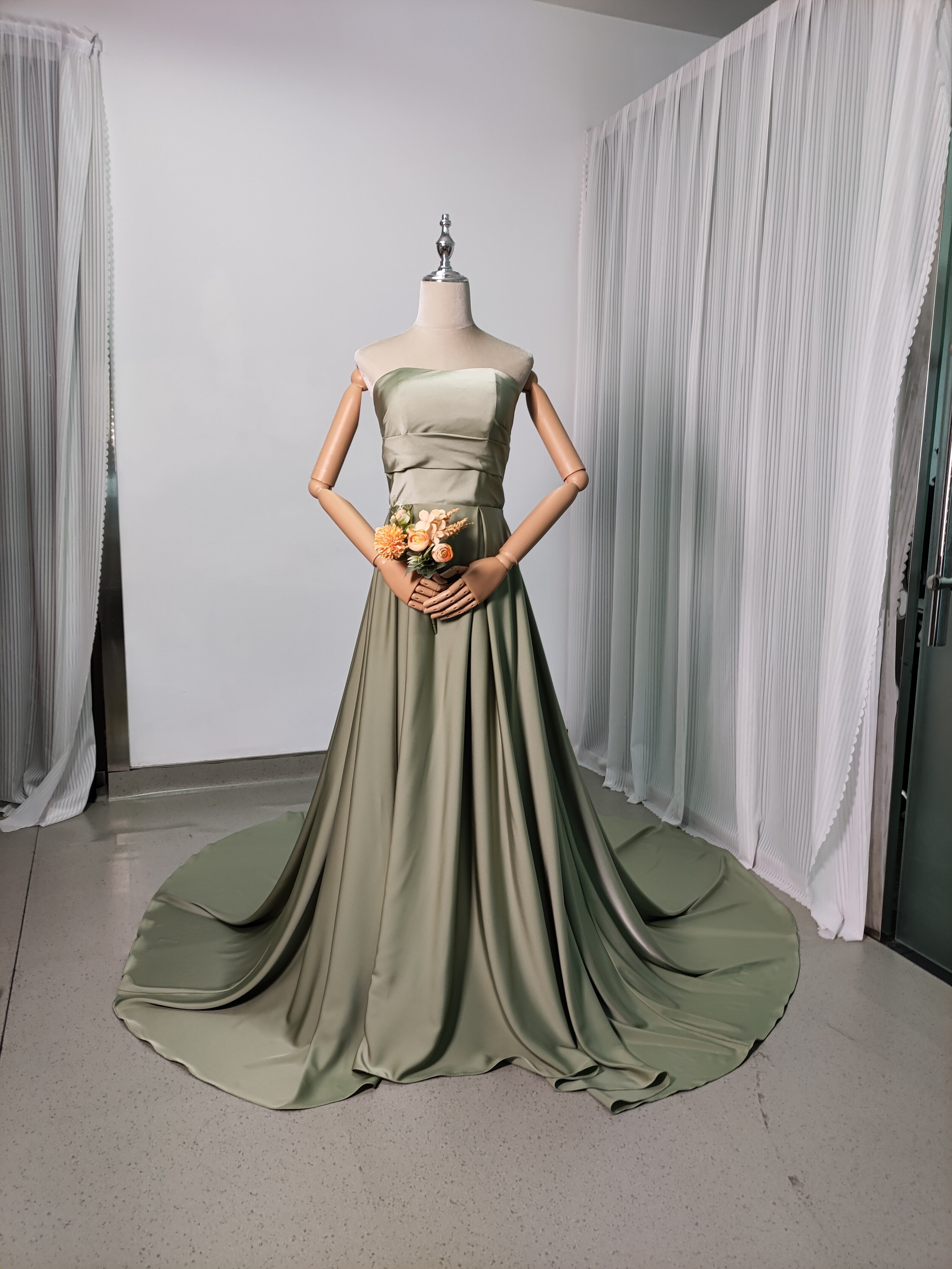 グリーン ベアトップ カラードレス 取り外し袖 華やかなトレーン ふっくら柔らかなバックリボン エンパイアライン結婚式