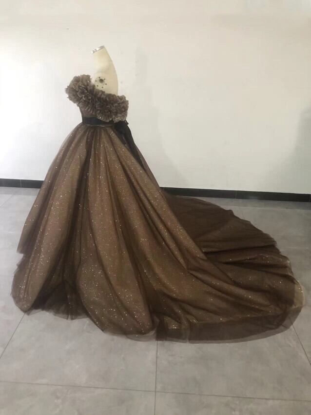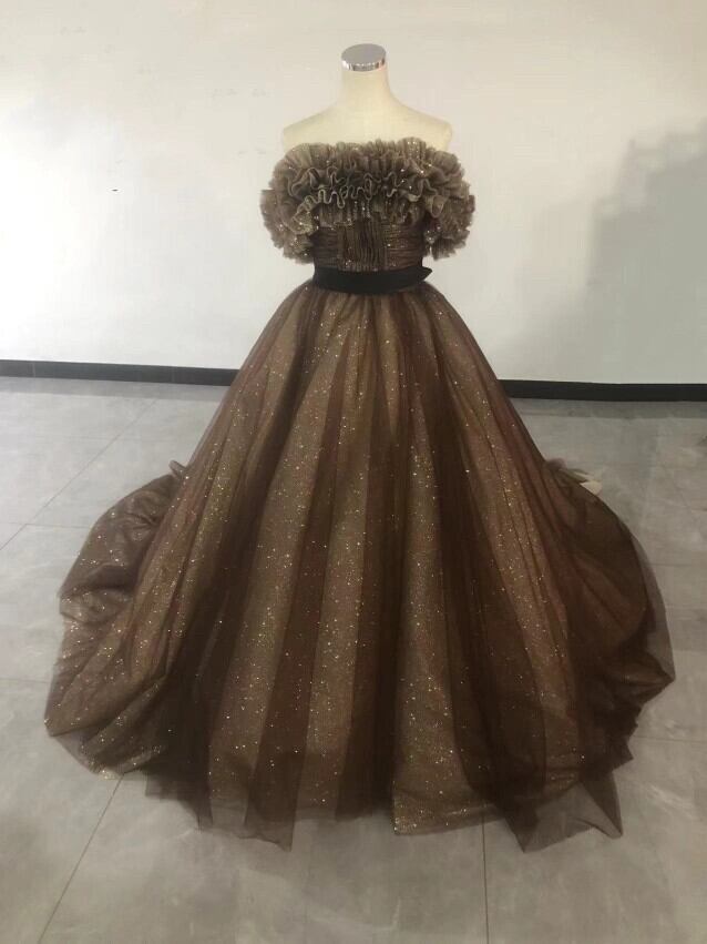 取り外しオフショルダー コーヒーの色 カラードレス キラキラチュール ソフトチュール ト華やかなトレ/前撮り/結婚式