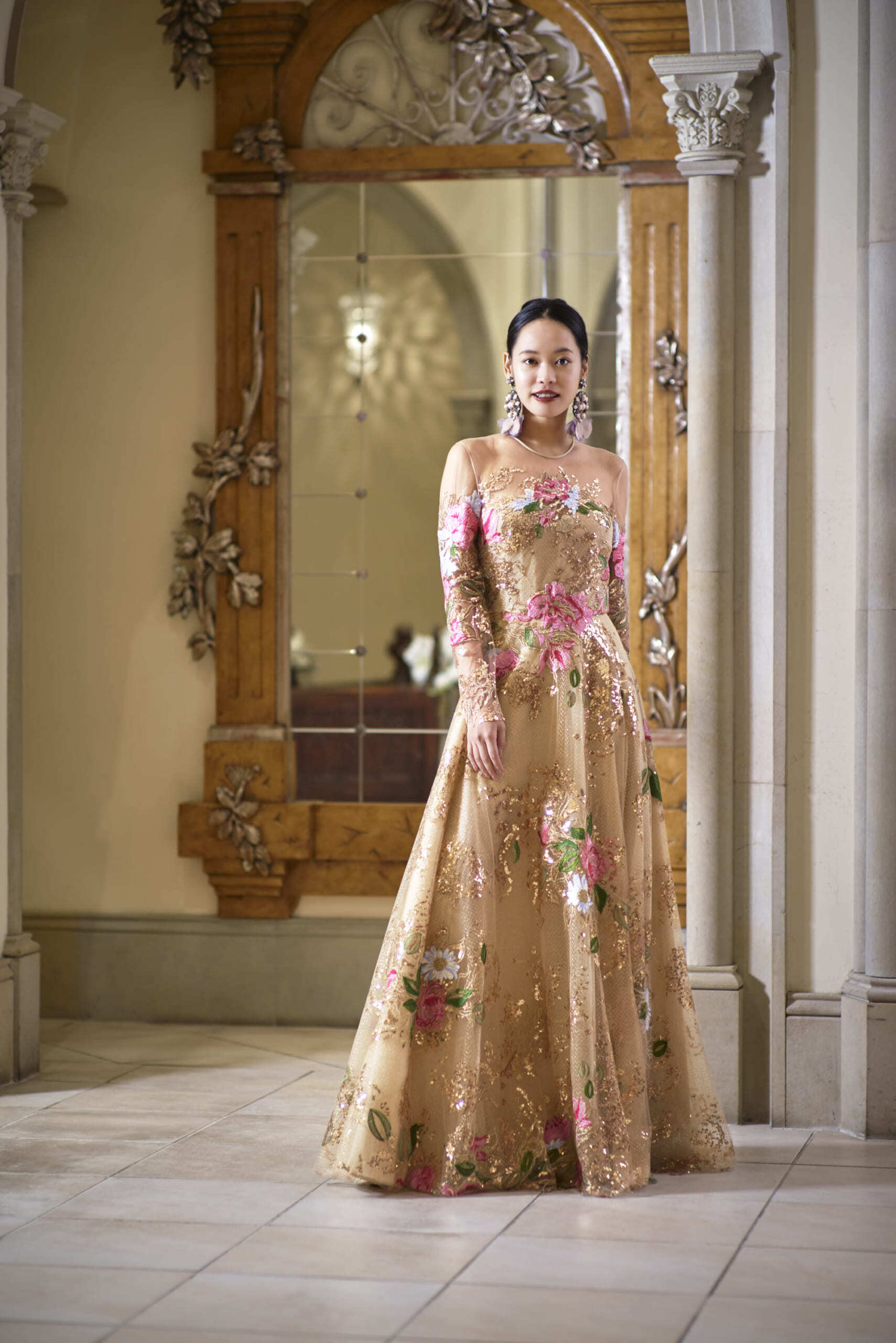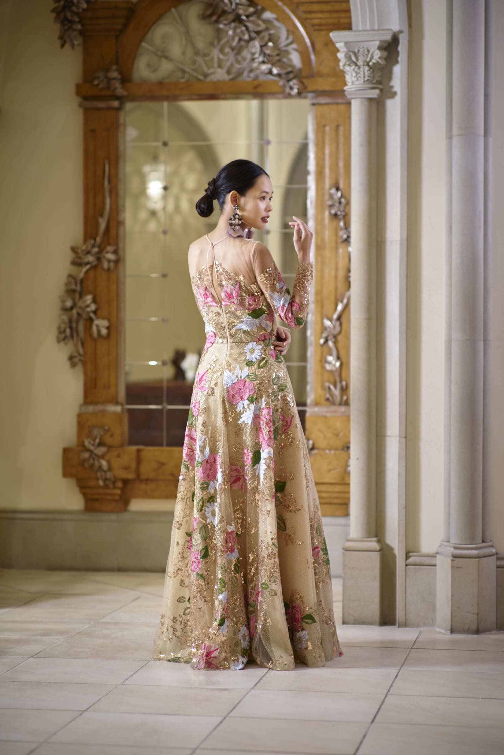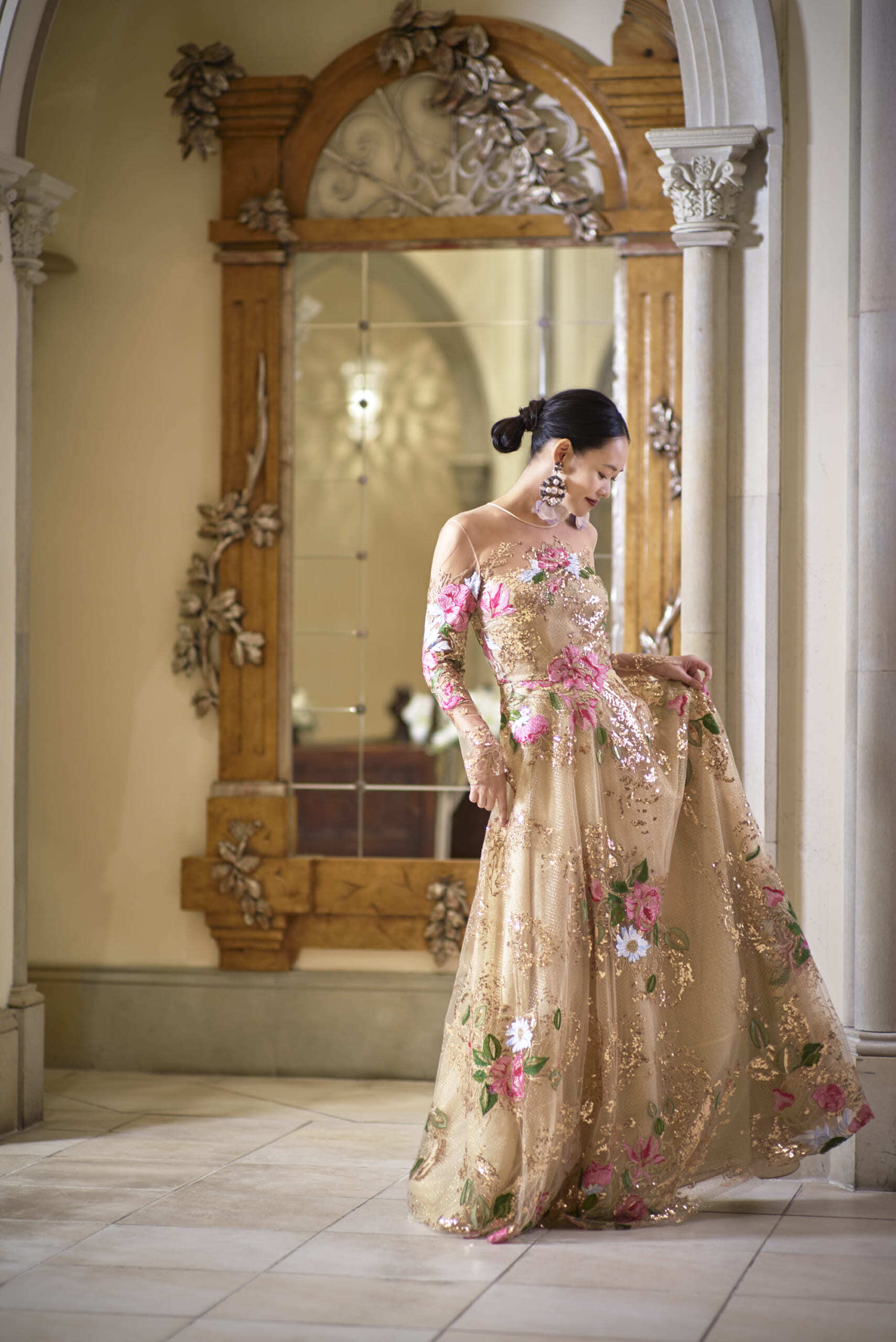 クラシカル カラードレス アンティークなドレス 金色 3D立体レース刺繍 抜群のおしゃれ見え 2次会/前撮り ミディアムドレス セレモニー パーティードレス 演奏ドレス ステージ ピアノ | David1021k Dress(ダヴィドレス)