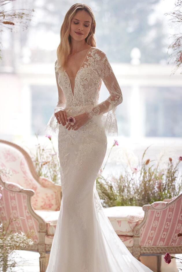 豪華!送料無料!ウエディングドレス レースドレス マーメイドライン セクシー 上品レース 長袖 かわいい ソフトチュール フレア袖/ラッパ袖 花柄のモチーフ刺繍が美しく トレーン オーダードレス ハンドメイド エレガント 優雅 花嫁 ハンドメイド オーダードレス 結婚式/前撮り/二次会/2次会/披露宴/演奏会/音楽会 ガーデンウェディング | David1021k Dress(ダヴィドレス)