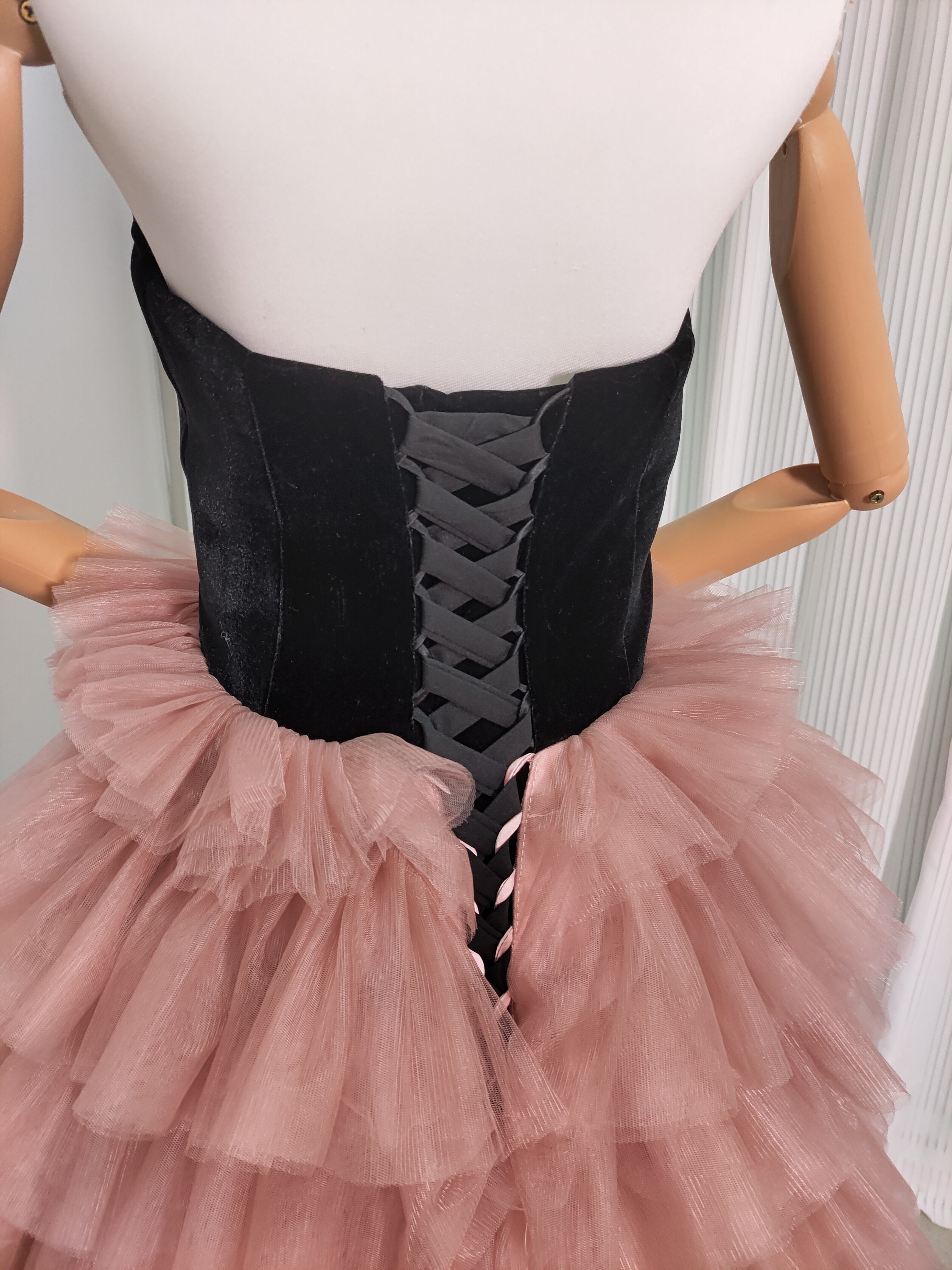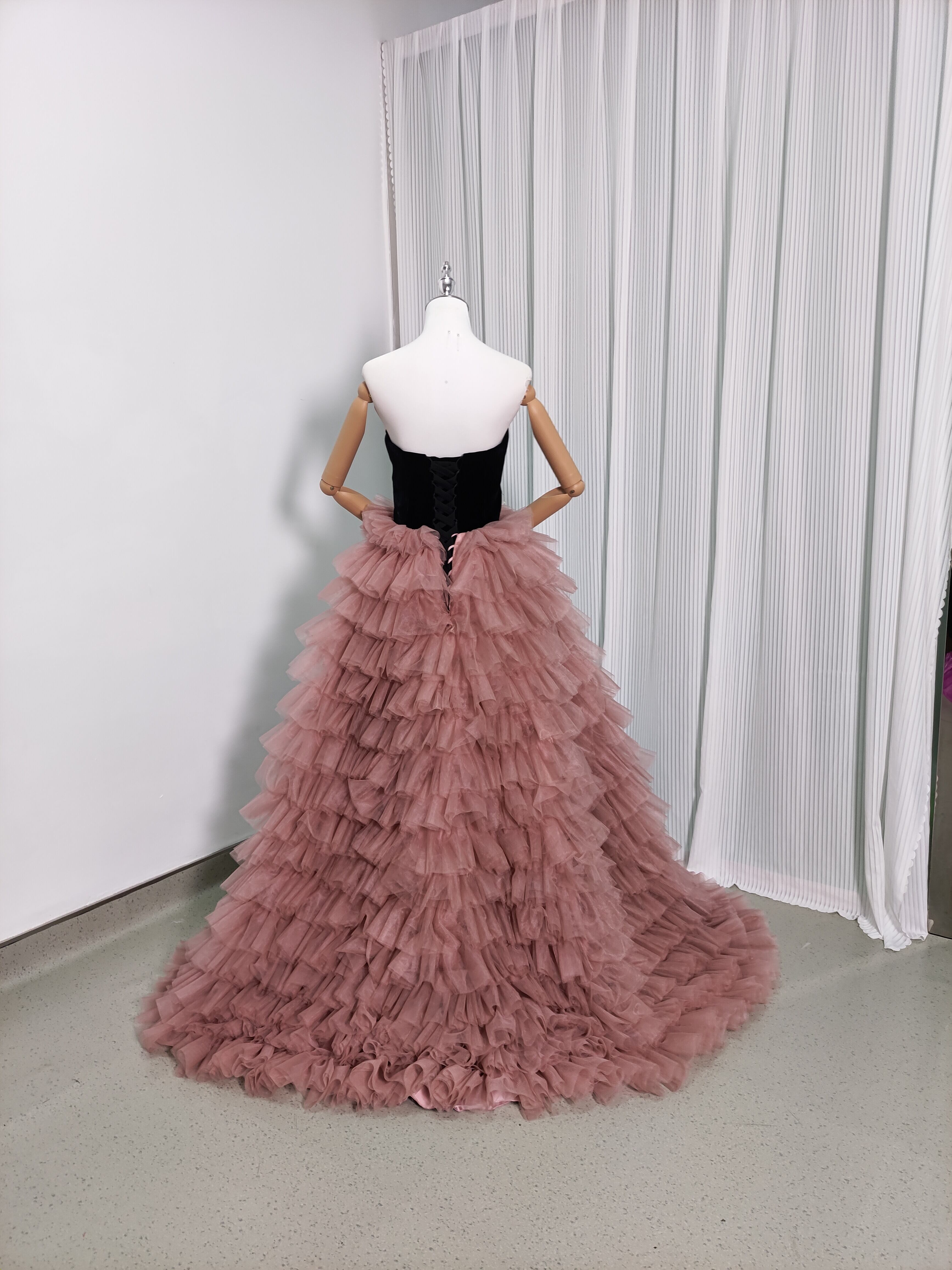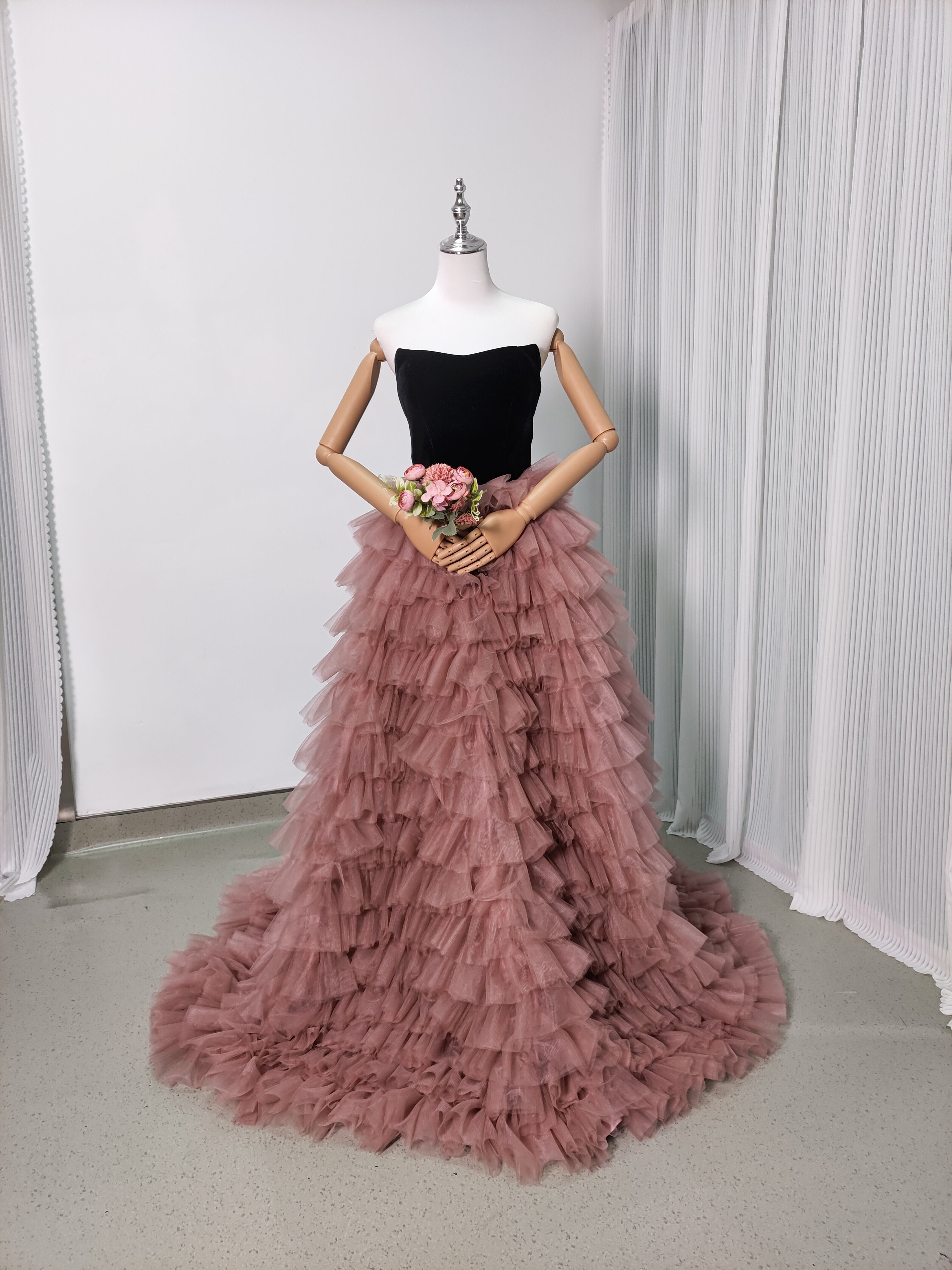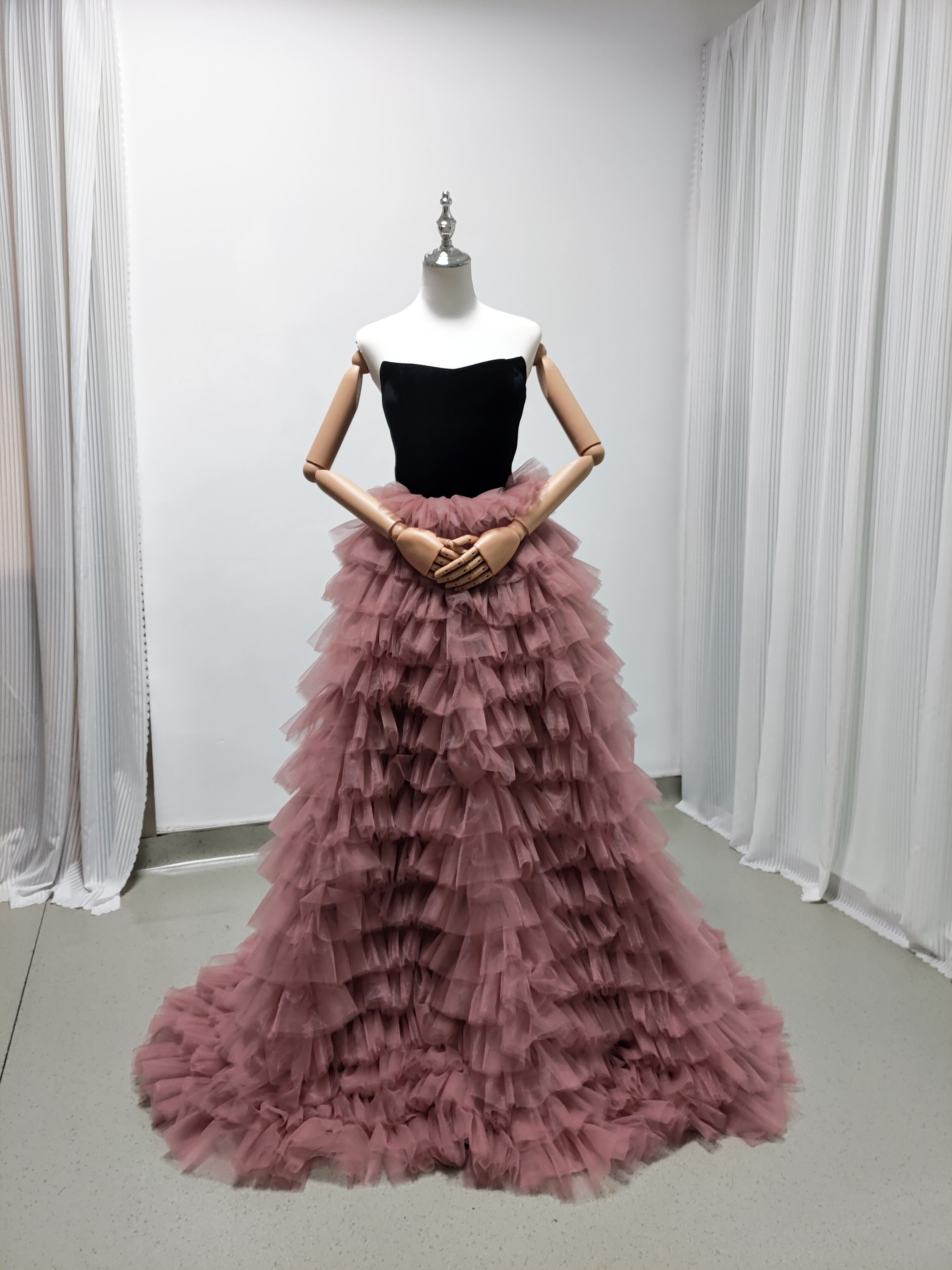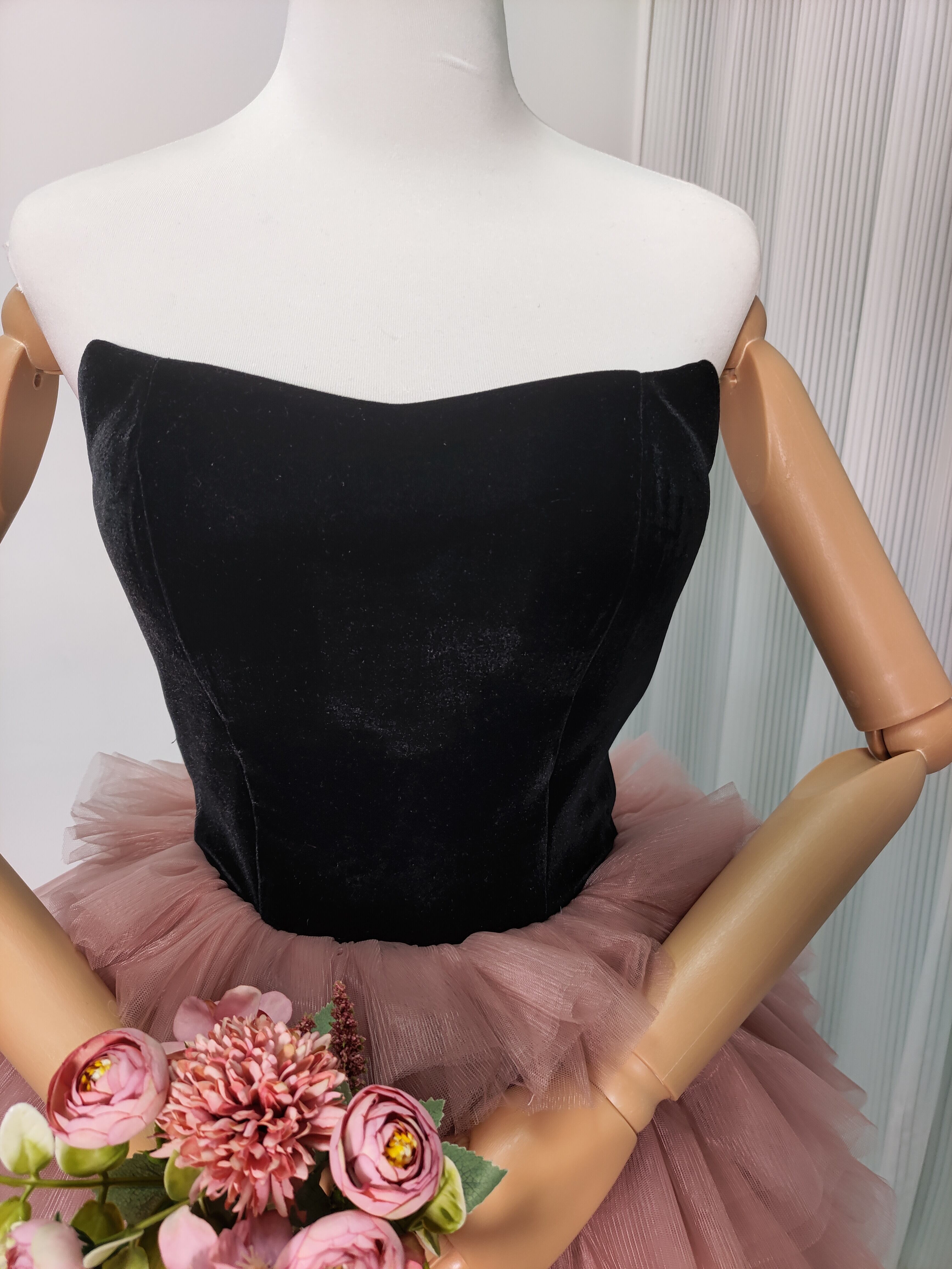 黒 高級ベロアベアトップ カラードレス ソフトチュール 重ねたチュールスカート華やかなトレボリュームドレス/前撮り/結婚