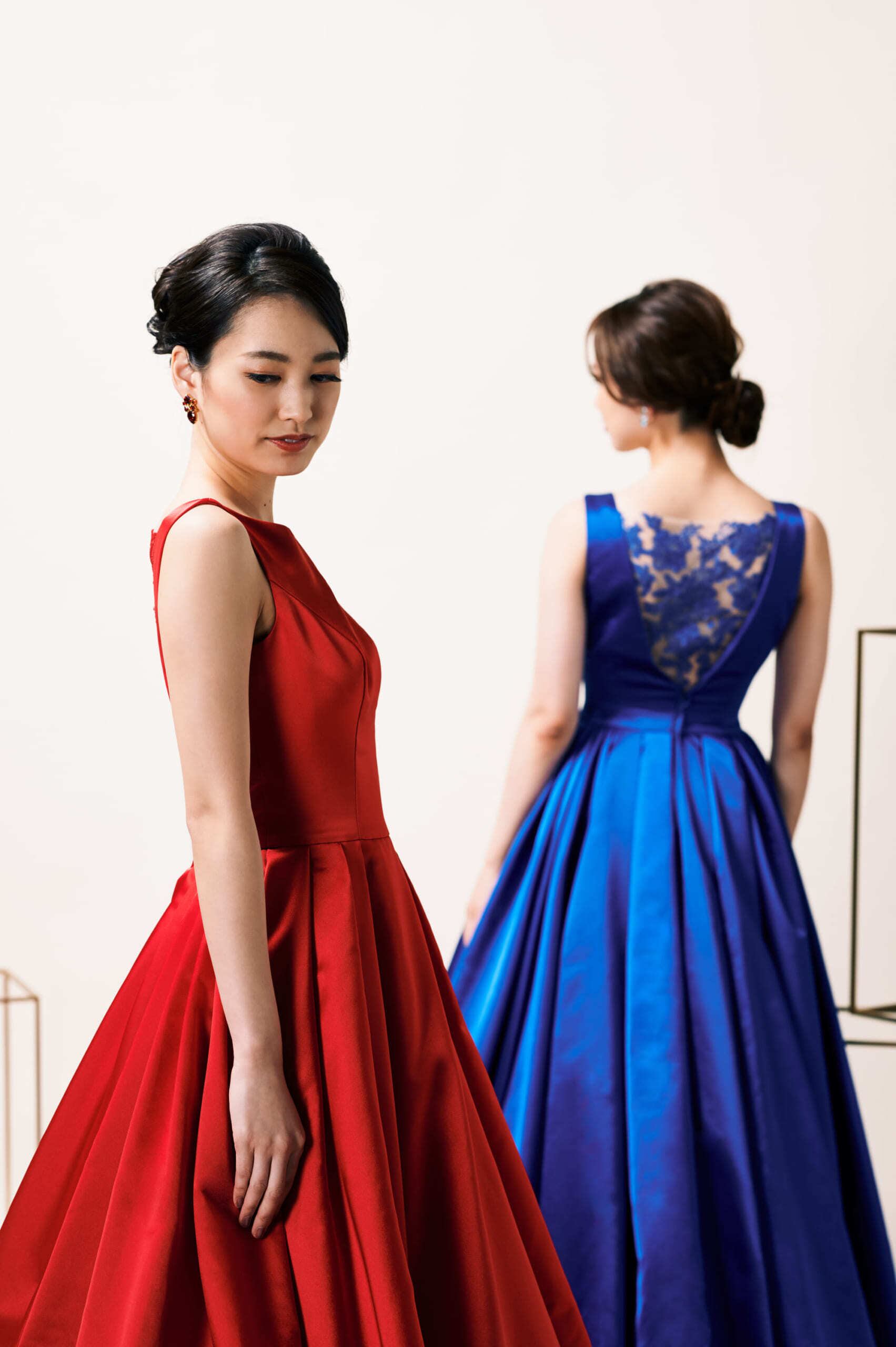 送料無料!カラードレス 赤/レッド ブルー/ネイビー色 ノースリーブ 上品レース Aライン 高級サテン かわいい エレガント 優雅 オーダードレス ハンドメイド 花嫁 結婚式/前撮り/二次会 セレモニー イブニングドレス 合コン パーティドレス ミディアムドレス | David1021k Dress(ダヴィドレス)