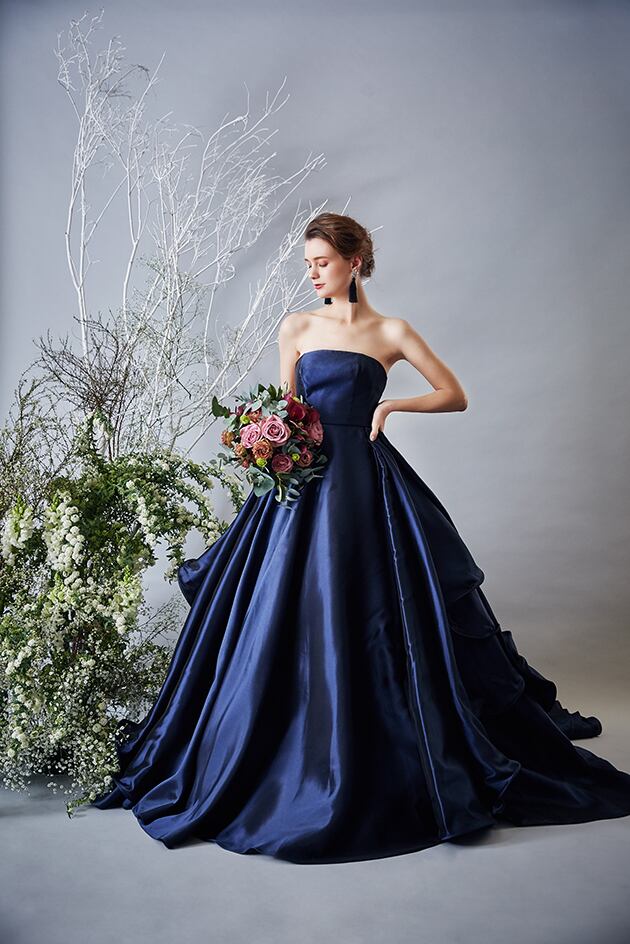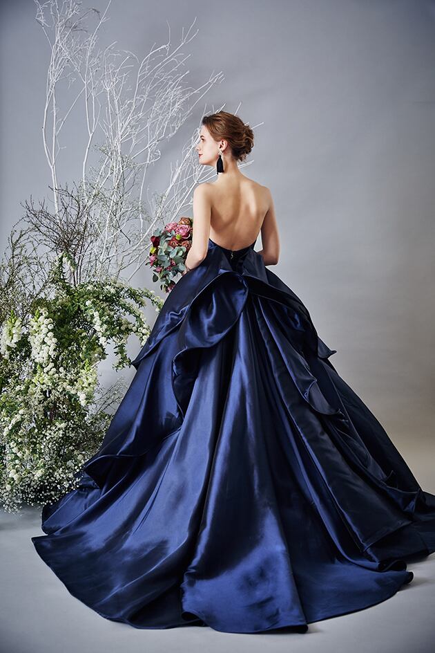 送料無料!カラードレス ネイビー色 ベアトップ 華やかなトレーン 取り外しリボン プリンセスライン バックリボン かわいい 高級サテン トレーン オーダードレス ハンドメイド エレガント 優雅 花嫁 豪華 ハンドメイド オーダードレス ウエディングドレス 結婚式/前撮り/二次会/2次会/披露宴/演奏会/音楽会 ガーデンウェディング | David1021k Dress(ダヴィドレス)