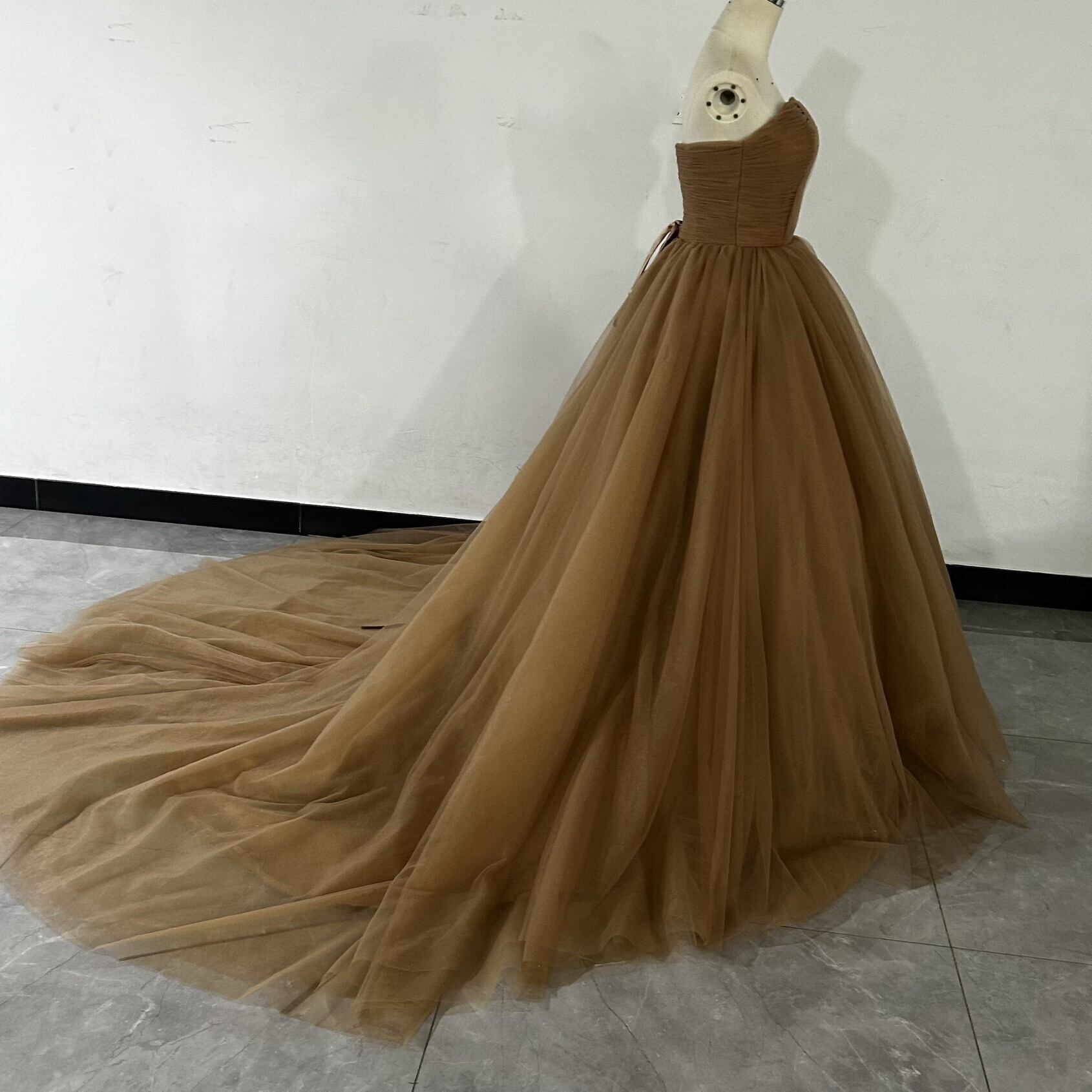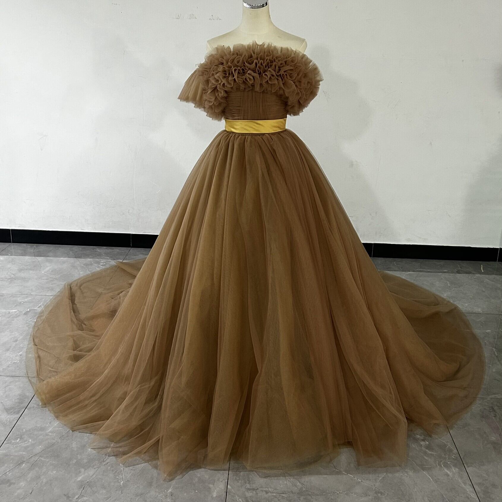 ブラウンカラードレス オフショルダーの2WAYドレス ロングトレーン パーティードレス お色直し