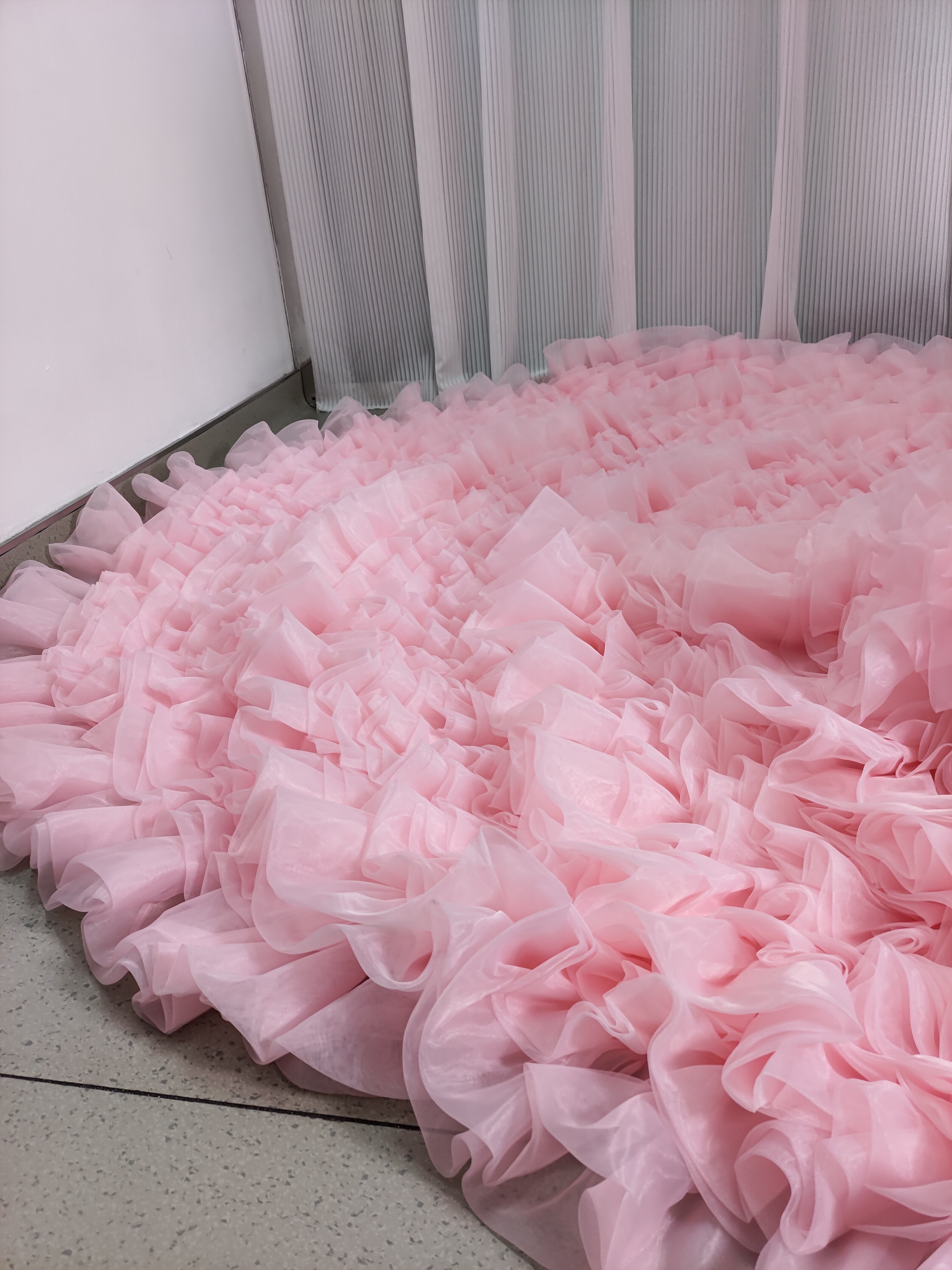 オフショルダー ピンクカラードレス オーガンジー ボリューミー豪華! 華やかなトレーン ボリュームドレス/前撮り/結婚式