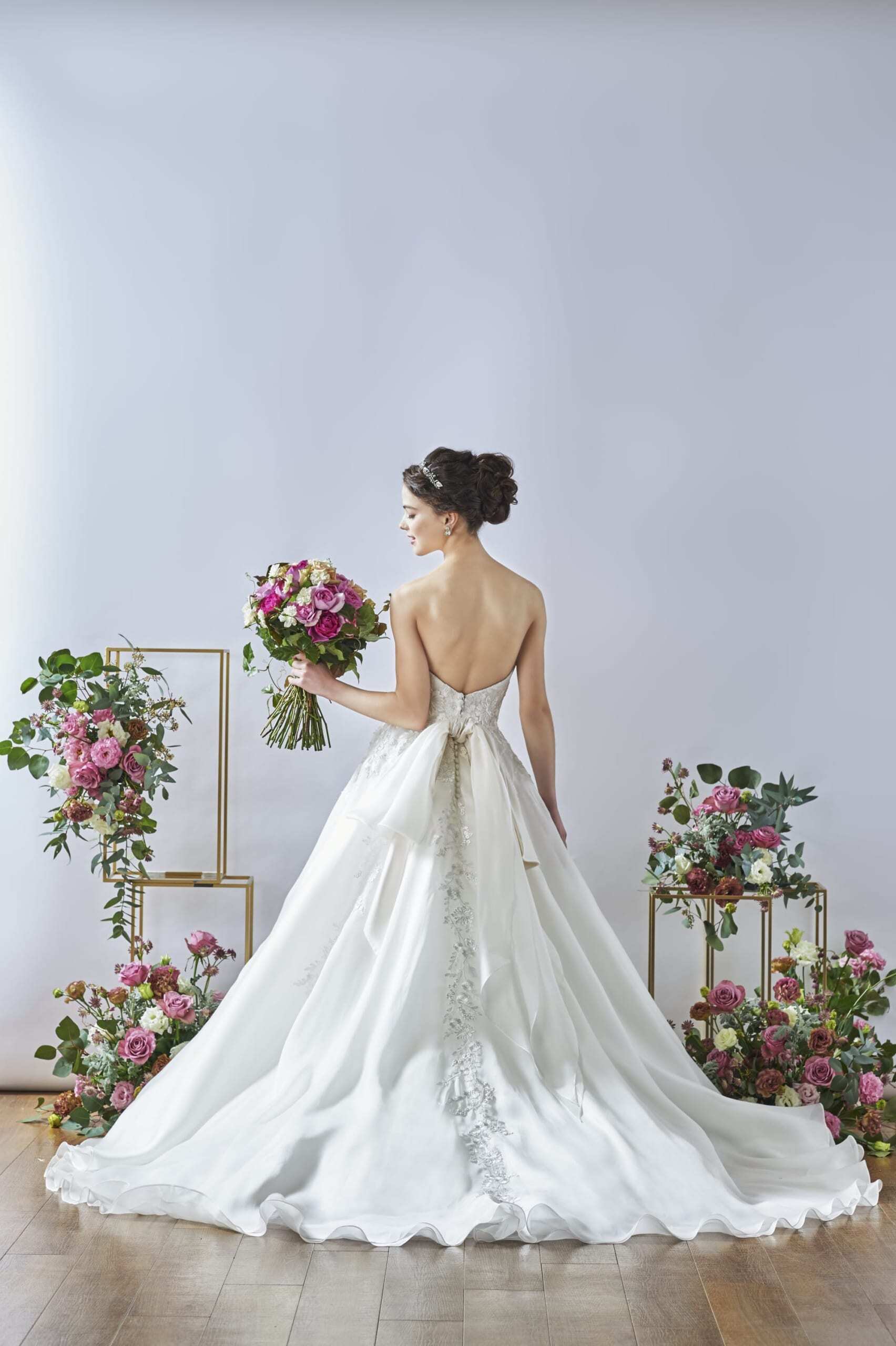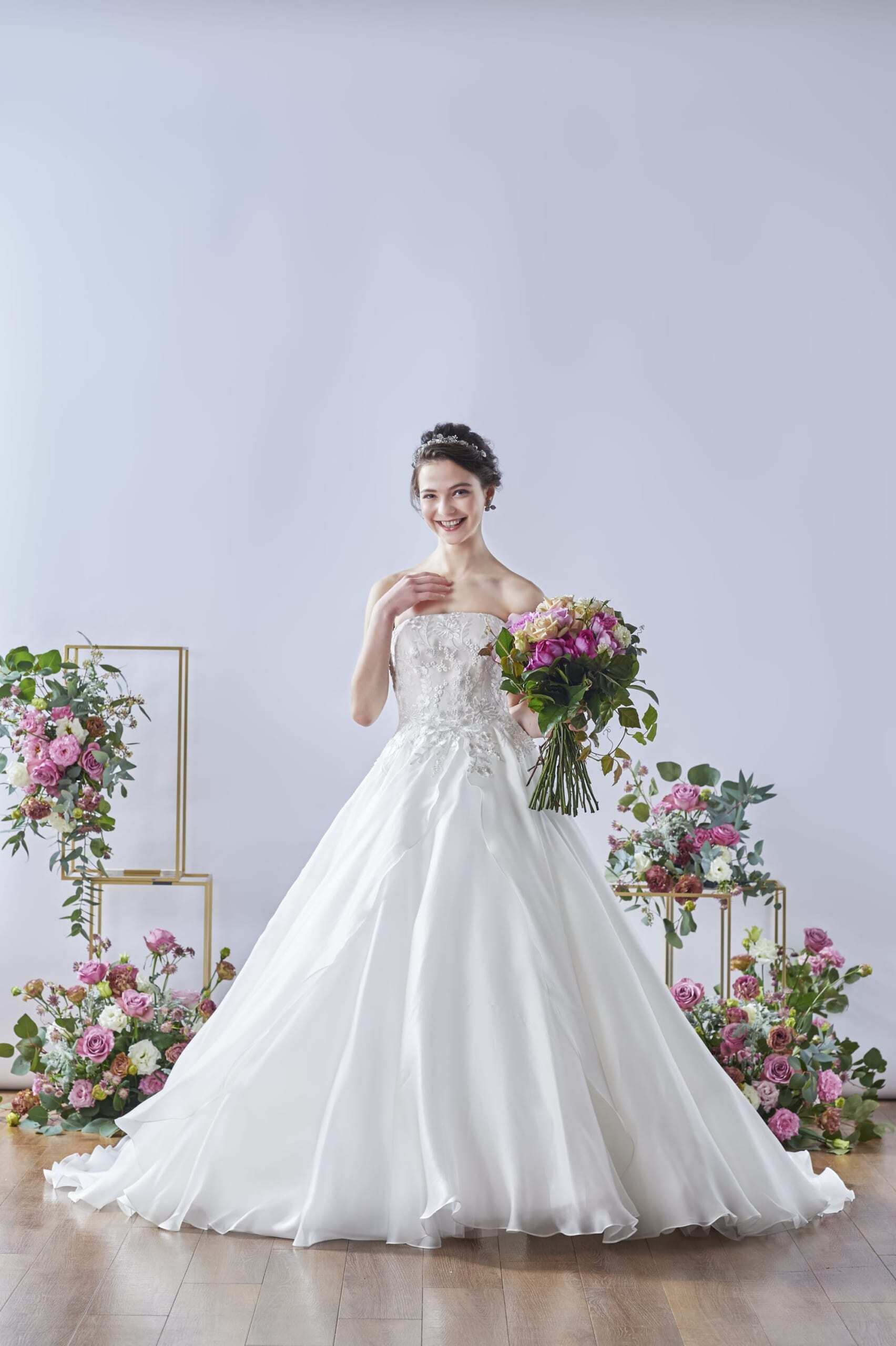 送料無料!ウエディングドレス ベアトップ 花柄のモチーフ刺繍が美しく バックリボン 華やかなトレーン 取り外しリボン かわいい 高級サテン トレーン オーダードレス ハンドメイド エレガント 優雅 花嫁 豪華 ハンドメイド オーダードレス 結婚式/前撮り/二次会/2次会/披露宴/演奏会/音楽会 ガーデンウェディング | David1021k Dress(ダヴィドレス)