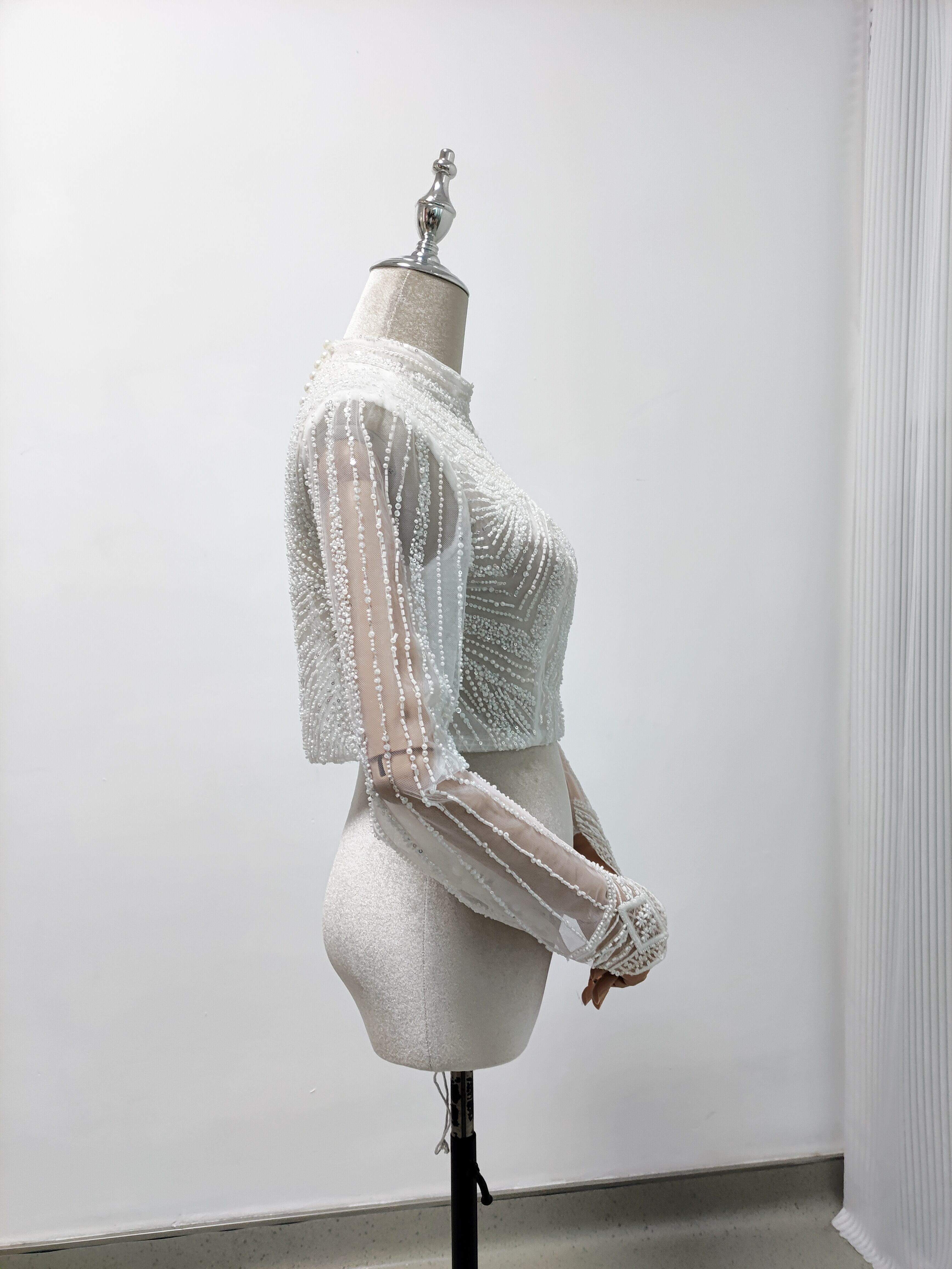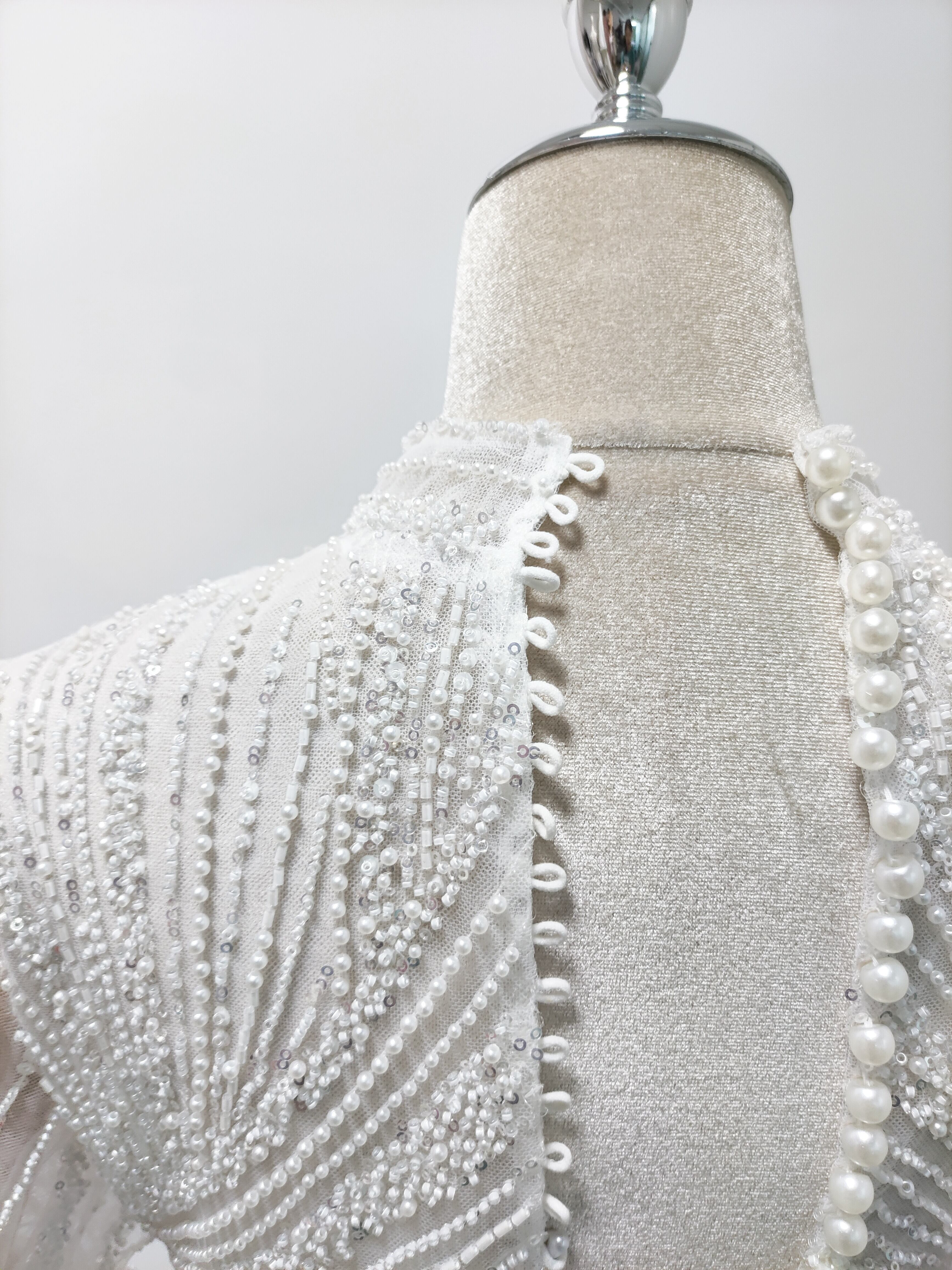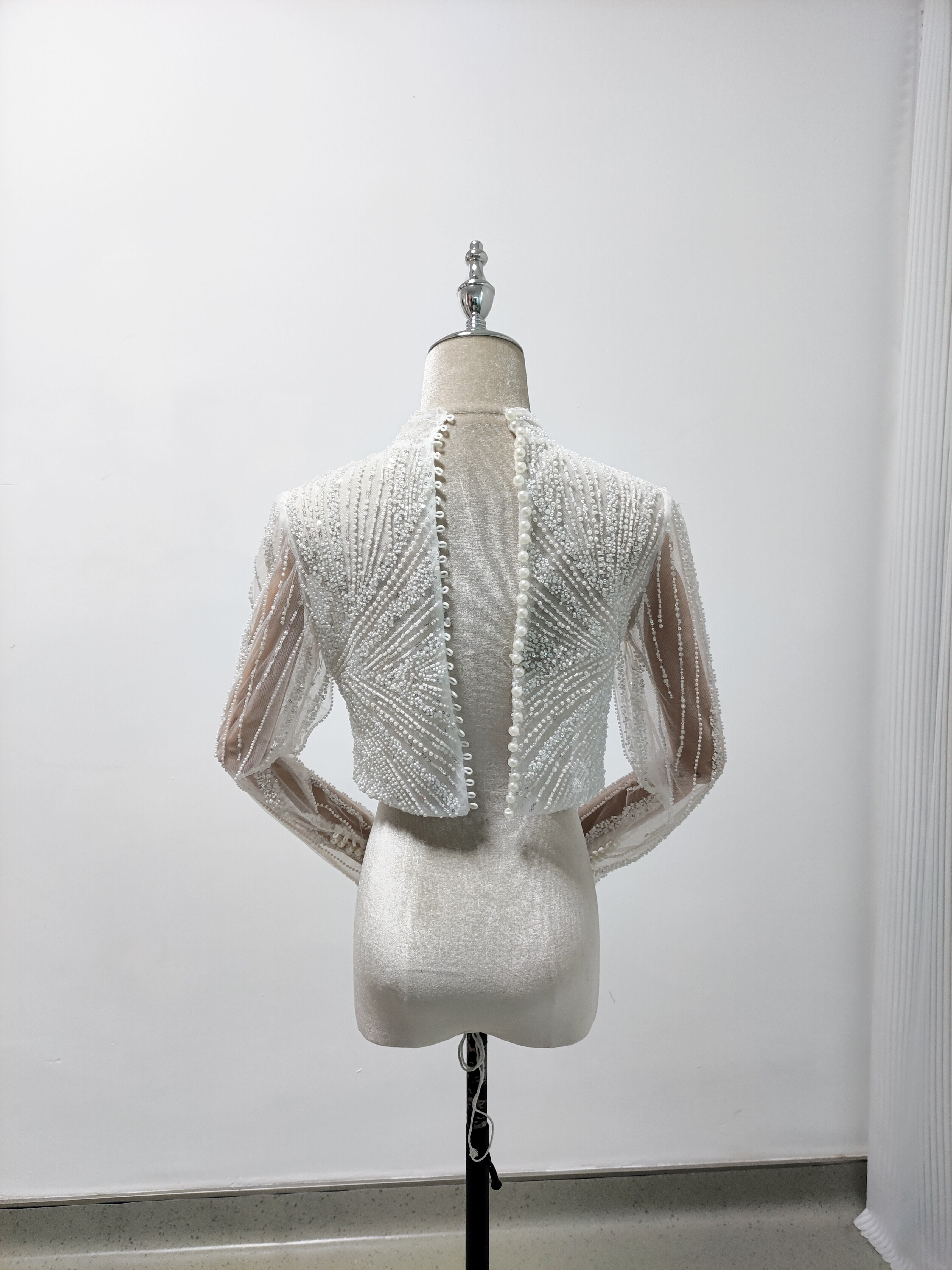 上品なくるみボタン ハイネック レースボレロ ビジュートップス キラキラのハンドビーディング ウエディングドレス