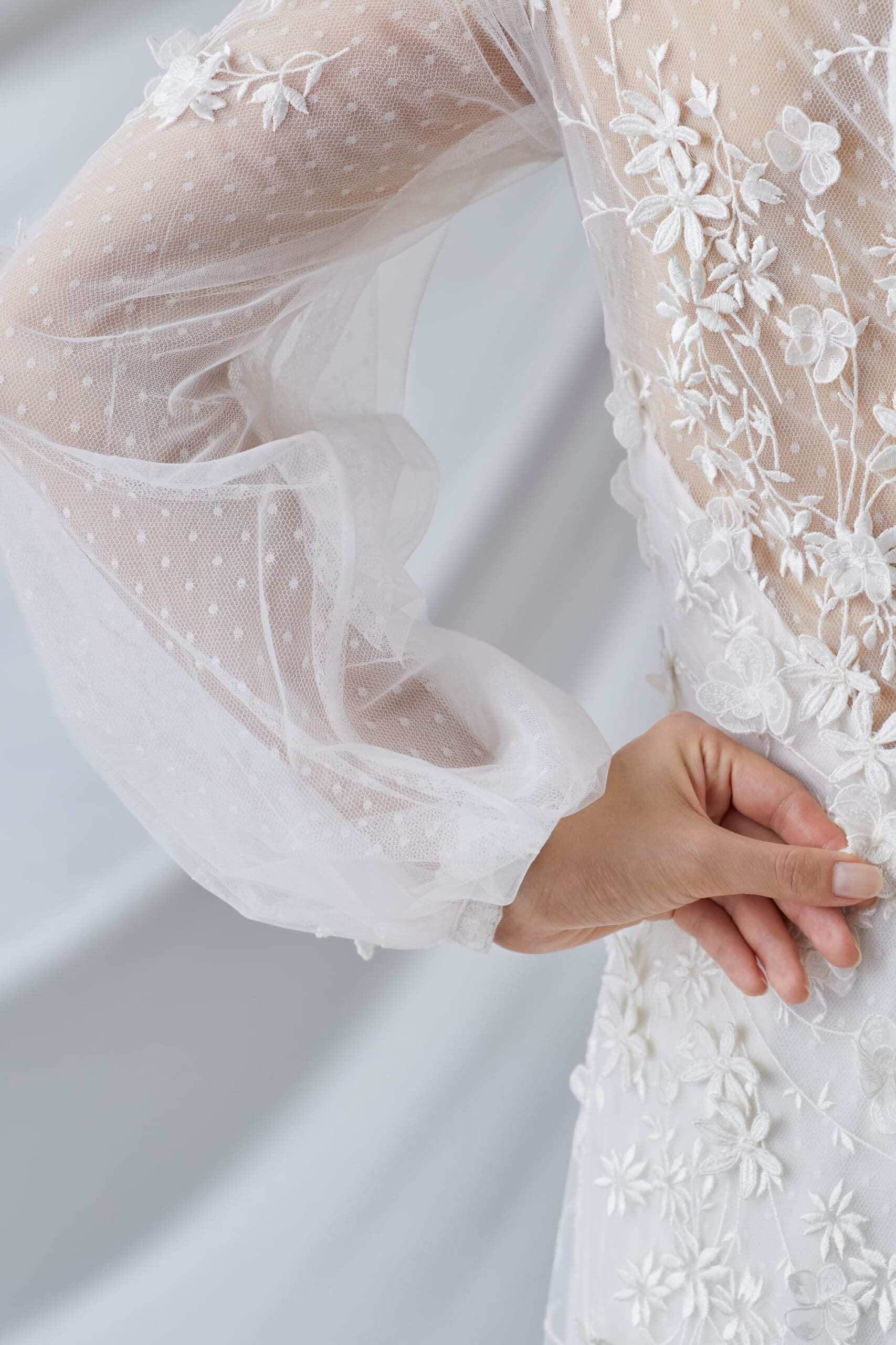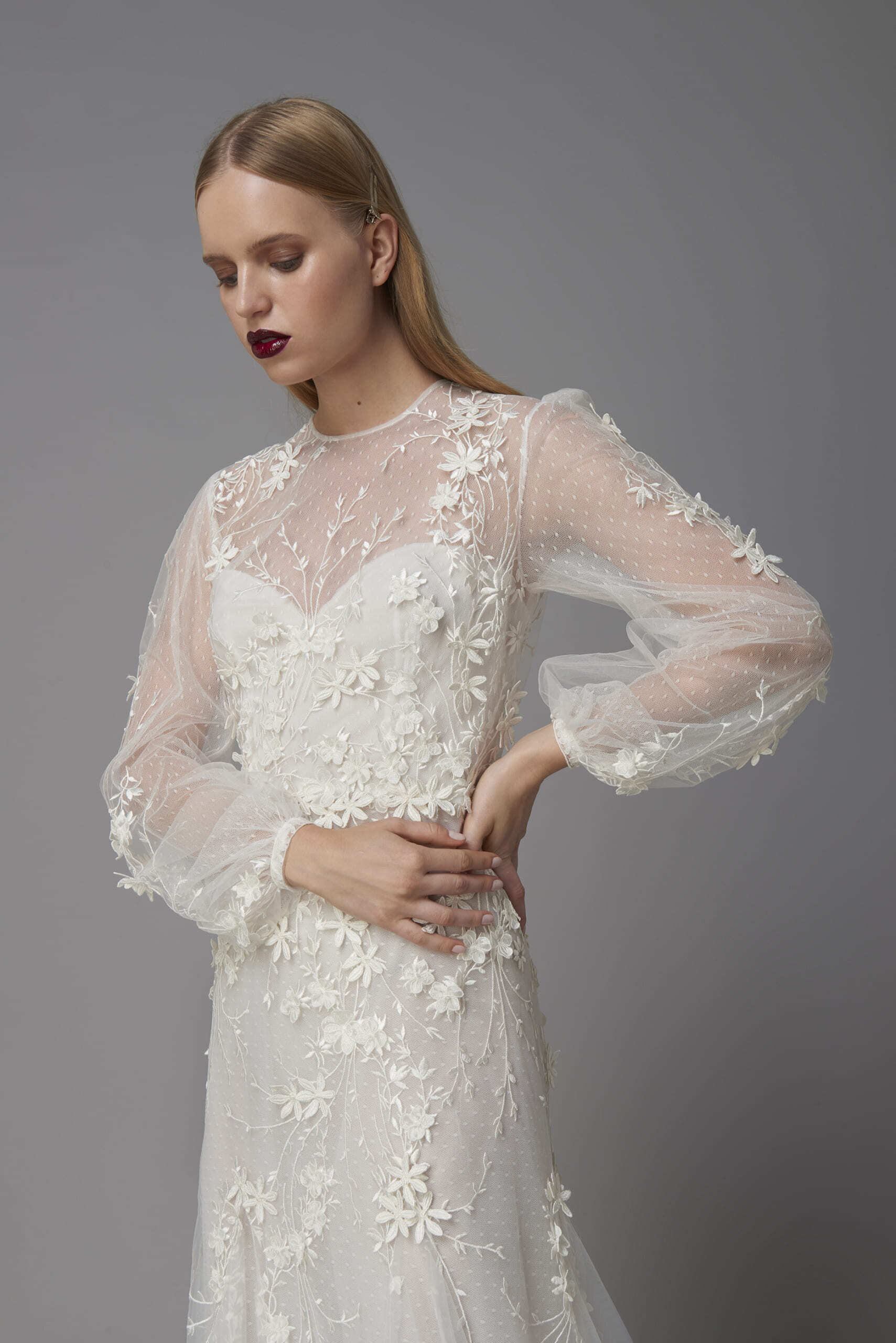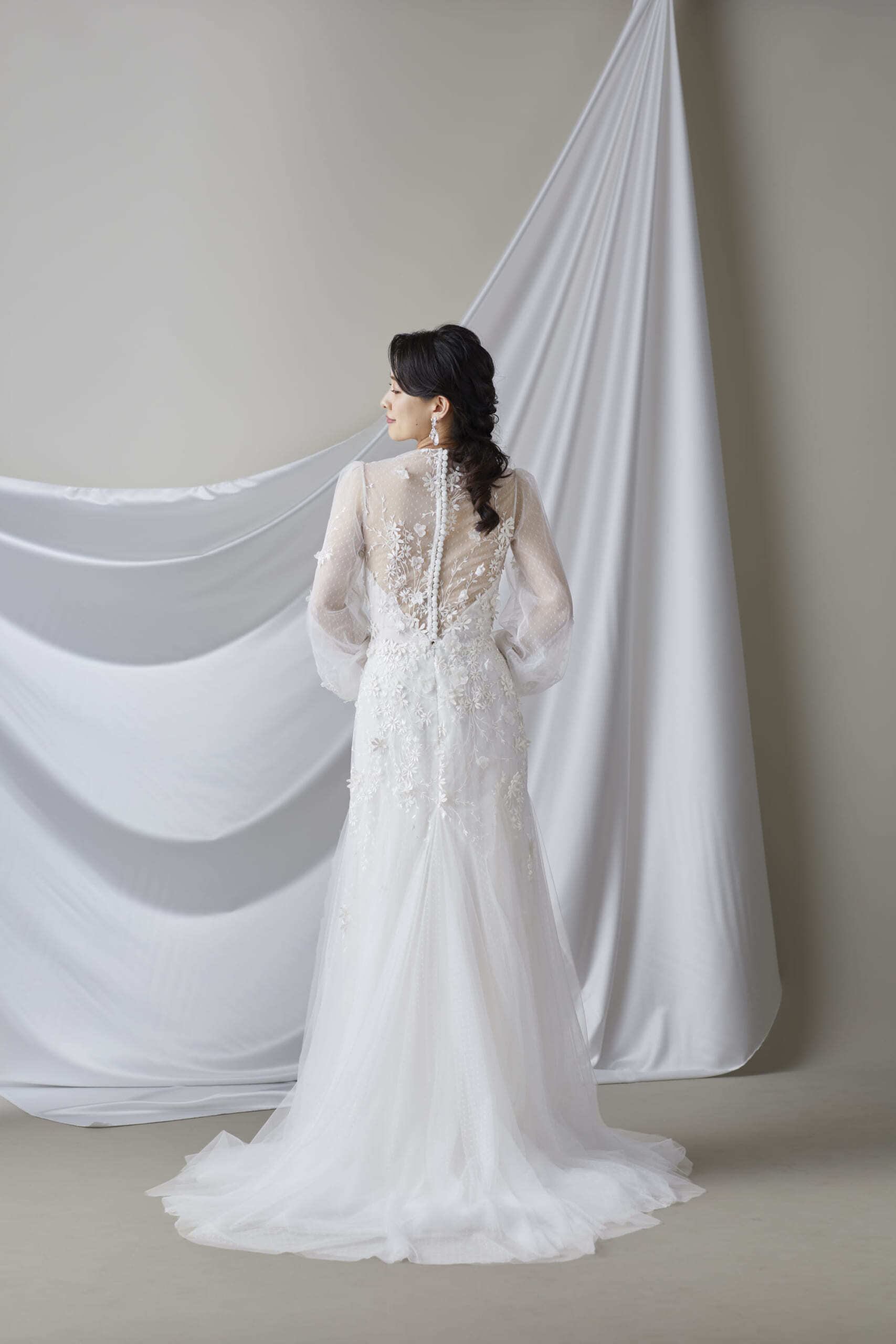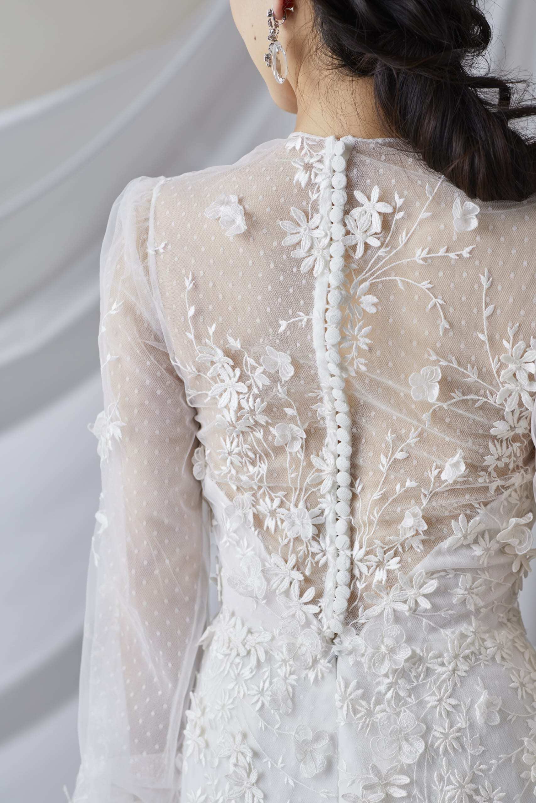 高品質!ウエディングドレス 長袖 上品レース 花柄のモチーフ刺繍 ソフトチュール 花嫁 トレーン 演奏会/音楽会 合コン パーティードレス