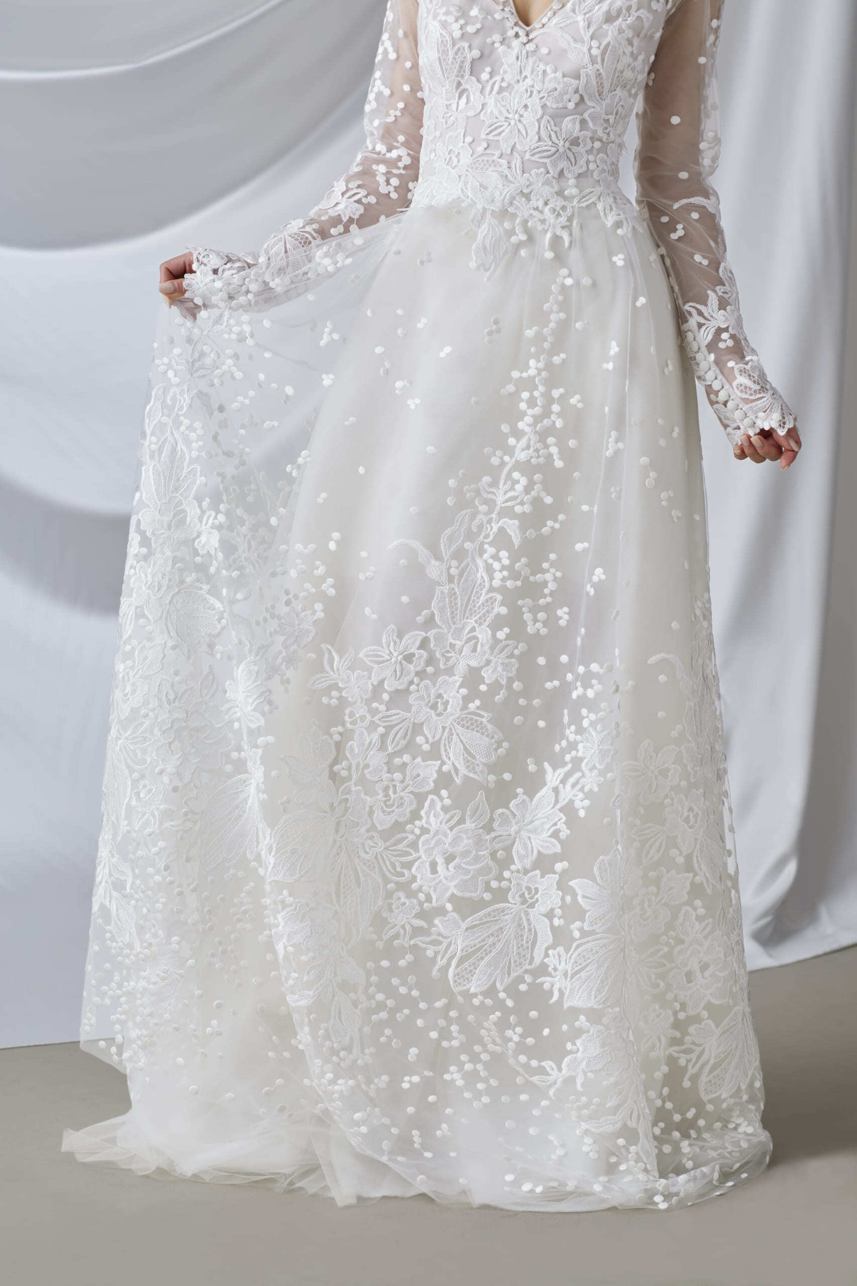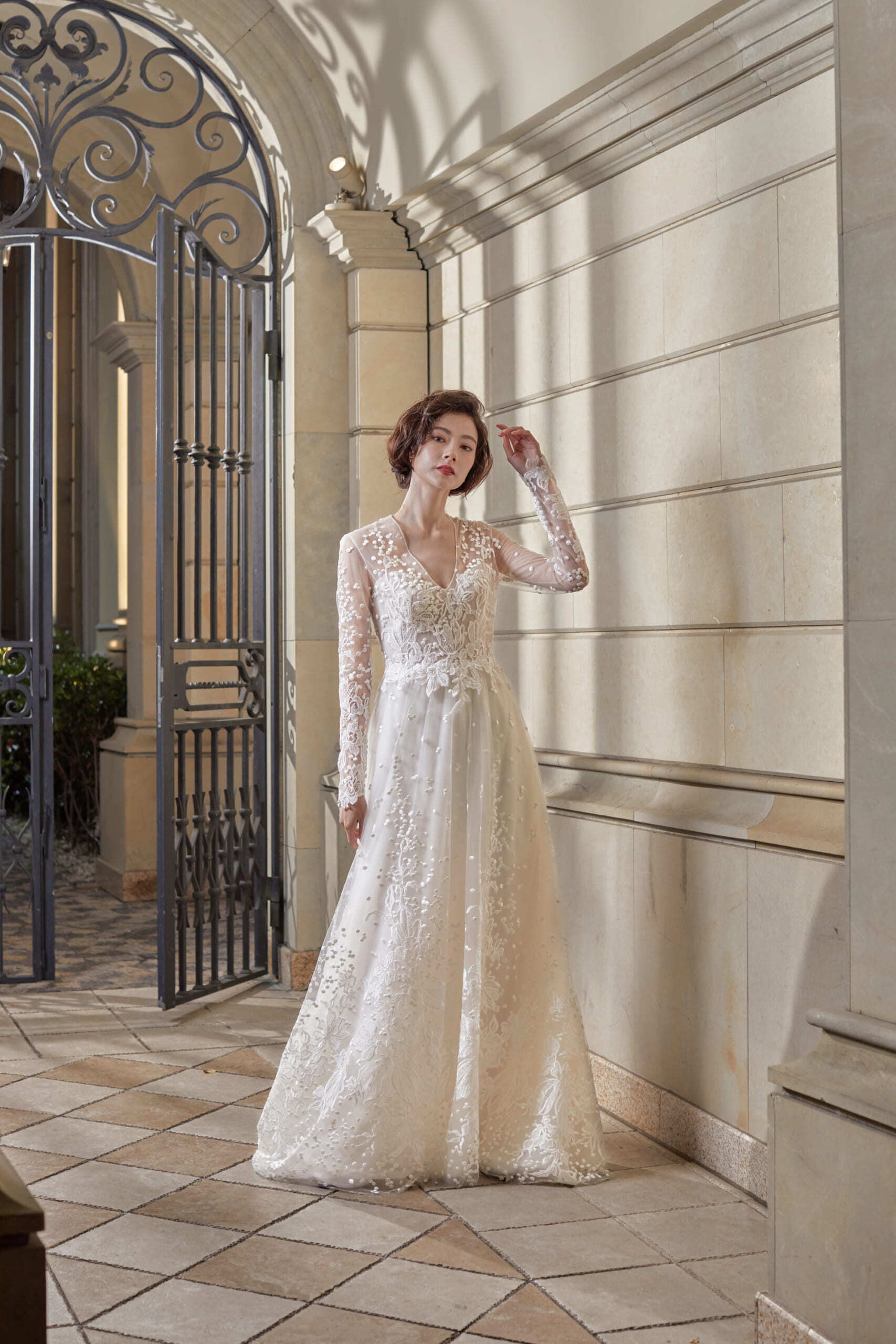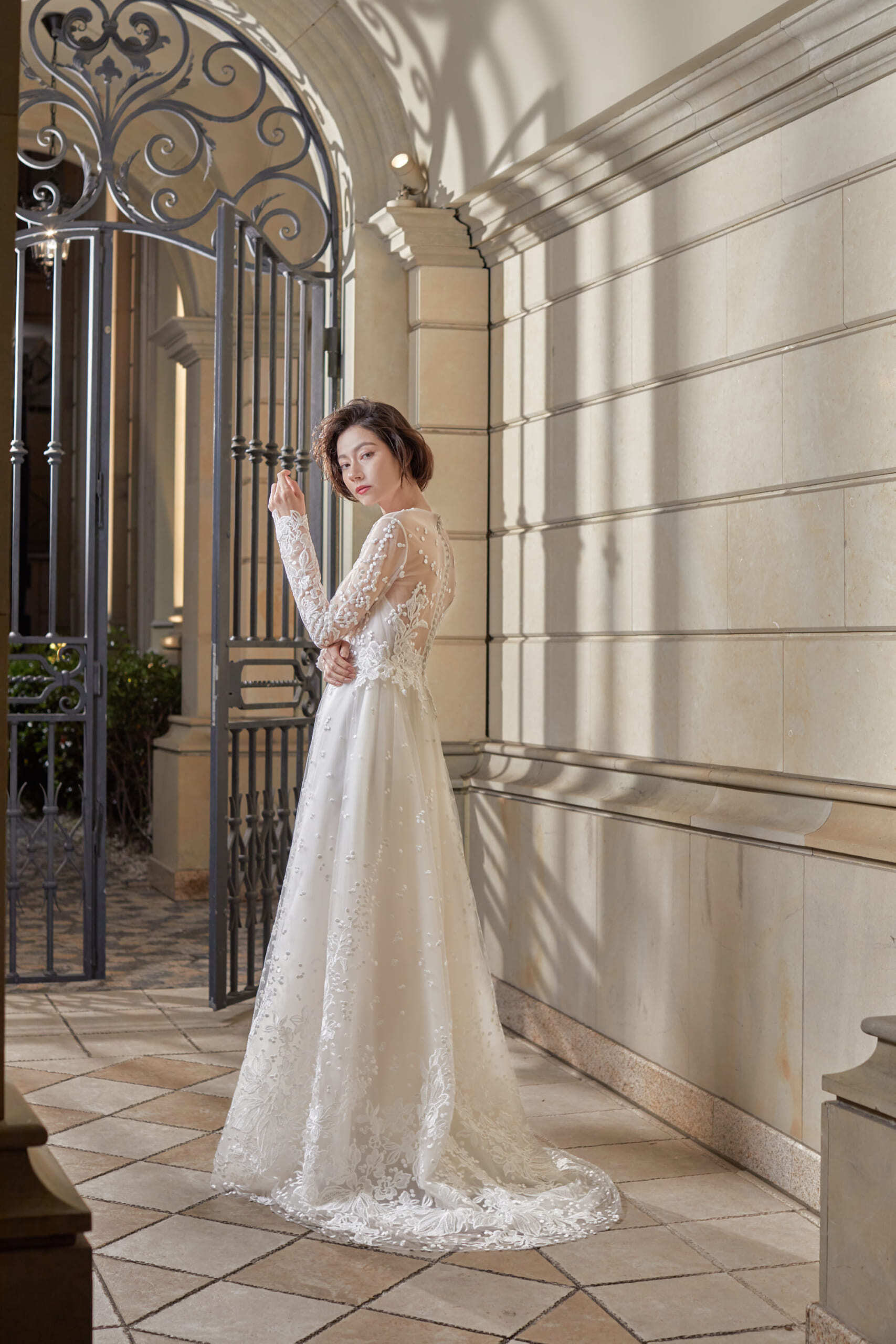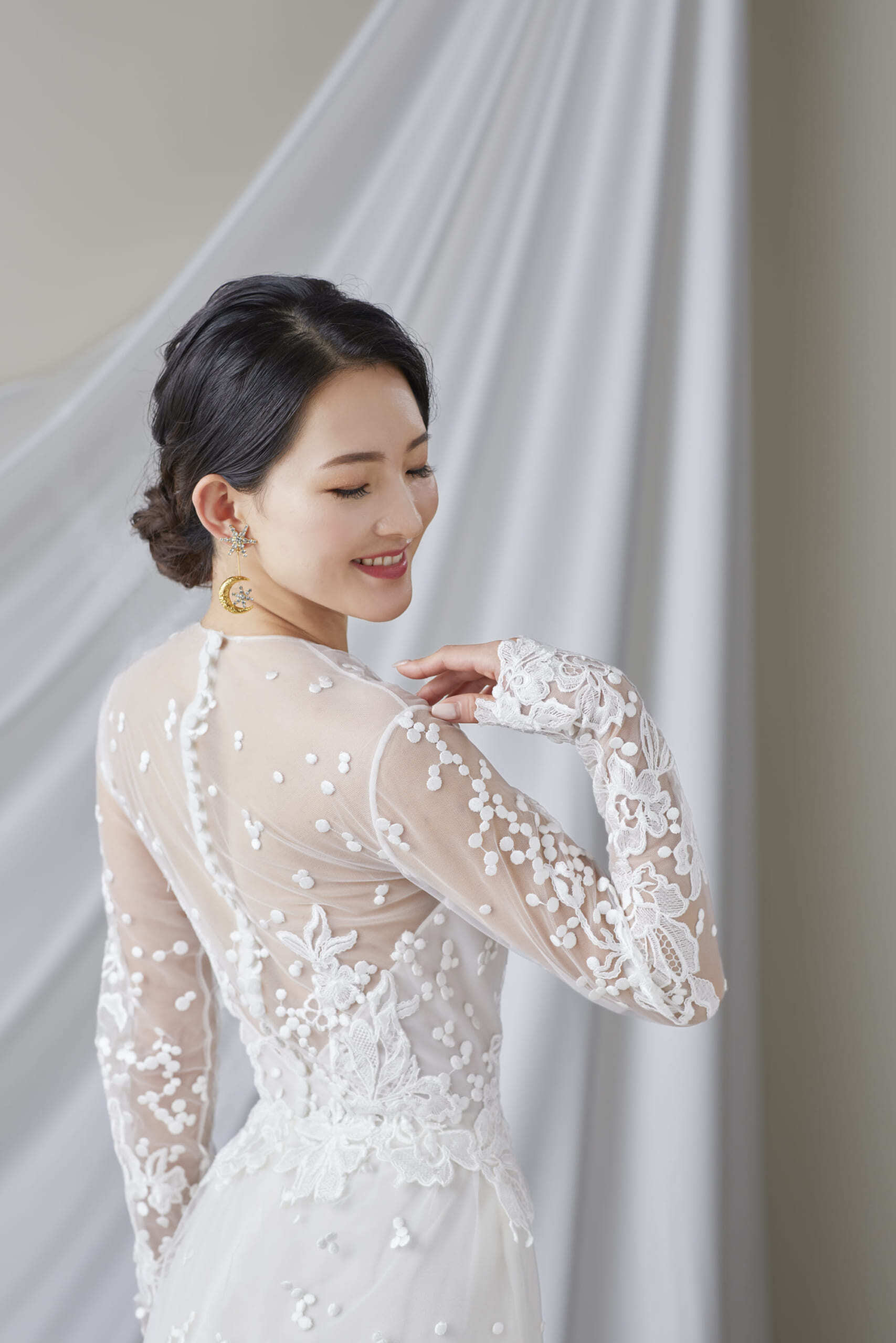 高品質!ウエディングドレス 長袖 上品レース 花柄のモチーフ刺繍 ソフトチュール 花嫁 トレーン 演奏会/音楽会 合コン パーティードレス