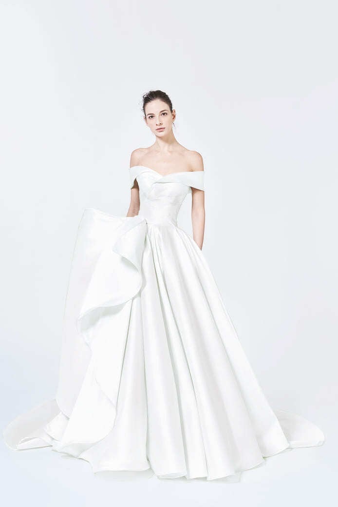 送料無料!ウエディングドレス ベアトップ 取り外しリボン かわいい 高級サテン オフショルダー トレーン カラードレス グリーン エレガント 優雅 花嫁 豪華 ハンドメイド オーダードレス 結婚式/前撮り/二次会/2次会/披露宴/演奏会/音楽会 ガーデンウェディング | David1021k Dress(ダヴィドレス)