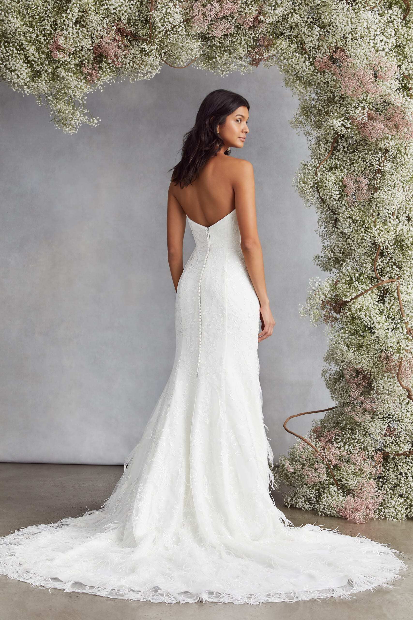 高品質!送料無料!ウエディングドレス ベアトップ 上品レース 花柄のモチーフ刺繍が美しく フェザー かわいい エレガント 優雅 オーダードレス ハンドメイド 花嫁 トレーン 結婚式/前撮り/二次会/2次会/披露宴/演奏会/音楽会 合コン パーティードレス | David1021k Dress(ダヴィドレス)