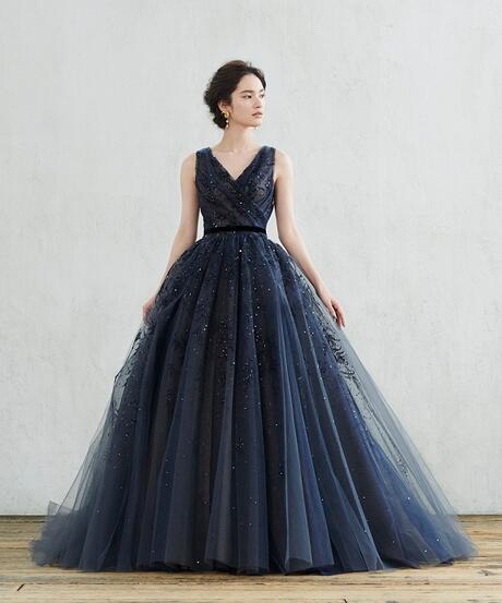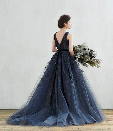 高品質!送料無料!カラードレス ノースリーブ ネイビー色 ブルー キラキラチュール Vネック かわいい エレガント 優雅 オーダードレス ハンドメイド 花嫁 トレーン 結婚式/前撮り/二次会/2次会/披露宴/演奏会/音楽会 合コン パーティードレス | David1021k Dress(ダヴィドレス)