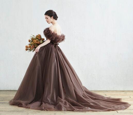 高品質!送料無料!カラードレス ブラウン オフショルダー かわいい ソフトチュール エレガント 優雅 オーダードレス ハンドメイド 花嫁 トレーン 結婚式/前撮り/二次会/2次会/披露宴/演奏会/音楽会 合コン パーティードレス | David1021k Dress(ダヴィドレス)